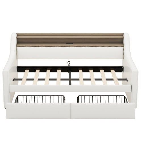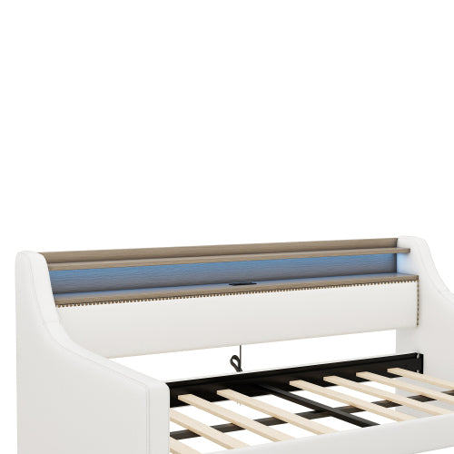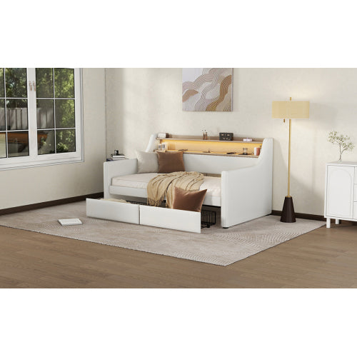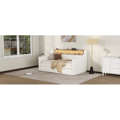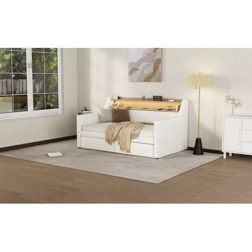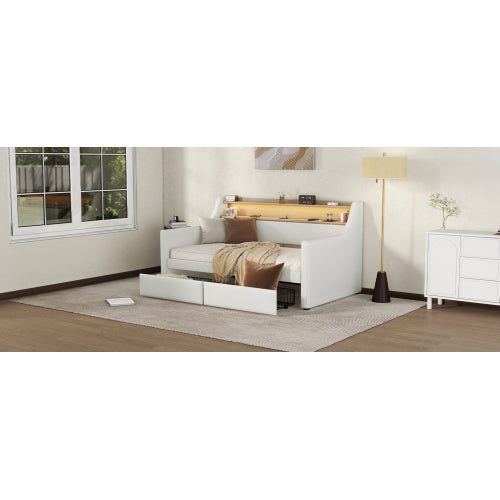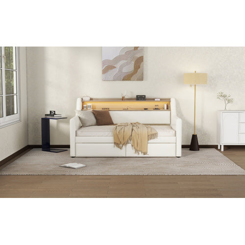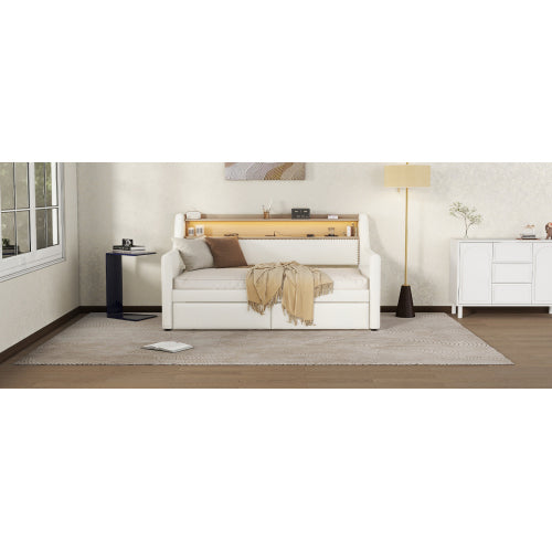 [SEO Keywords/Tags (Backend use)]: Twin daybed, upholstered daybed, white twin bed, daybed with drawers, charging station bed, LED lights bed frame, guest bed, small space furniture, PU leather daybed, modern twin bed frame.