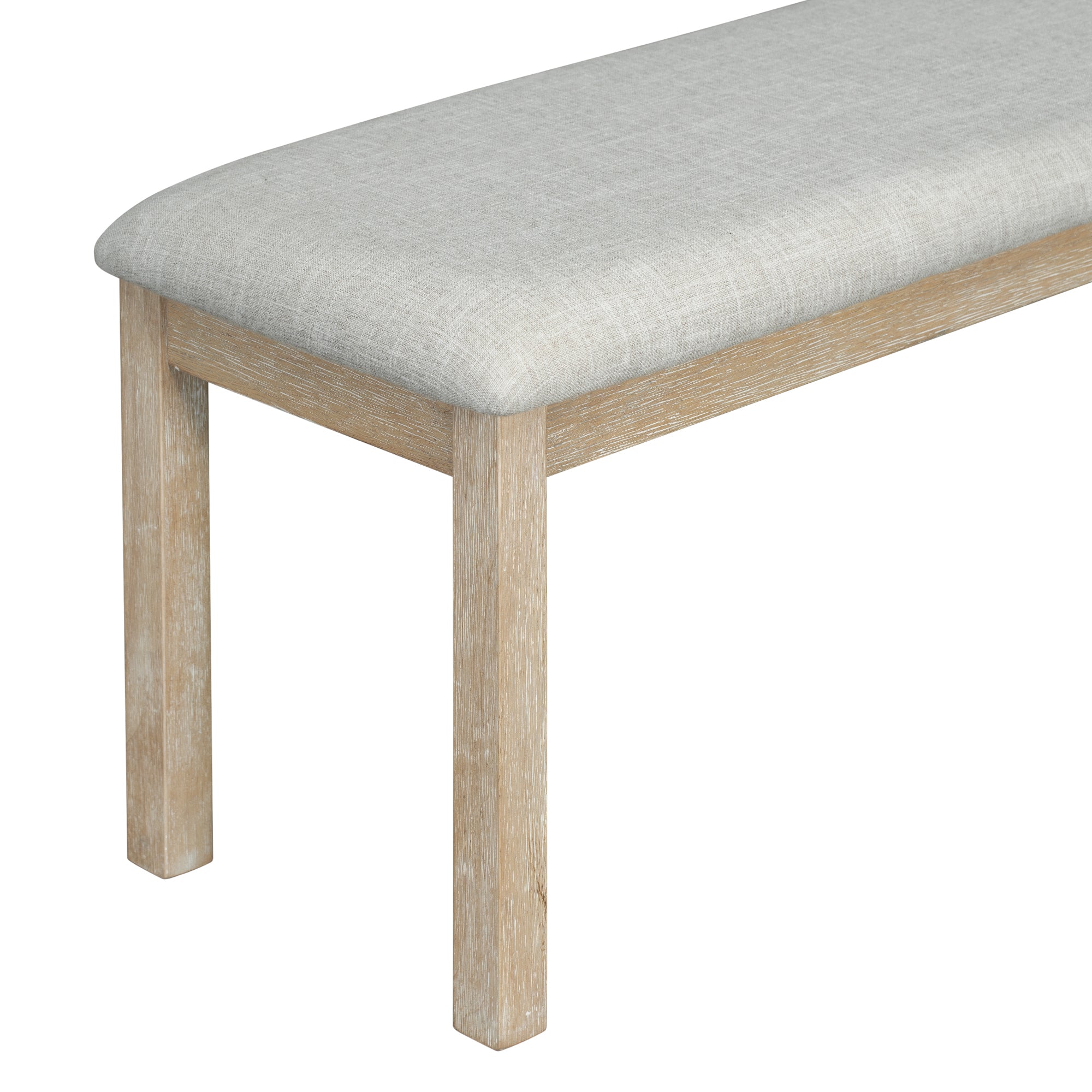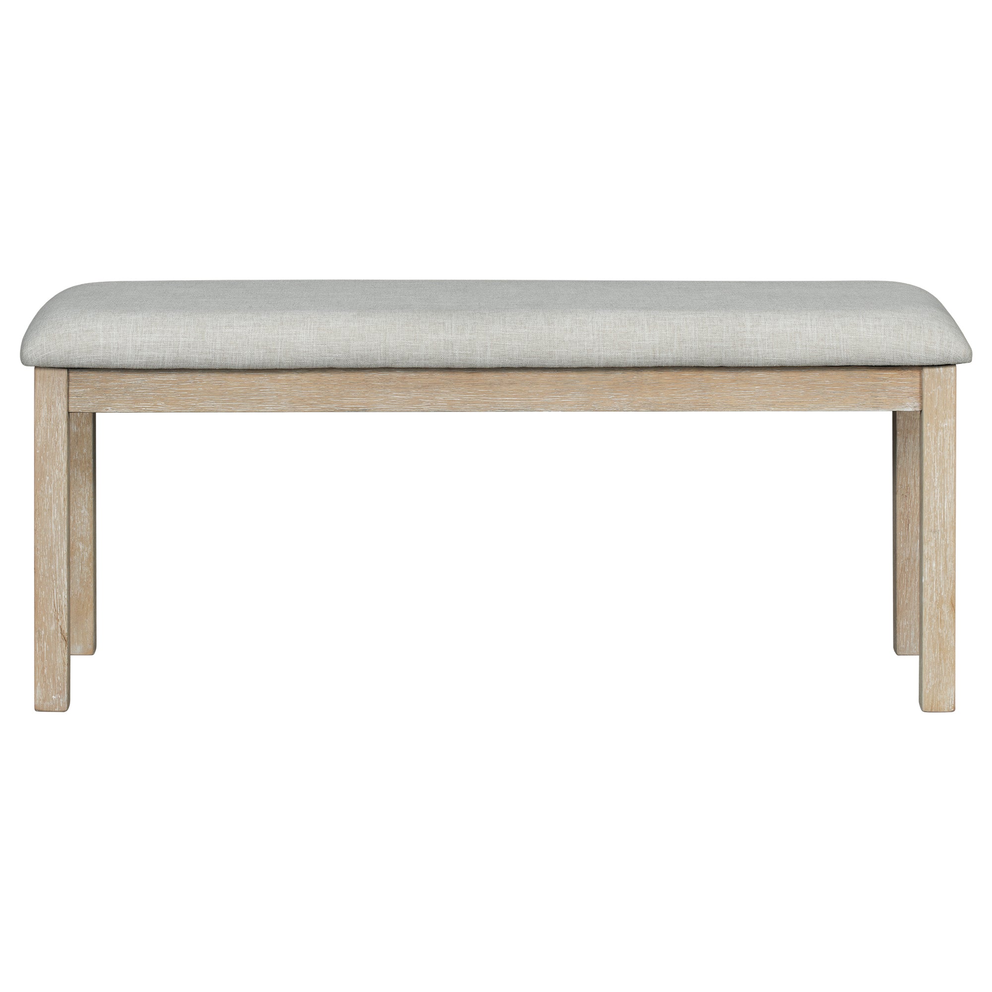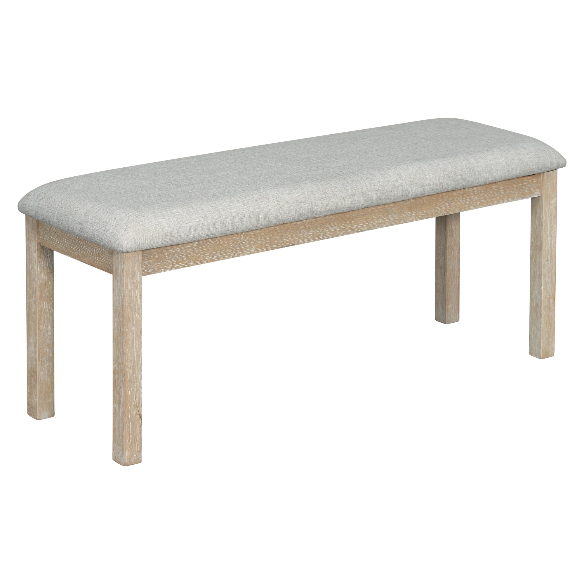 - Selected Materials: The tabletop of this dining table set adopts MDF board and solid wood veneer, and the legs of the table is made of rubber wood. The frame of four chairs and the bench is manufactured of rubber wood as well to ensure adequate load-bearing capacity. In addition, the 65mm cushion seats of four chairs and the bench can offer comfort using experience.