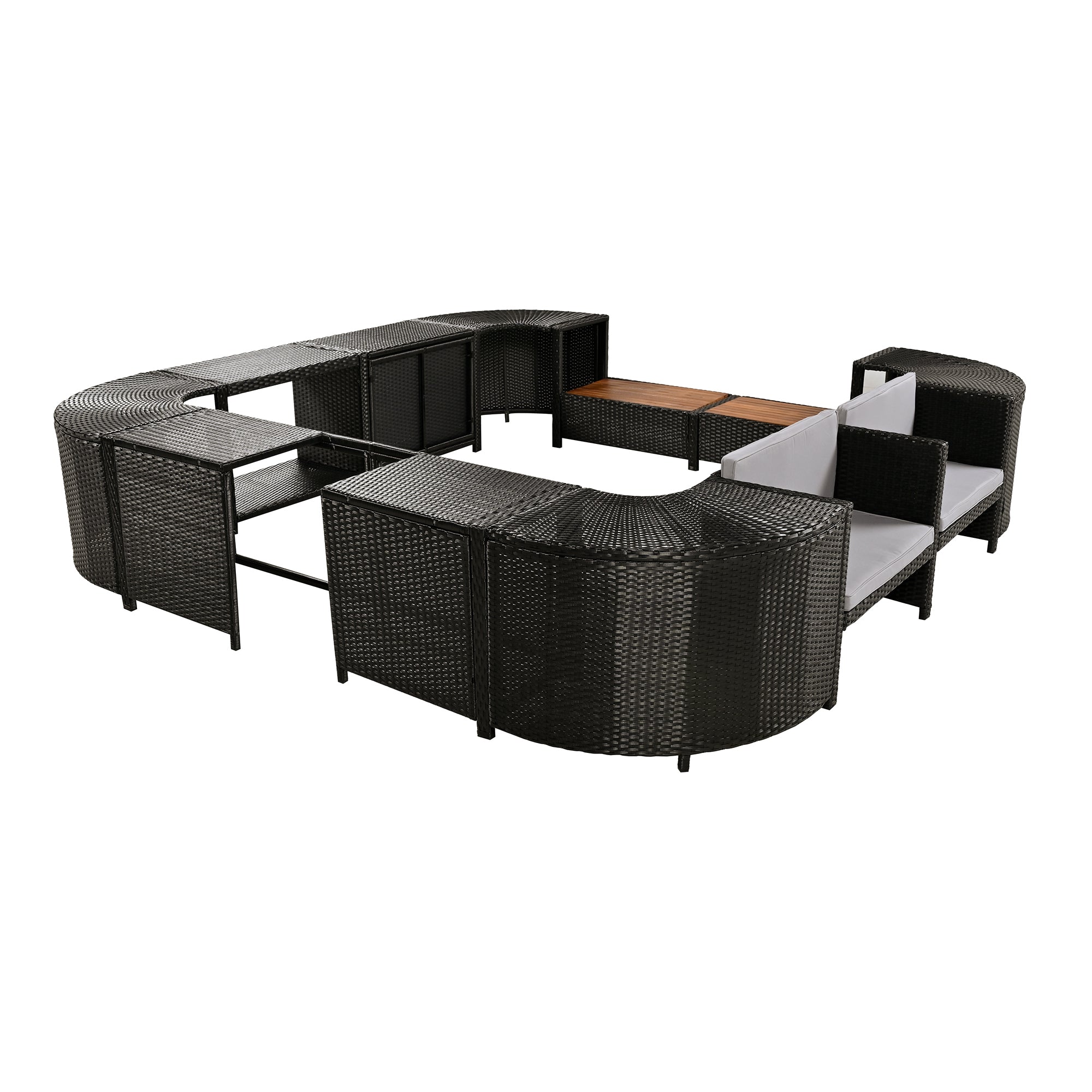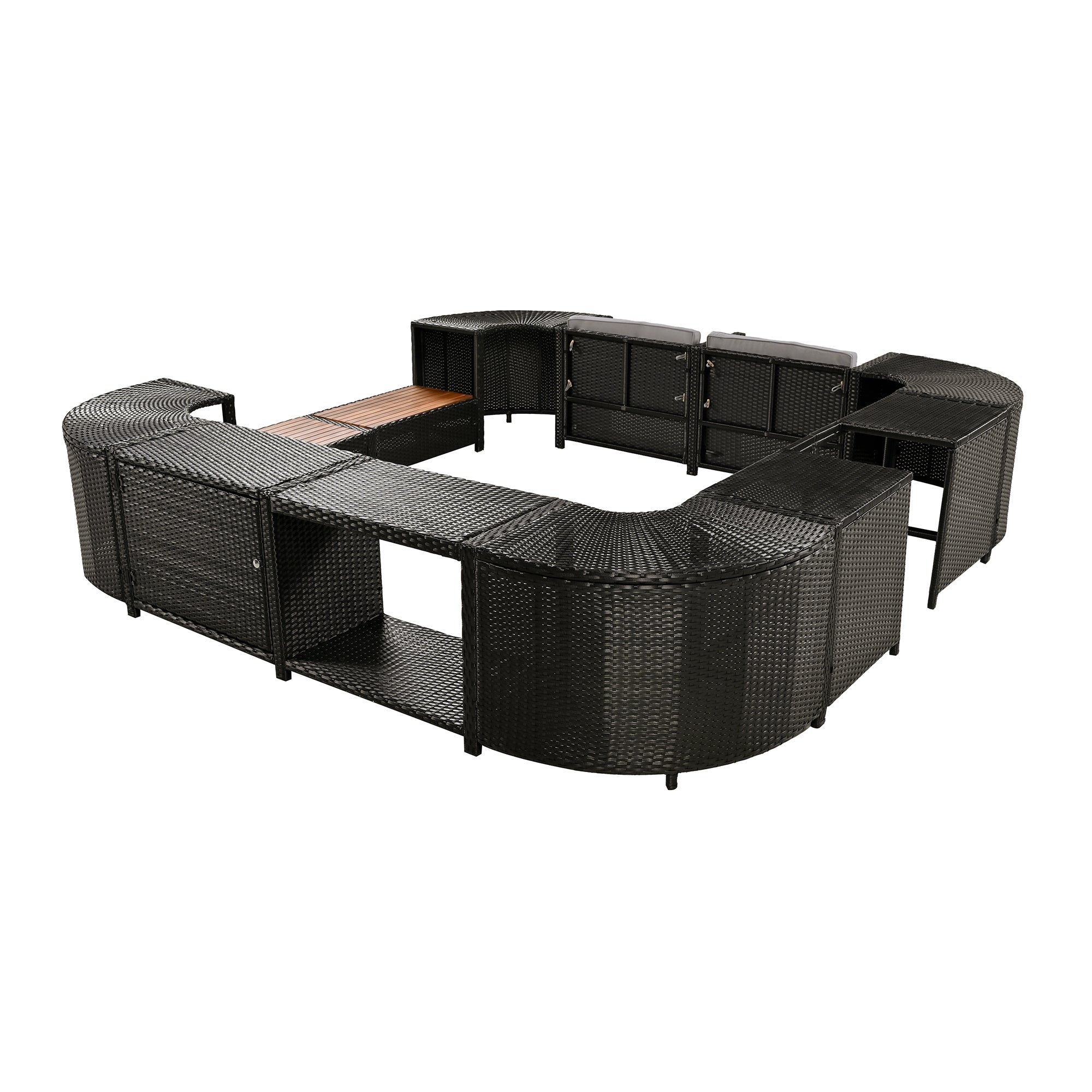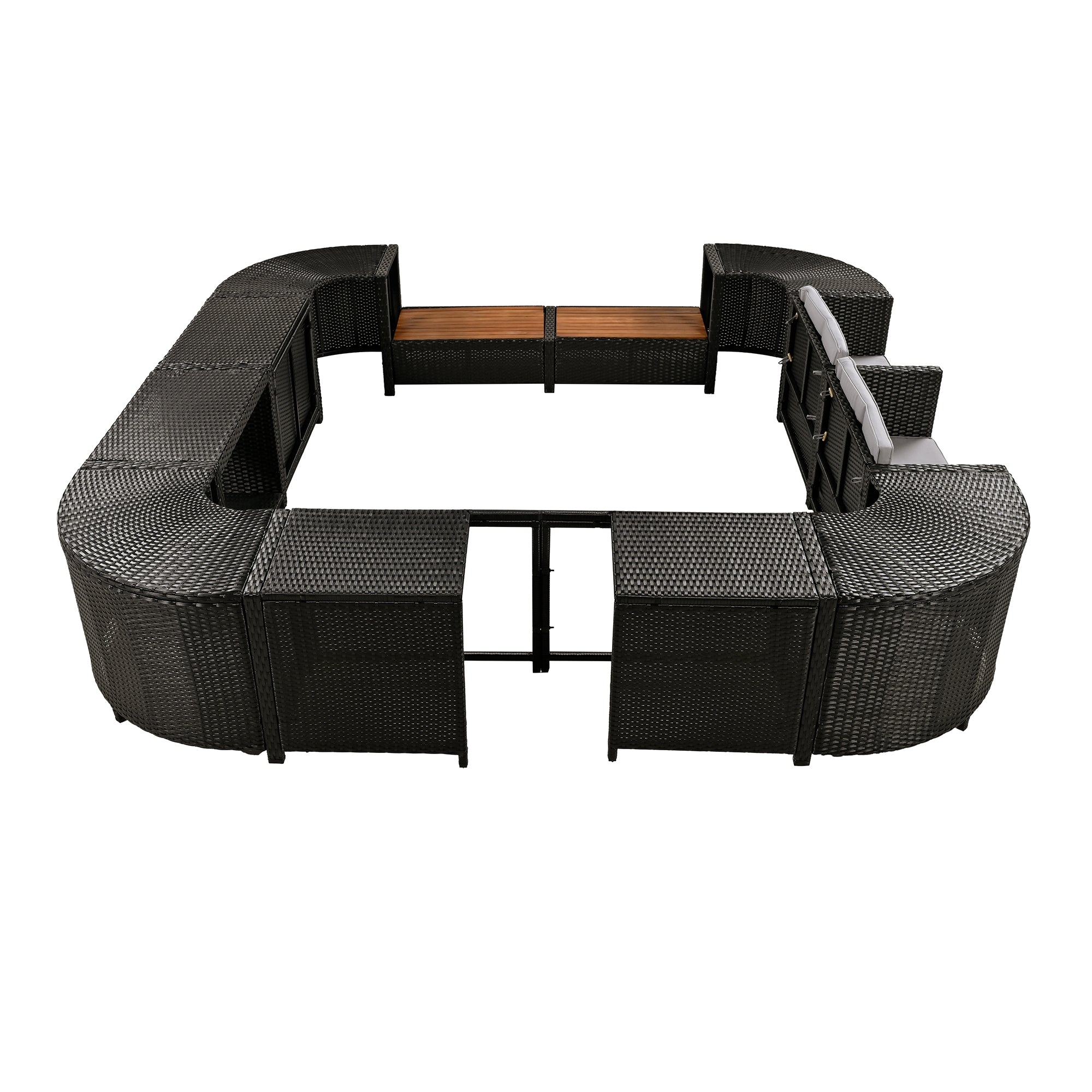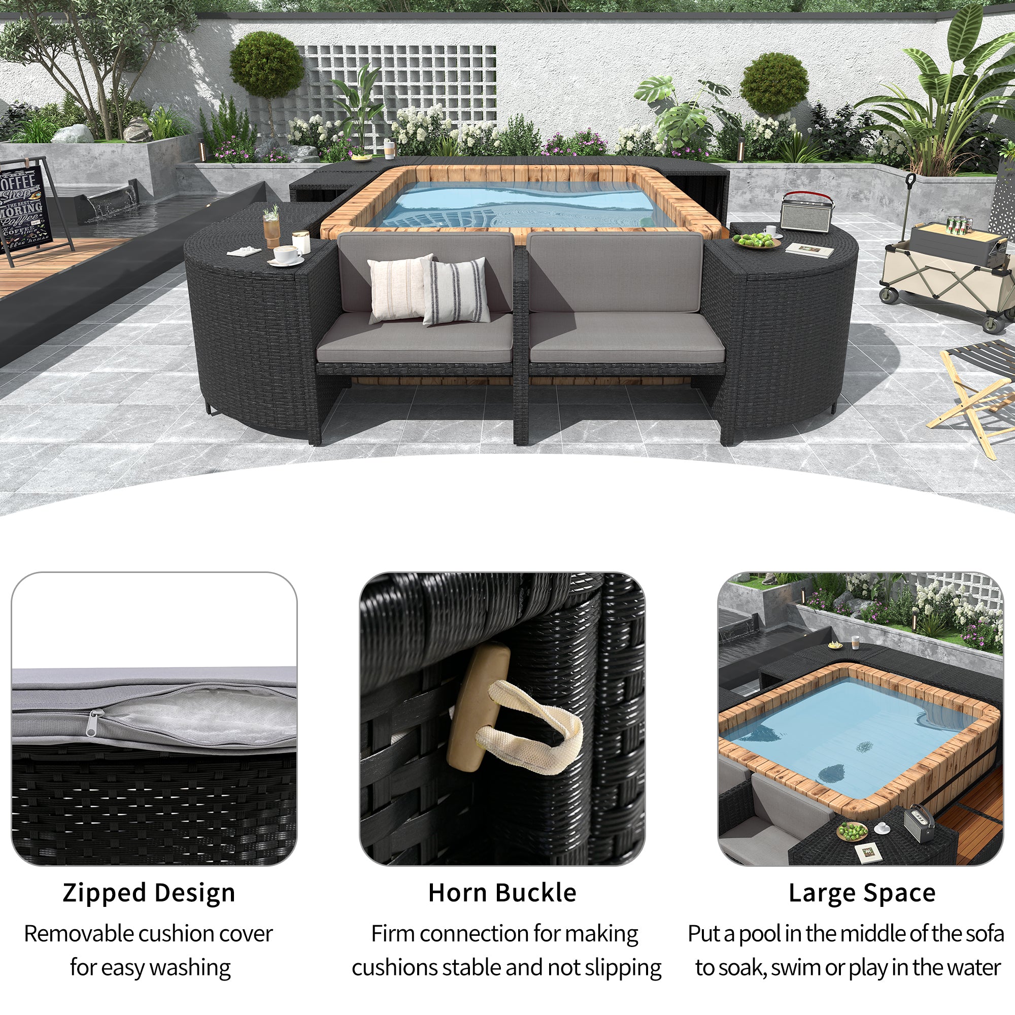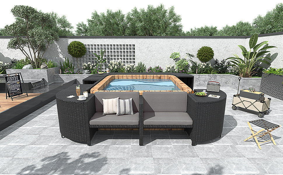 Spa Surround Spa Frame Quadrilateral Outdoor Rattan Sectional Sofa Set with Mini Sofa, Wooden Seats and Storage Spaces, Grey