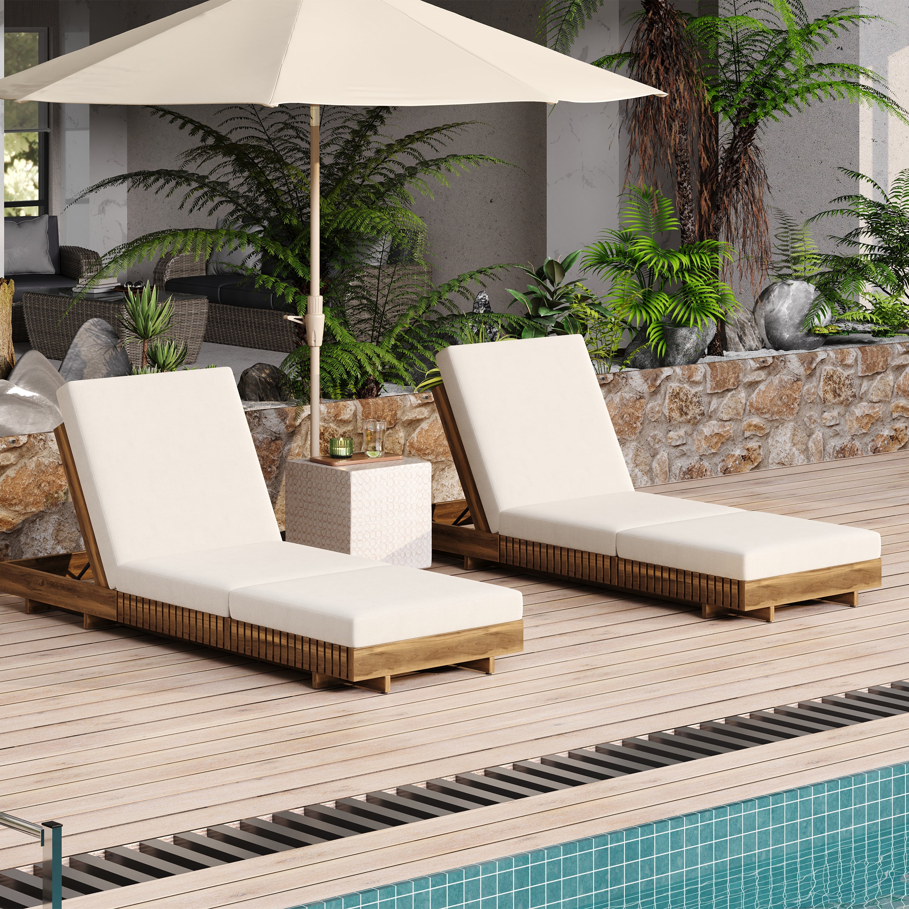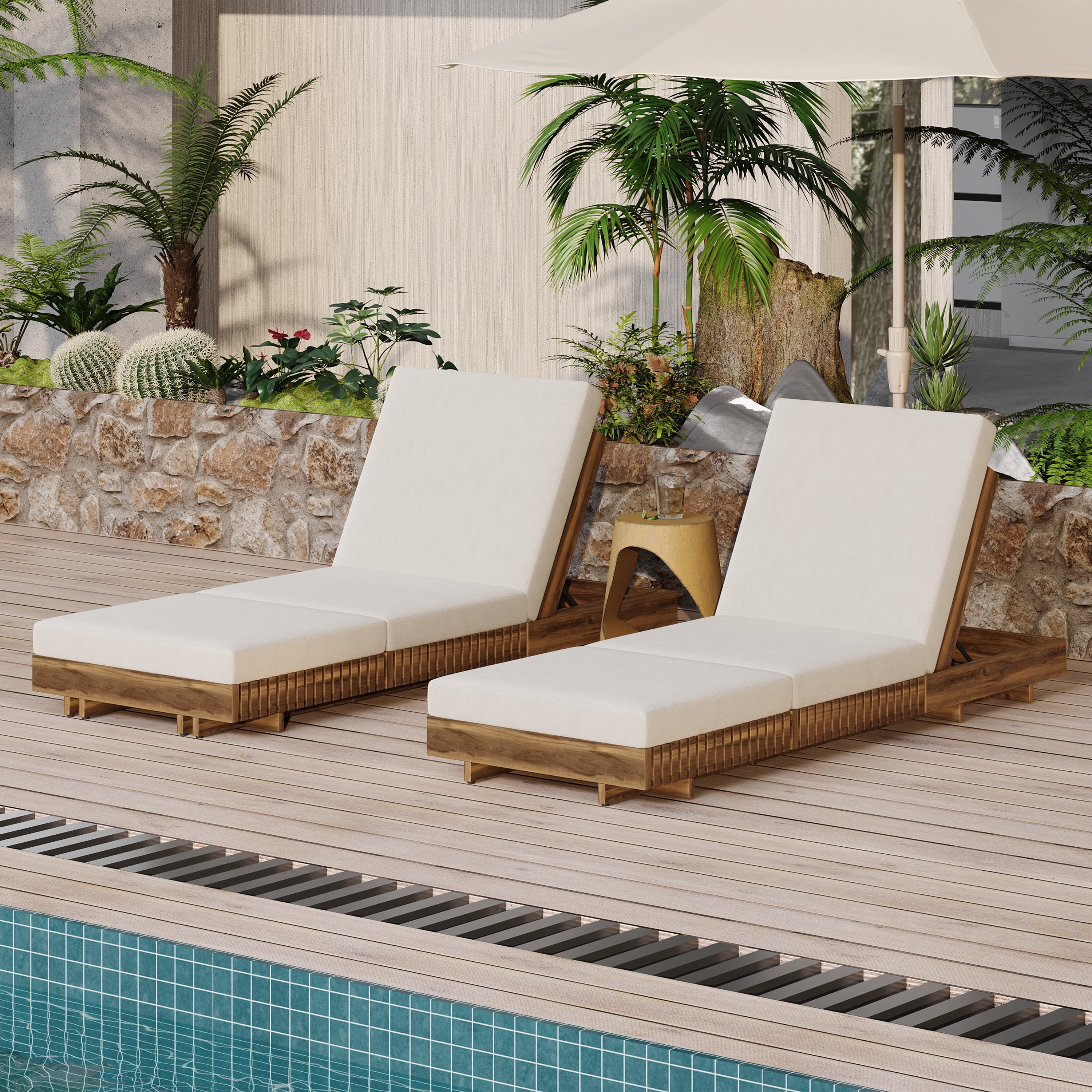 acacia wood chaise lounge set, 2-piece lounge chairs, outdoor wooden recliner, cream cushion lounger, adjustable patio chaise, folding cushion chair, poolside lounge set, garden furniture, triple fold cushion chaise, outdoor relaxation set