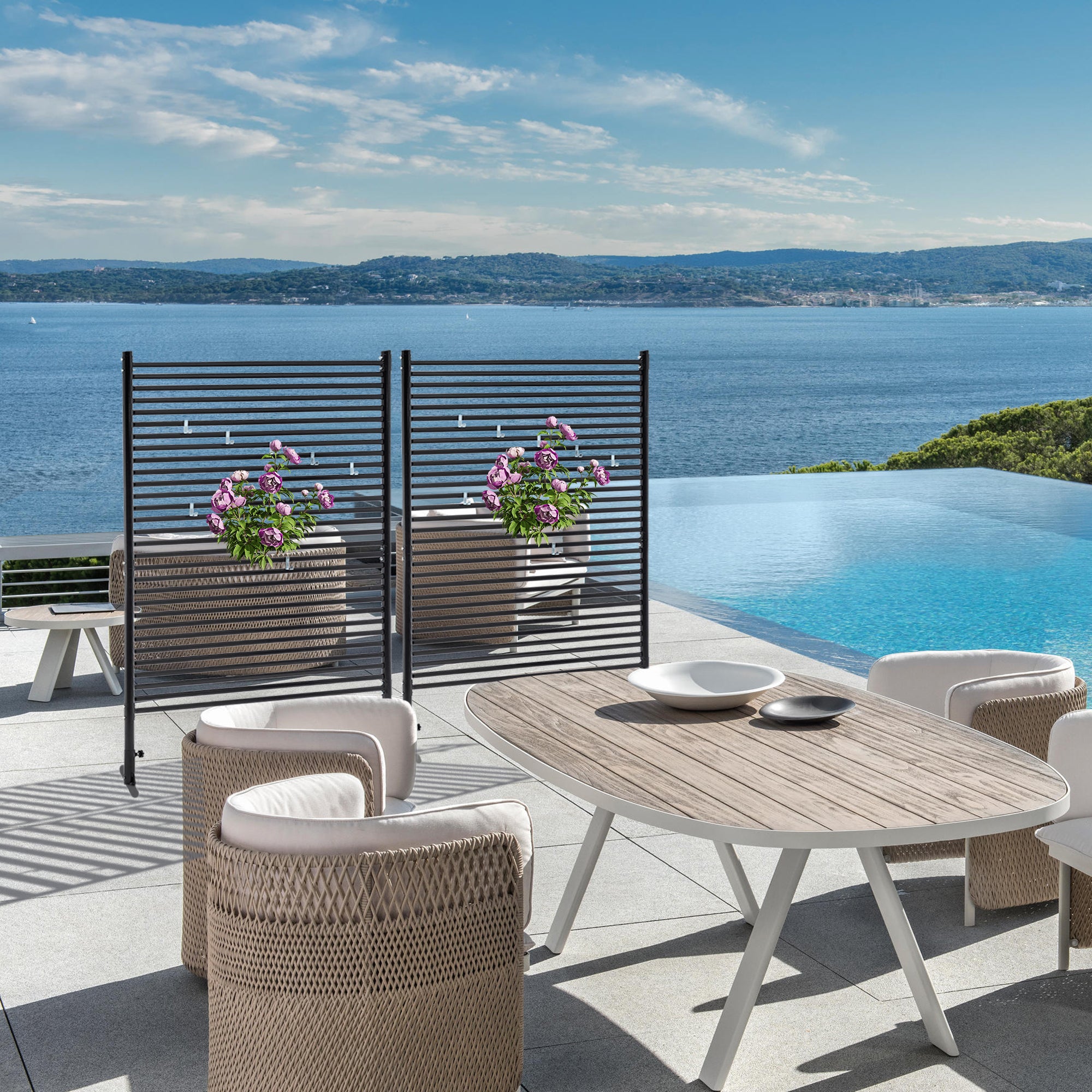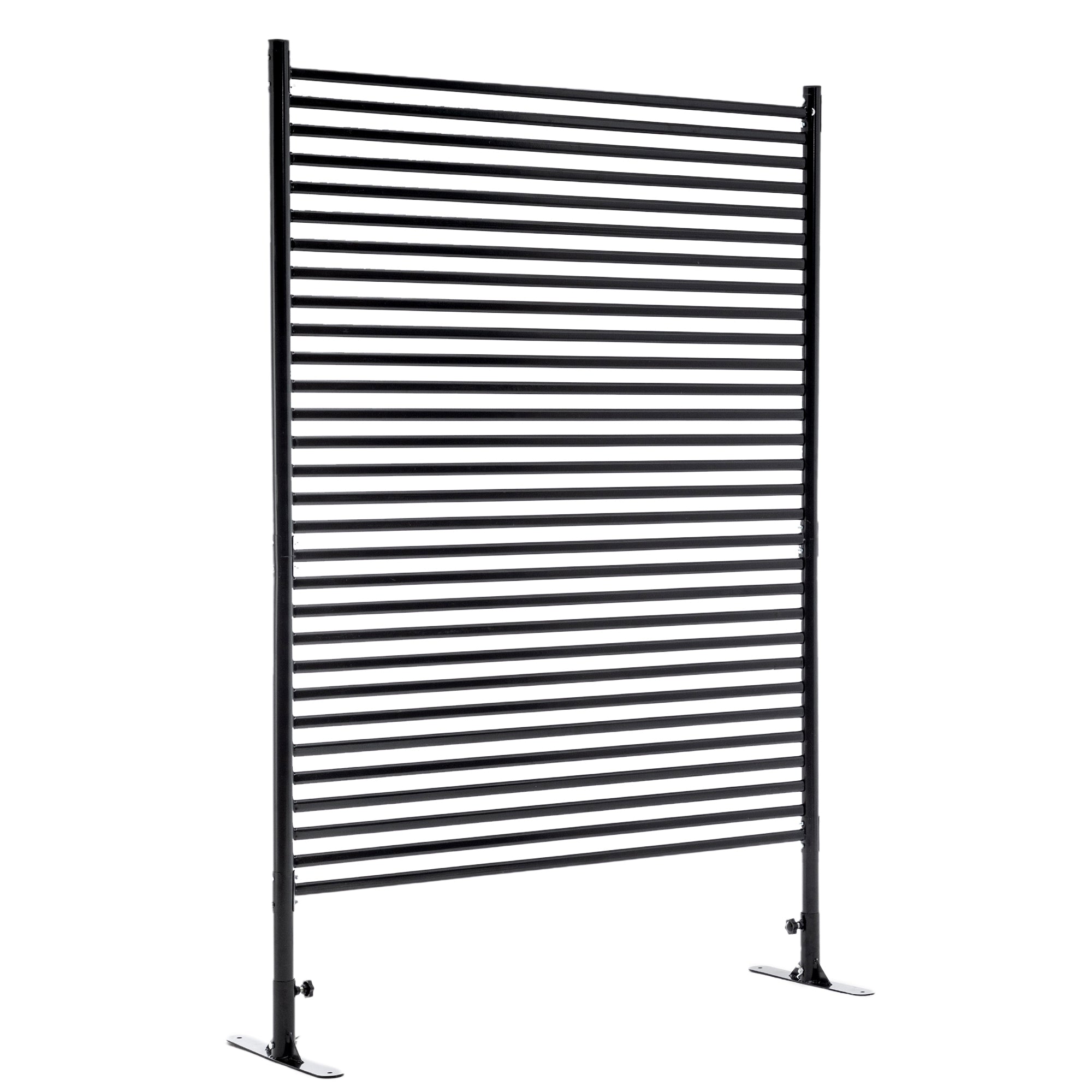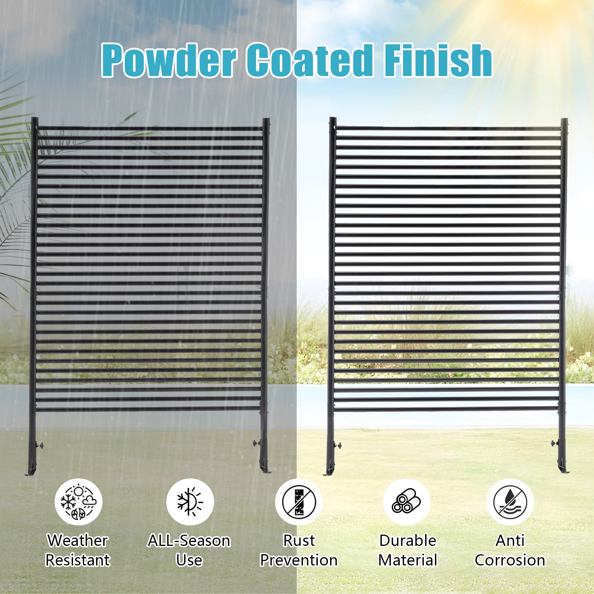 Product Description: Create a private and stylish outdoor space with these 71.26''x46.65'' Outdoor Privacy Screens. Crafted from durable metal, these freestanding privacy fence panels offer a modern slatted design that provides both seclusion and visual appeal. Ideal for patios, gardens, balconies, or any outdoor area, these privacy screens are designed to withstand the elements while enhancing your space. The black finish complements various outdoor decors, while the sturdy stand ensures stability and easy placement. Whether you need to block out views, create a cozy retreat, or add an elegant touch to your outdoor area, these metal privacy screens are the perfect solution for your needs.
