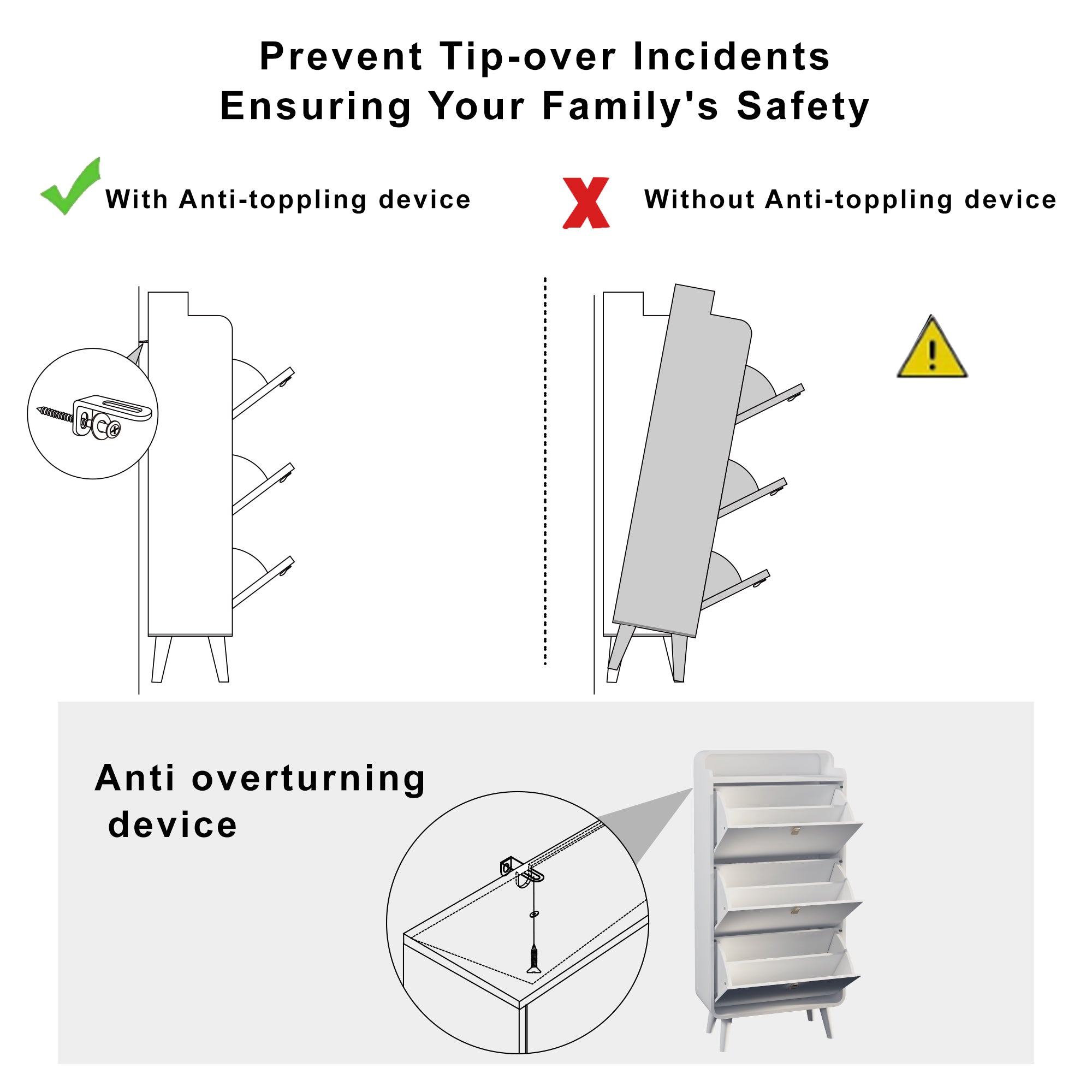 - Anti-tipping Devices: Solid construction shoe cabinet: Crafted from sturdy MDF, this shoe organizer is as solid as they come. And with anti-tip kits for added safety and adjustable feet for uneven floors, it's a piece you can rely on, even with little loved ones around.