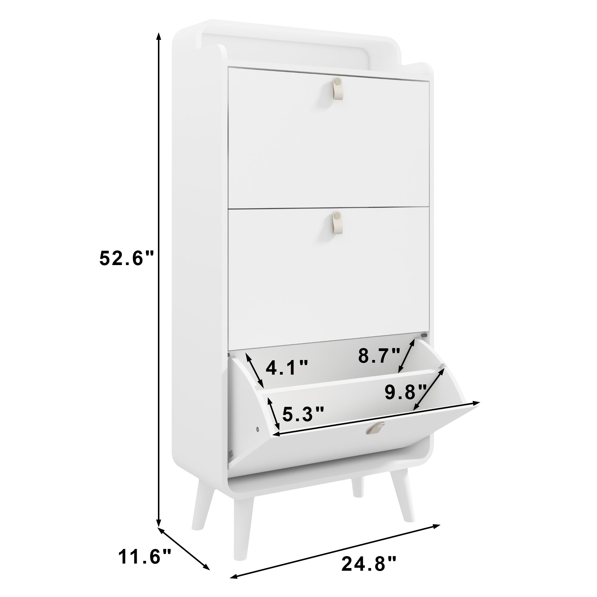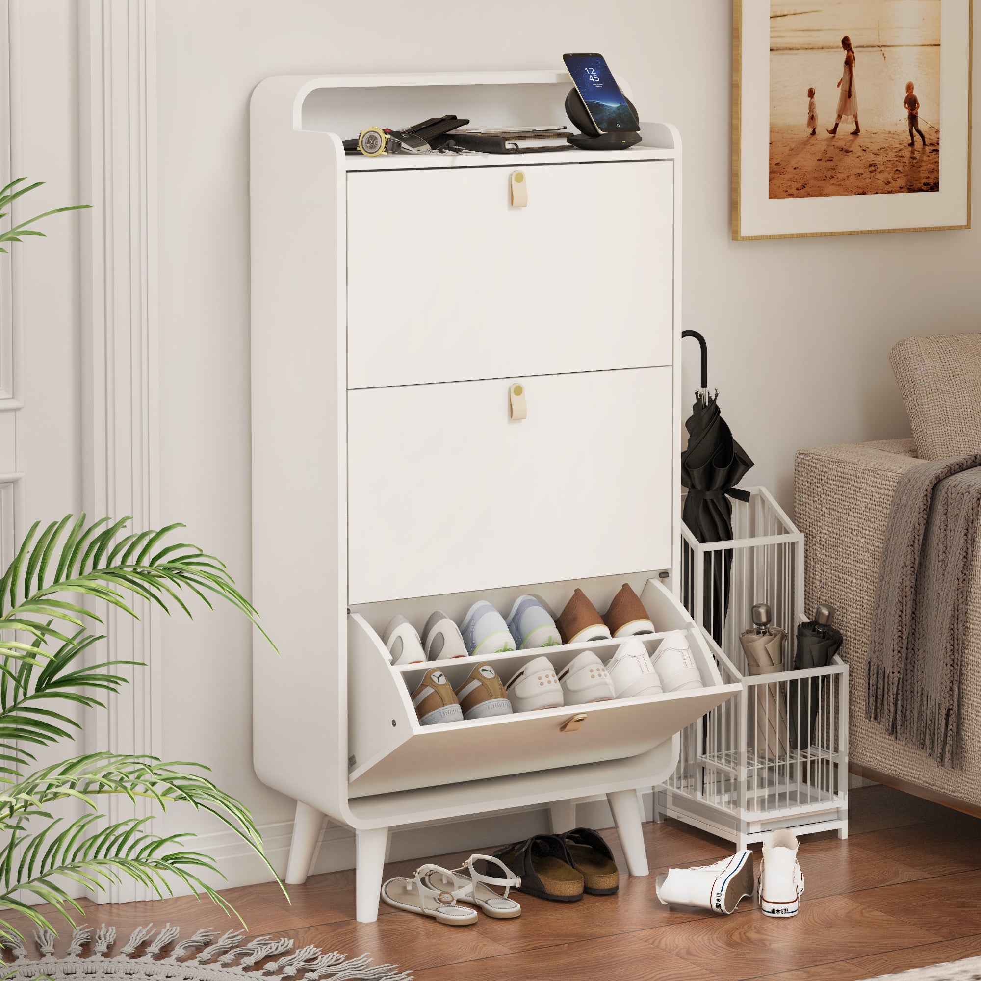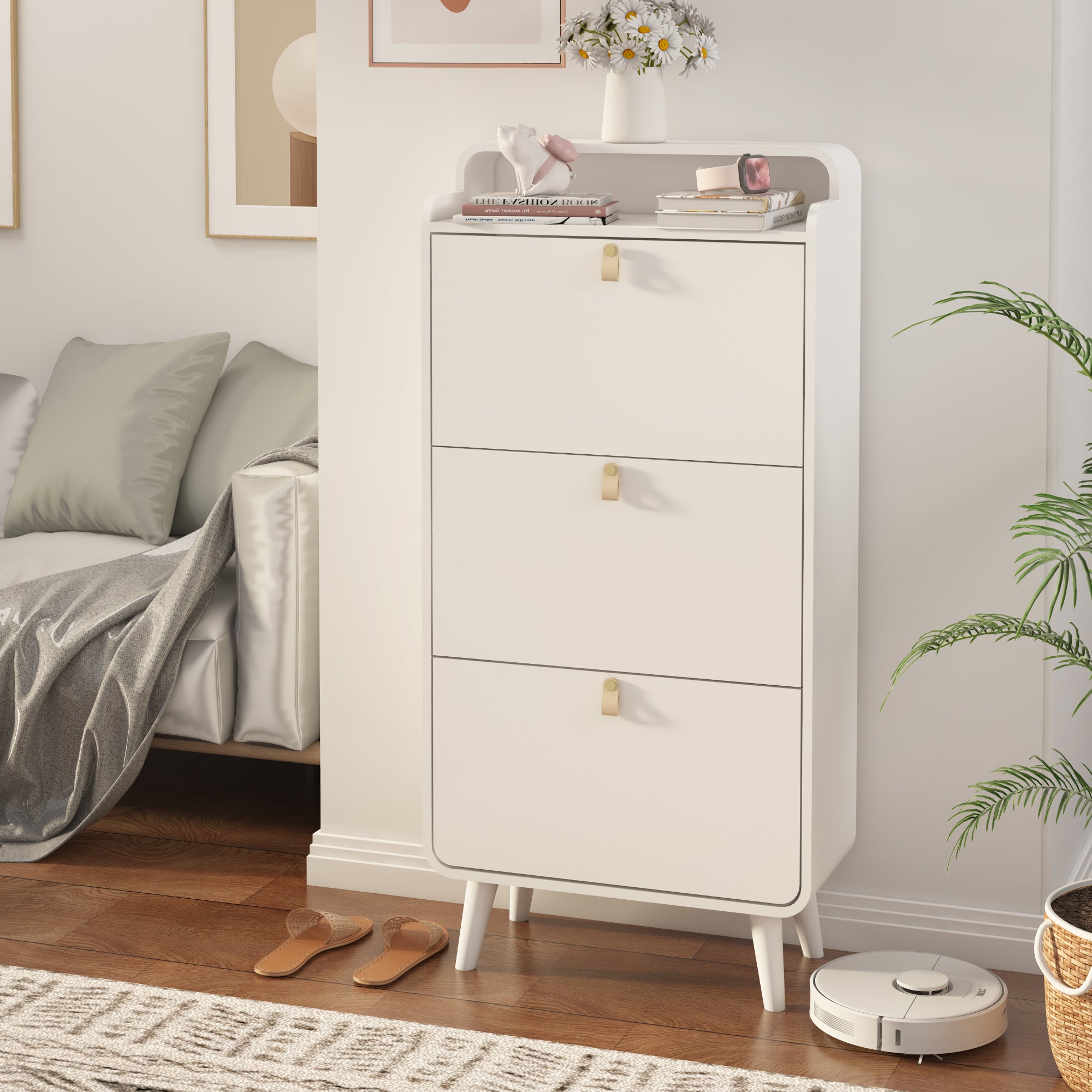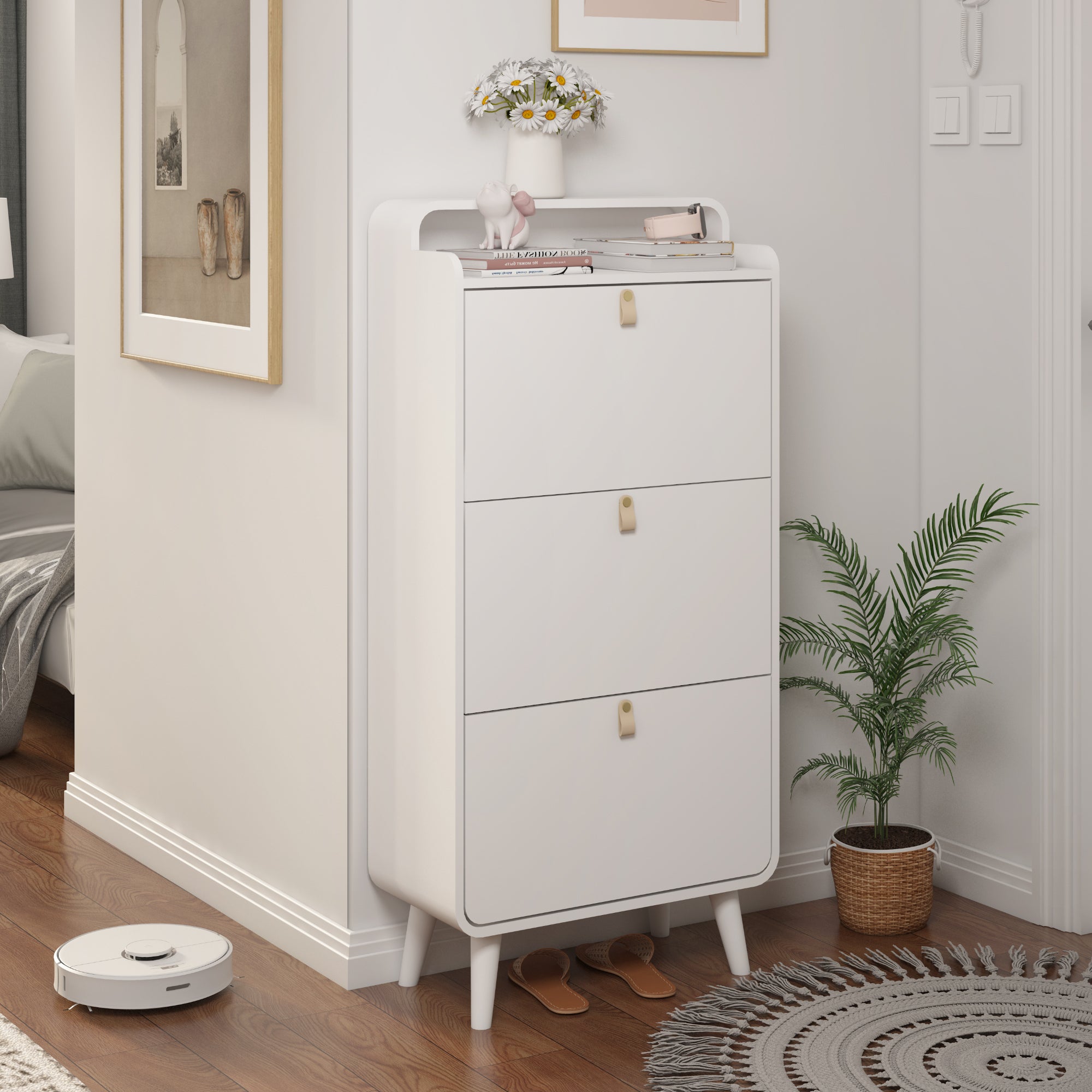 Product Description: Keep your home organized with this stylish Modern Arc Design Shoe Cabinet. Featuring a sleek white finish and elegant arc-shaped accents, this shoe storage cabinet is a perfect blend of style and function. The three spacious flip-down drawers provide a space-saving solution to neatly store multiple pairs of shoes. Designed specifically for an entryway or hallway, this cabinet helps eliminate clutter and creates a welcoming first impression.