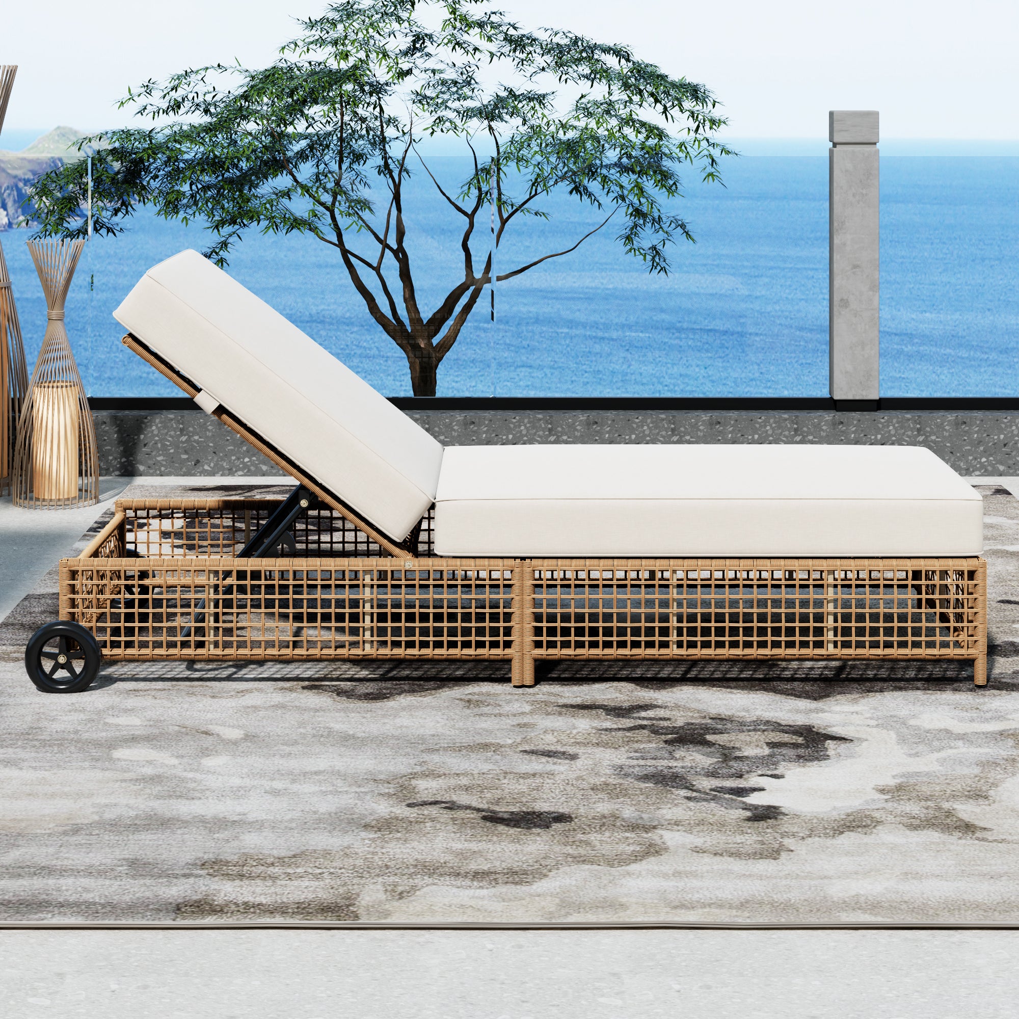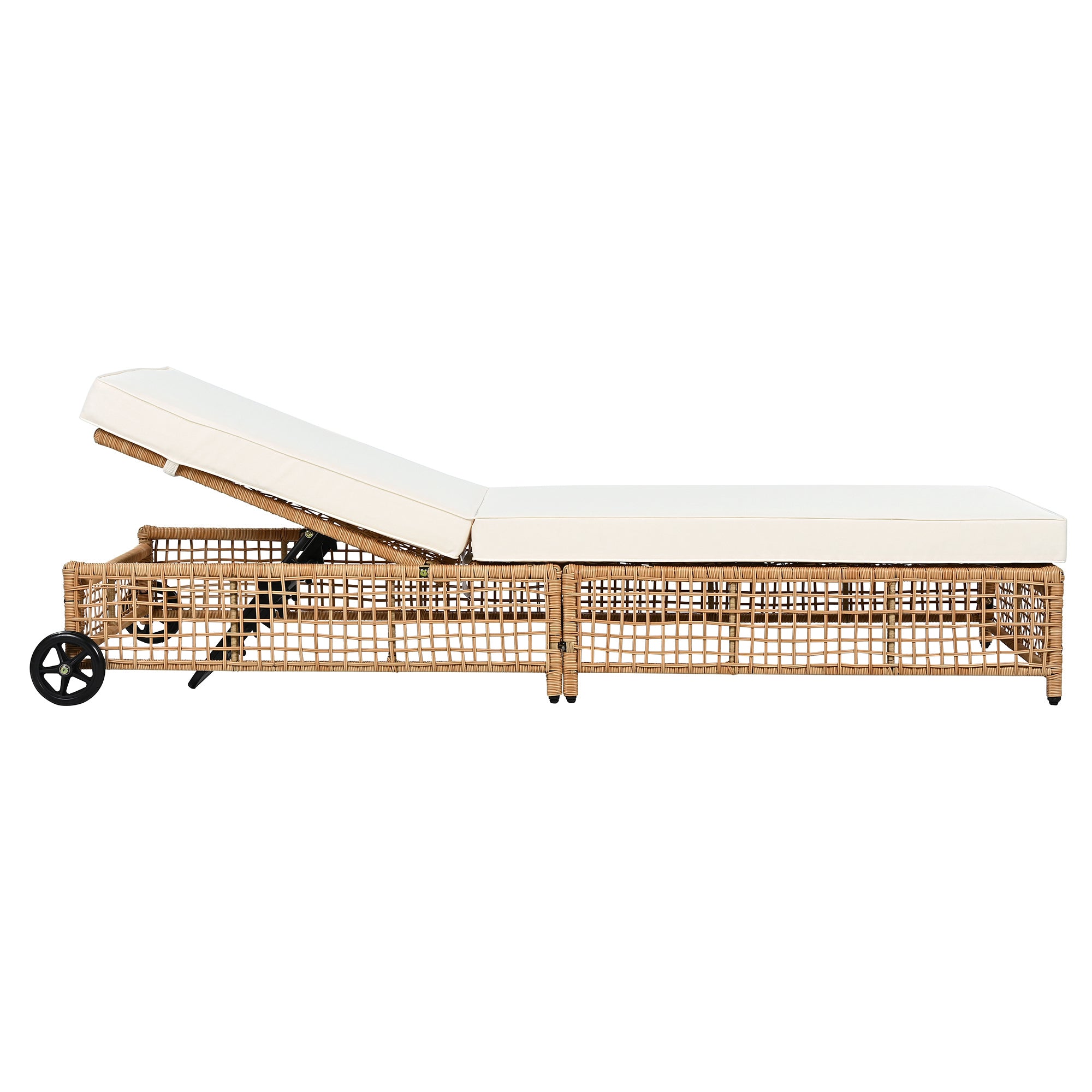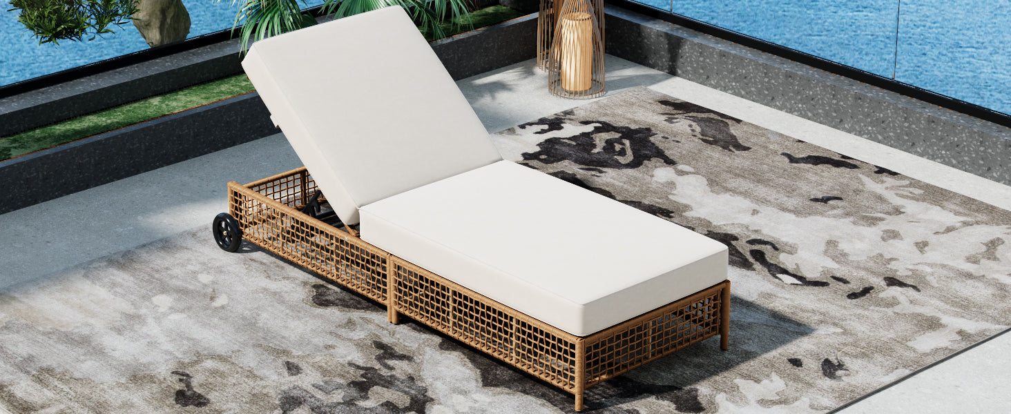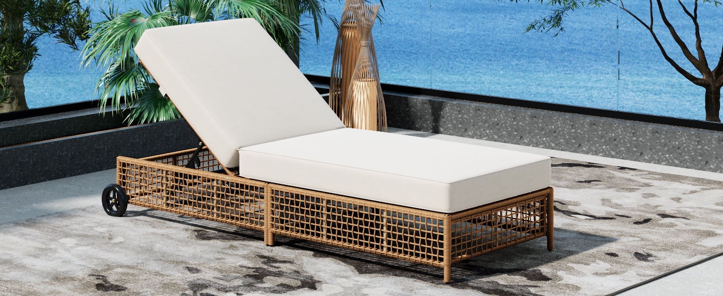 The natural rattan wicker frame adds a touch of elegance to any outdoor space, while the beige cushion provides extra comfort for long hours of relaxation. The built-in wheels make it easy to move the lounge chair around, allowing you to effortlessly follow the sun or reposition it wherever you need.