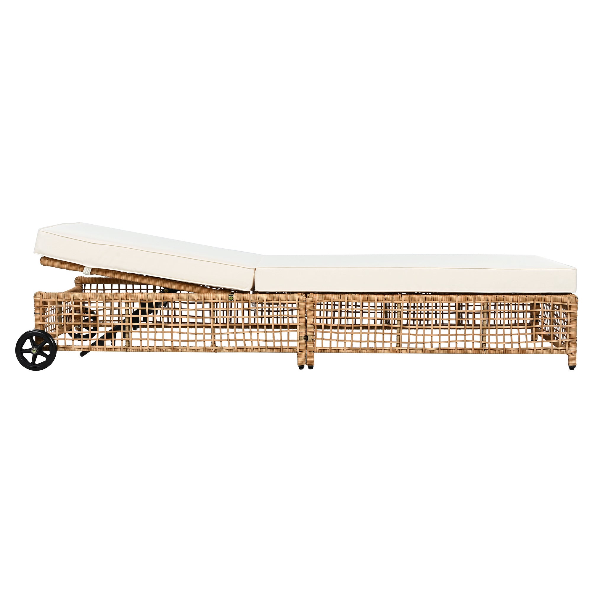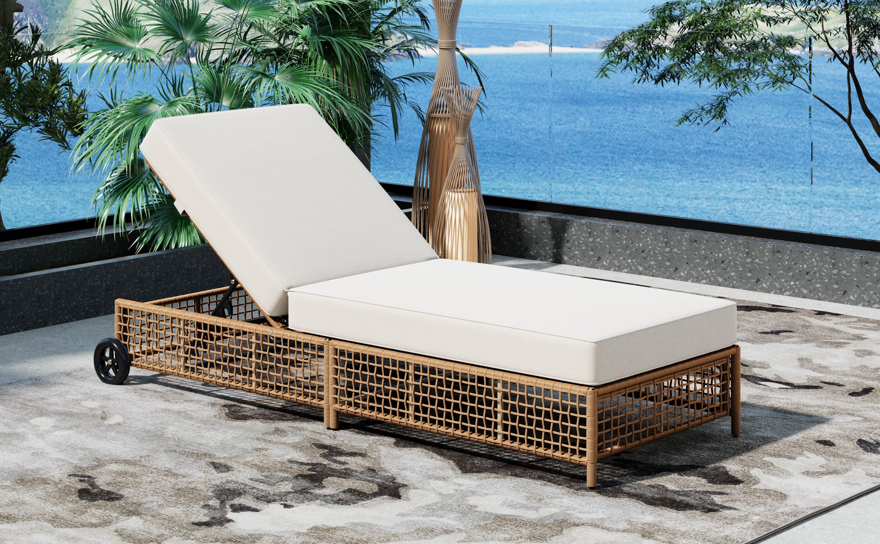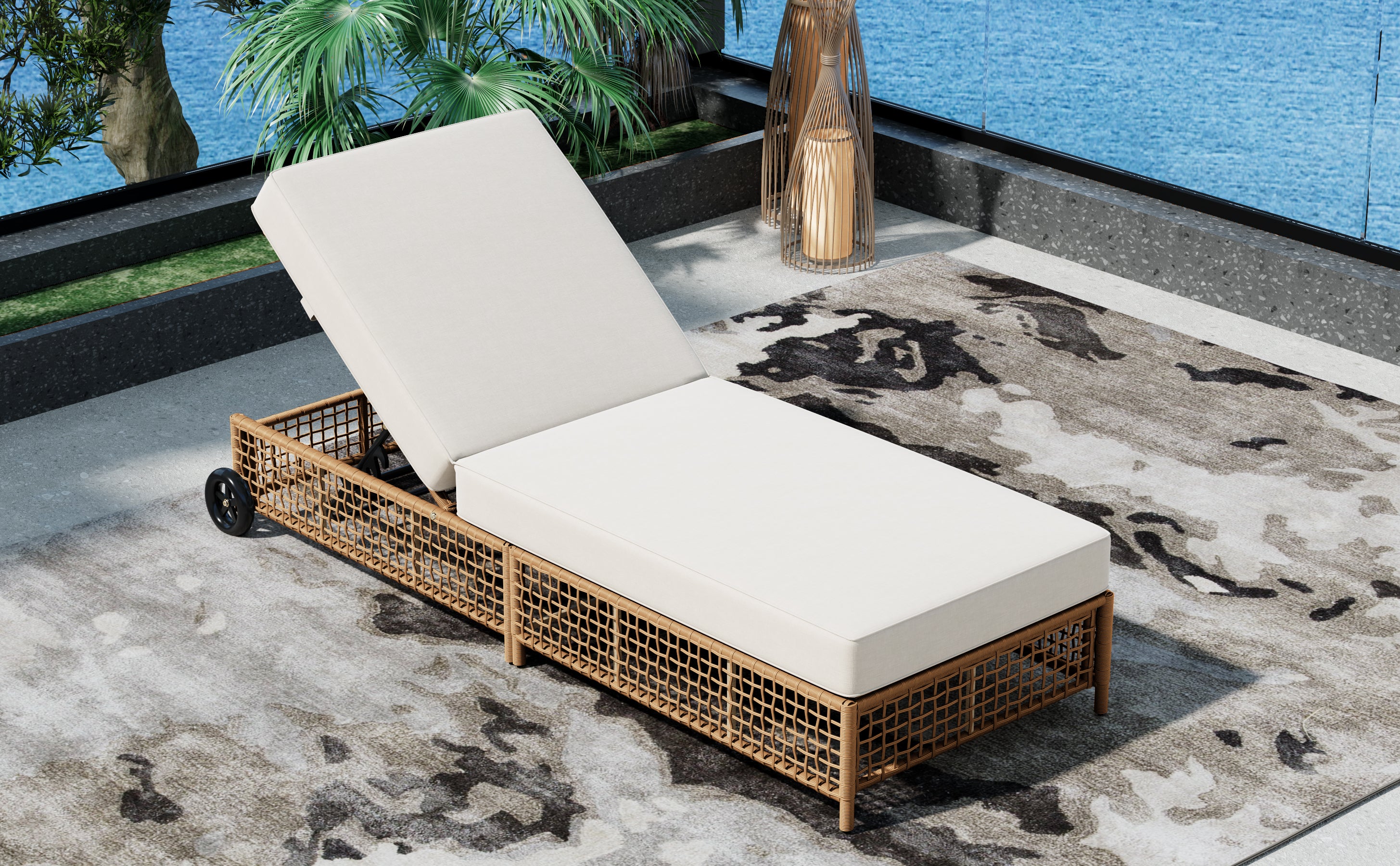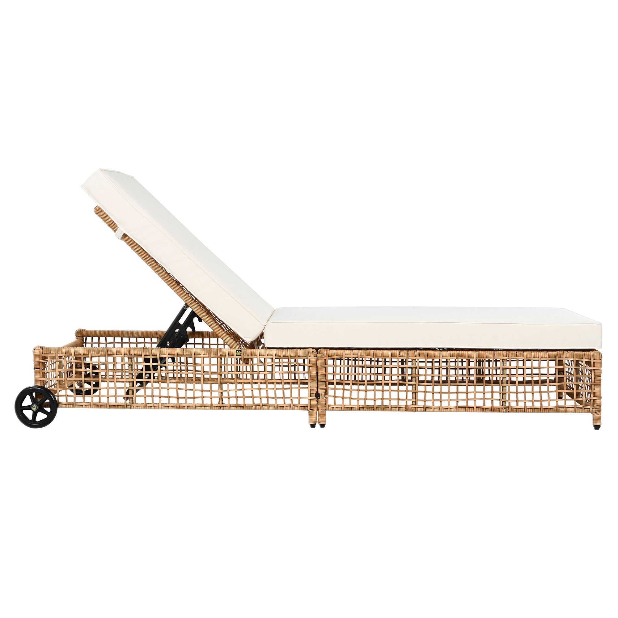 The natural rattan wicker frame adds a touch of elegance to any outdoor space, while the beige cushion provides extra comfort for long hours of relaxation. The built-in wheels make it easy to move the lounge chair around, allowing you to effortlessly follow the sun or reposition it wherever you need.