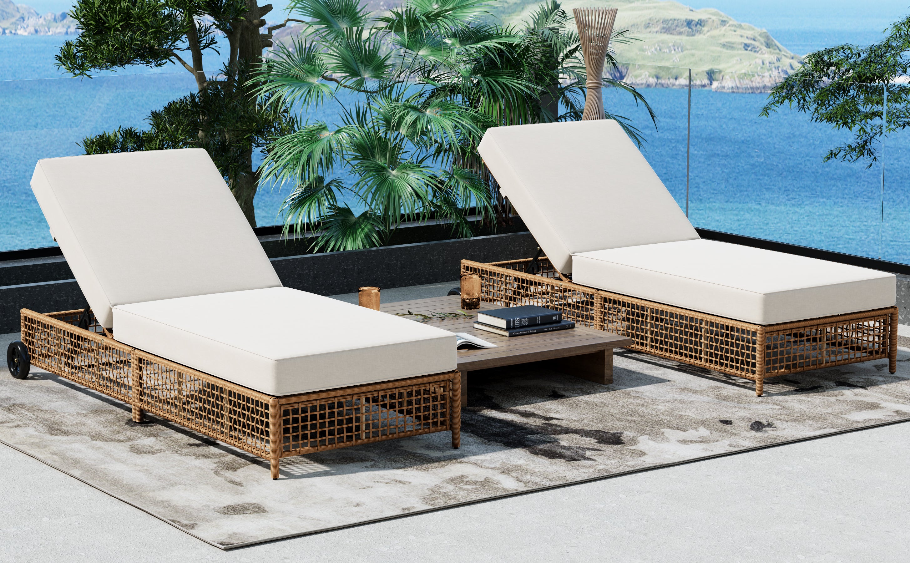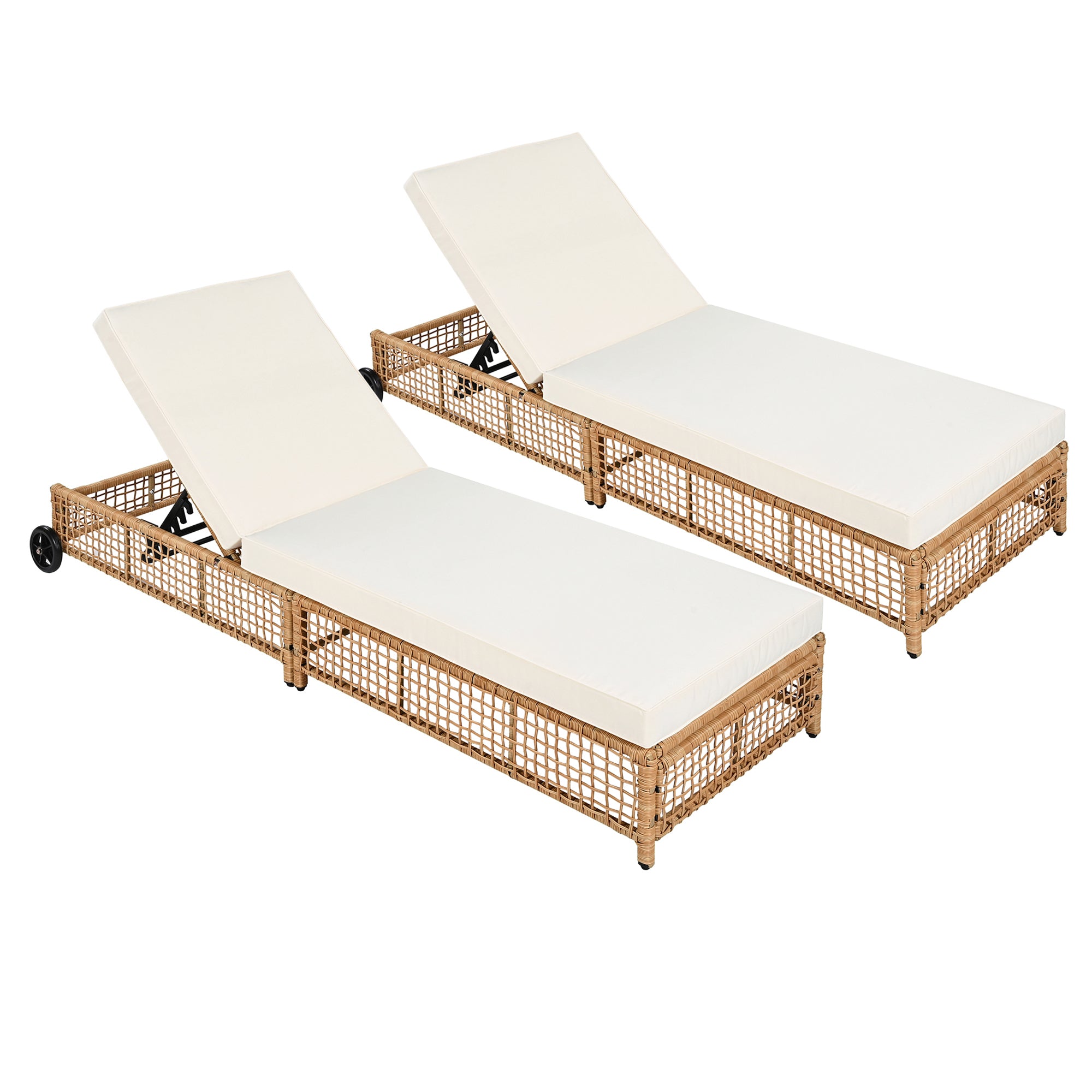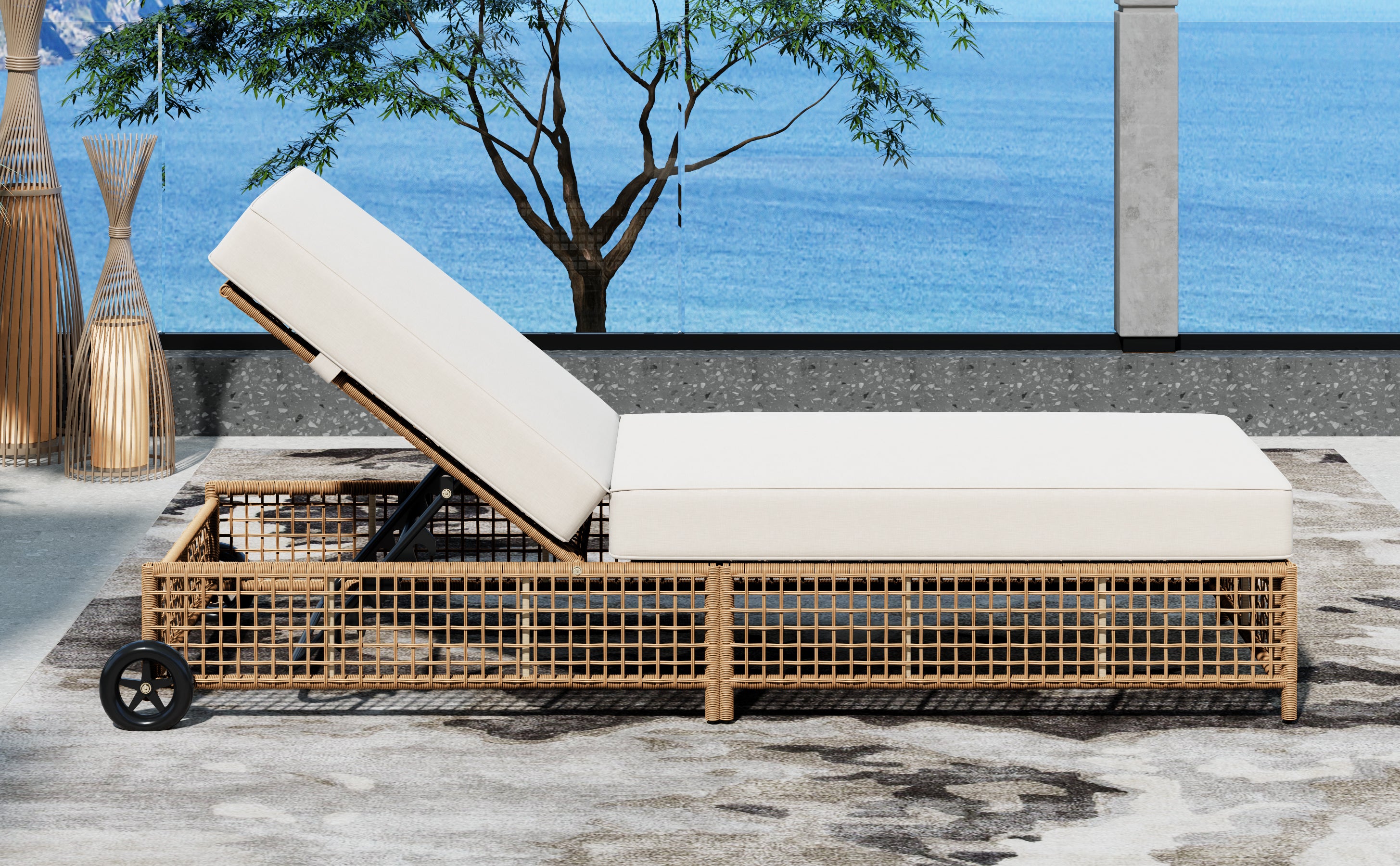 The natural rattan wicker frame adds a touch of elegance to any outdoor space, while the beige cushion provides extra comfort for long hours of relaxation. The built-in wheels make it easy to move the lounge chair around, allowing you to effortlessly follow the sun or reposition it wherever you need.