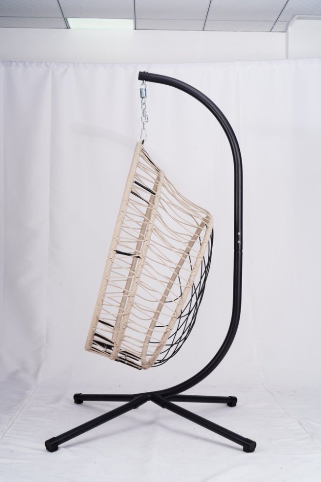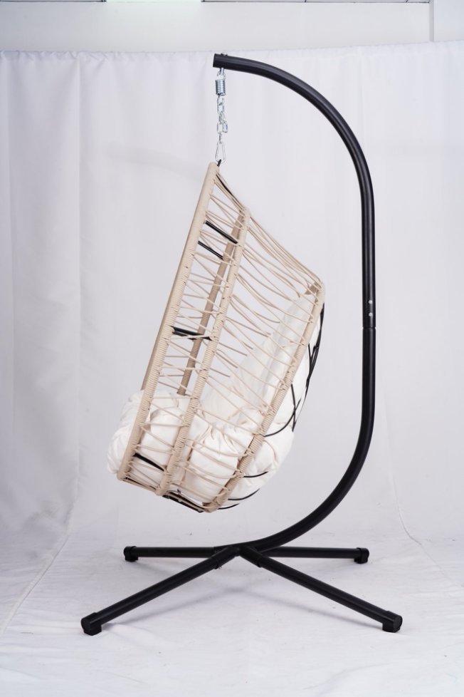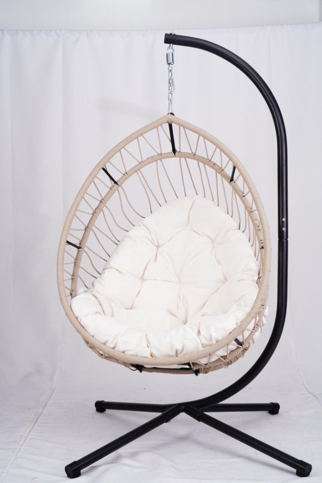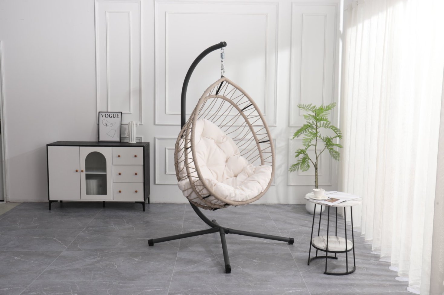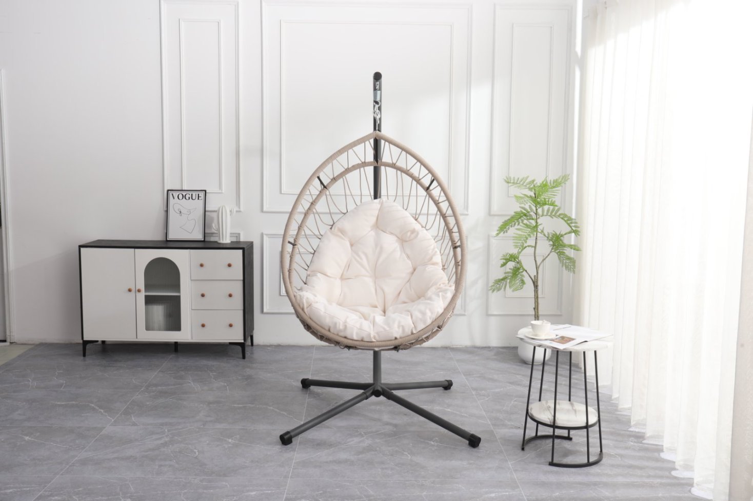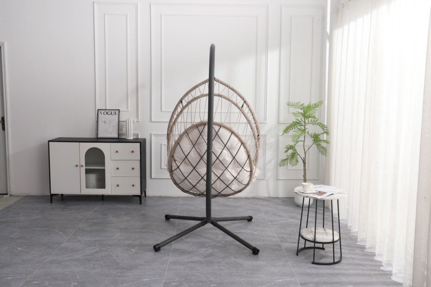 Relax in style with this elegant Egg-Shaped Hanging Chair with Stand, perfect for both indoor and outdoor use. Featuring a sturdy steel frame and cozy beige cushions, this patio swing chair offers a soothing rocking motion and ergonomic egg-shaped design for maximum comfort. Whether placed on your patio, balcony, garden, or living room, this versatile hanging chair adds a touch of modern charm and comfort. Durable, weather-resistant, and easy to assemble—ideal for lounging, reading, or enjoying the outdoors.
