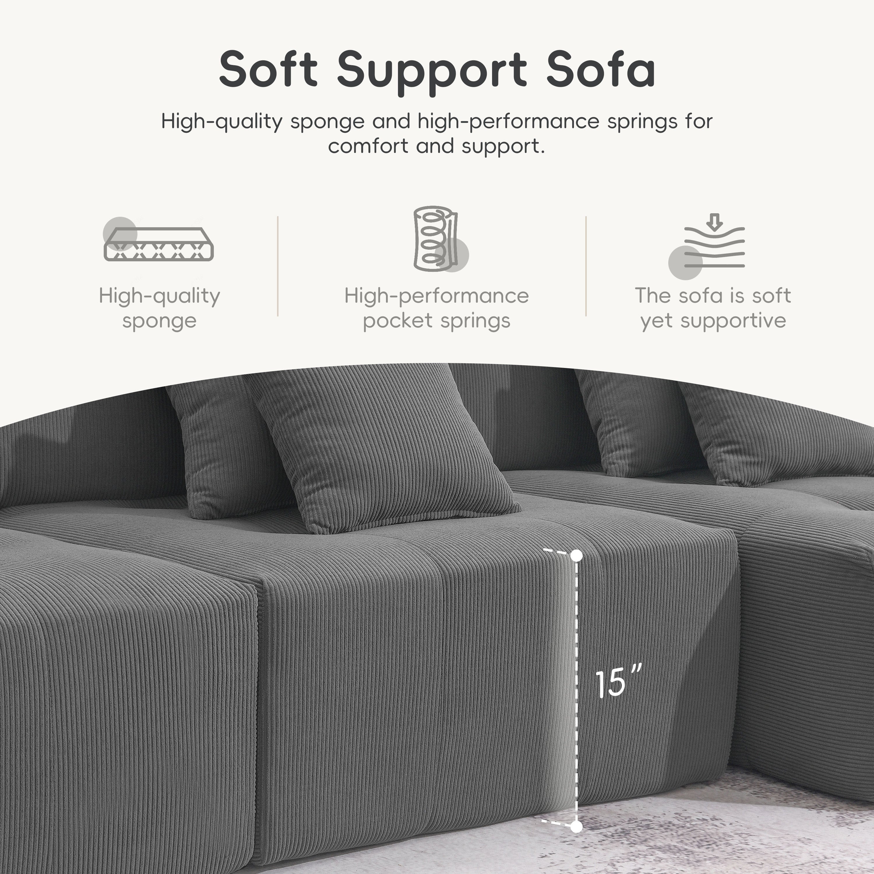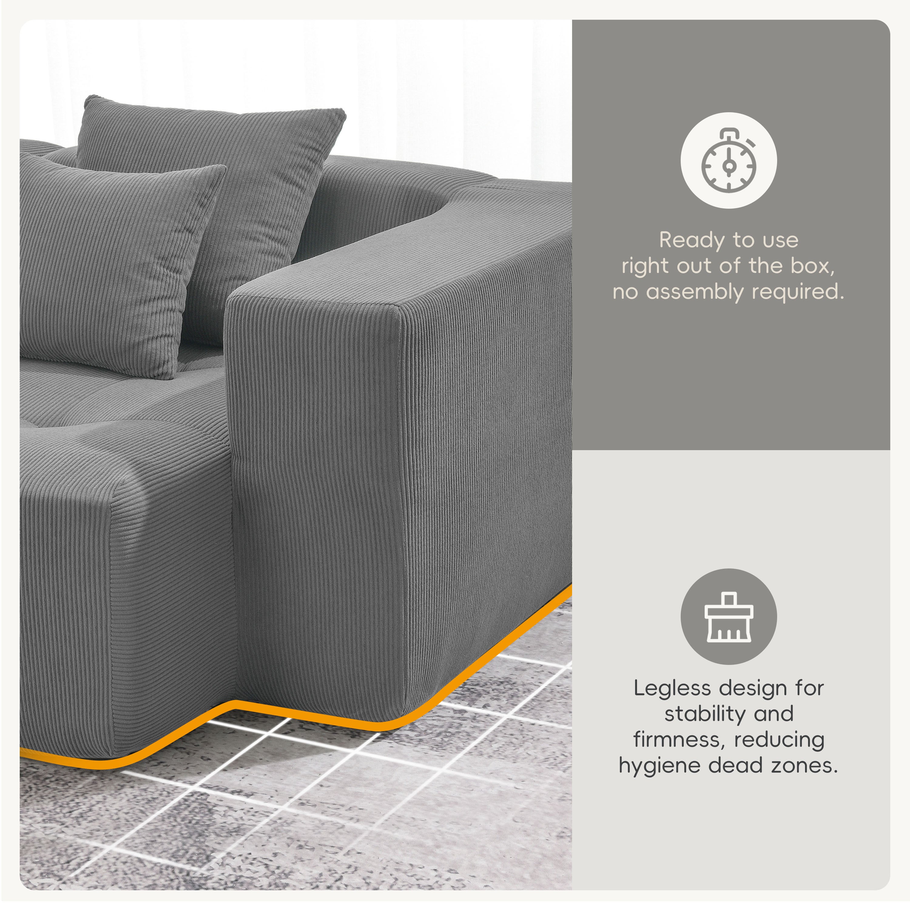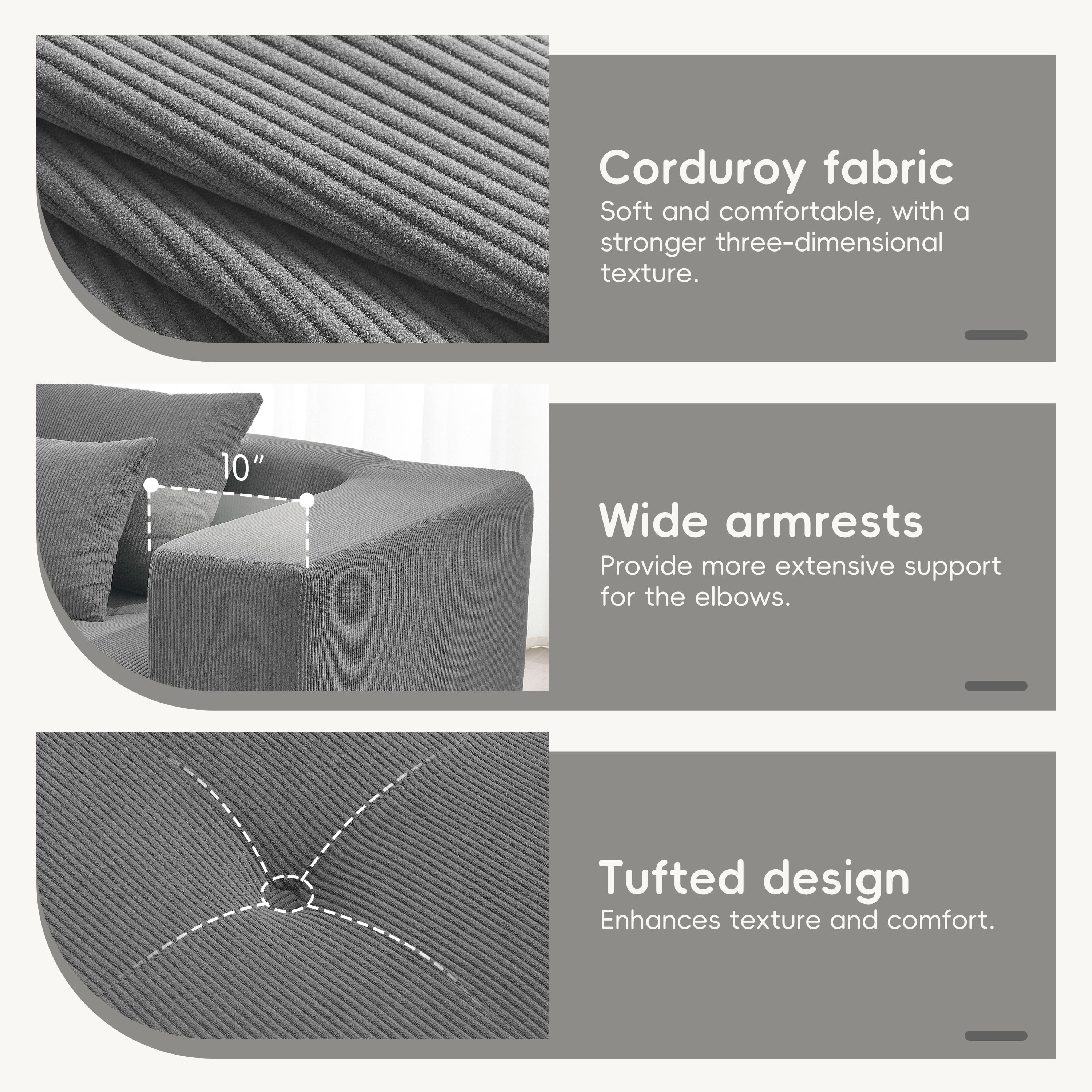 The sofa is upholstered in durable corduroy fabric with a sophisticated tufted design, offering both style and comfort. The modular configuration allows for customizable arrangements to suit various spaces and preferences. Its pure foam construction, free from a traditional wooden frame, provides lightweight, supportive, and squeak-free seating. Additionally, the sofa comes vacuum-sealed for easy shipping and requires no assembly—simply unpack and use, making it a convenient and user-friendly choice for any home.