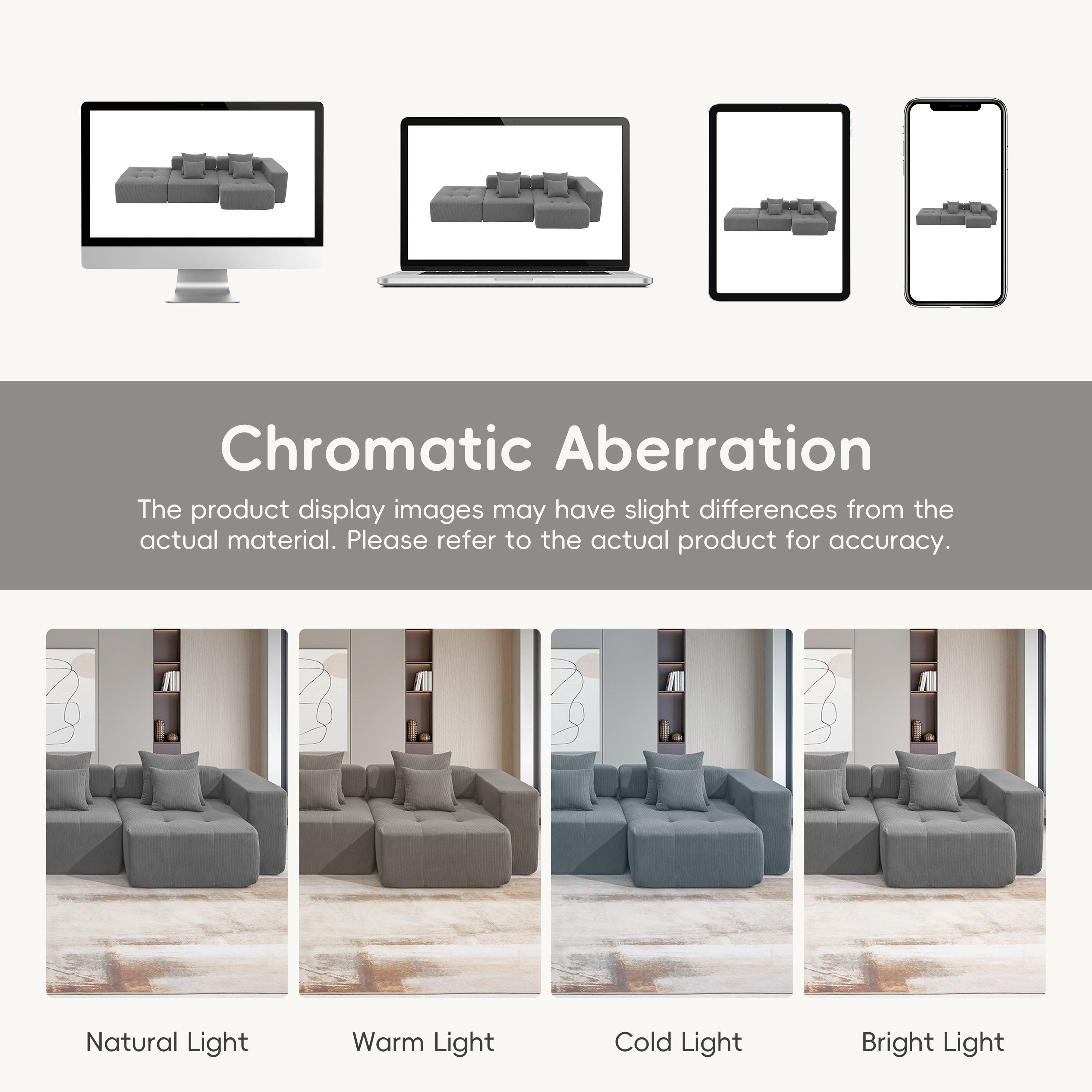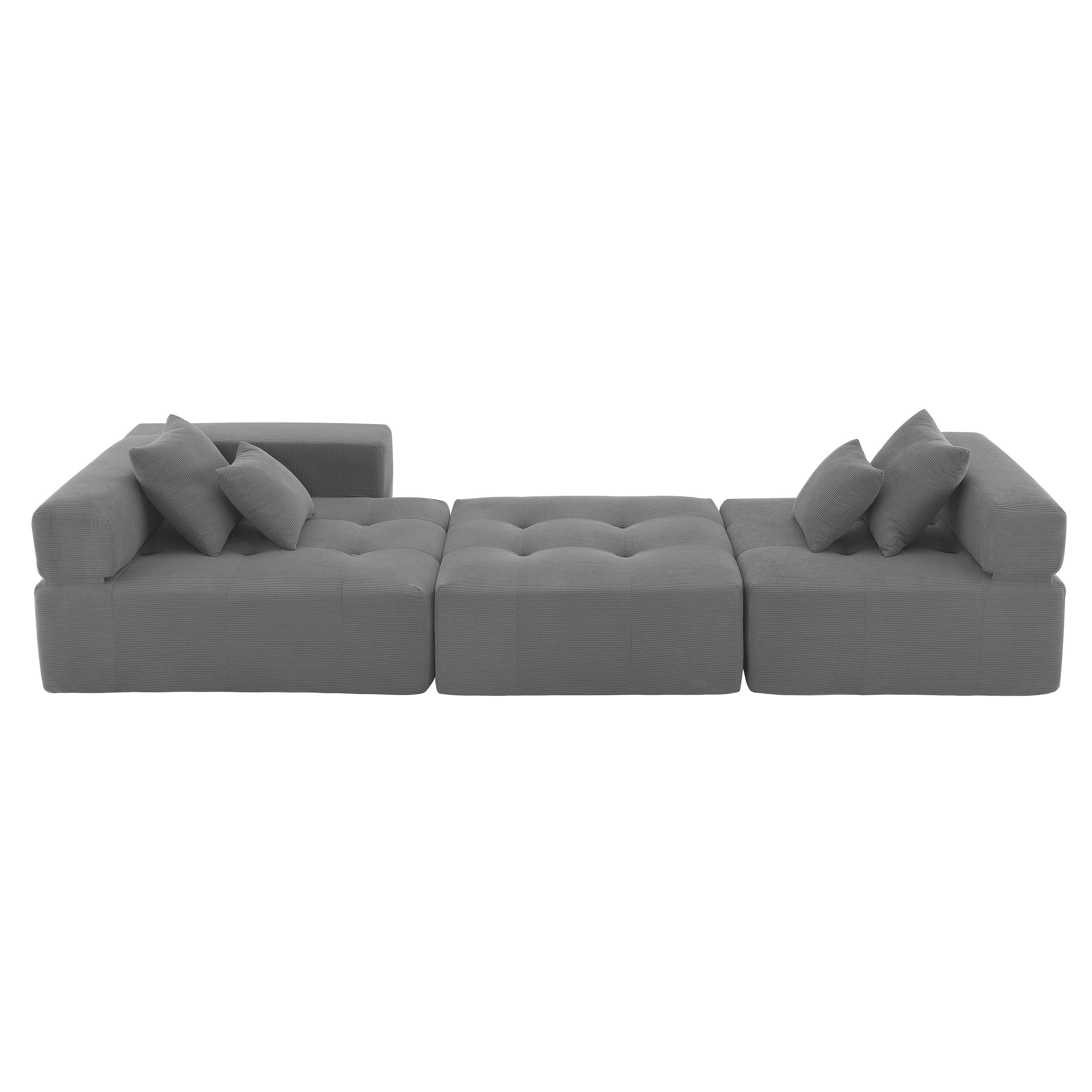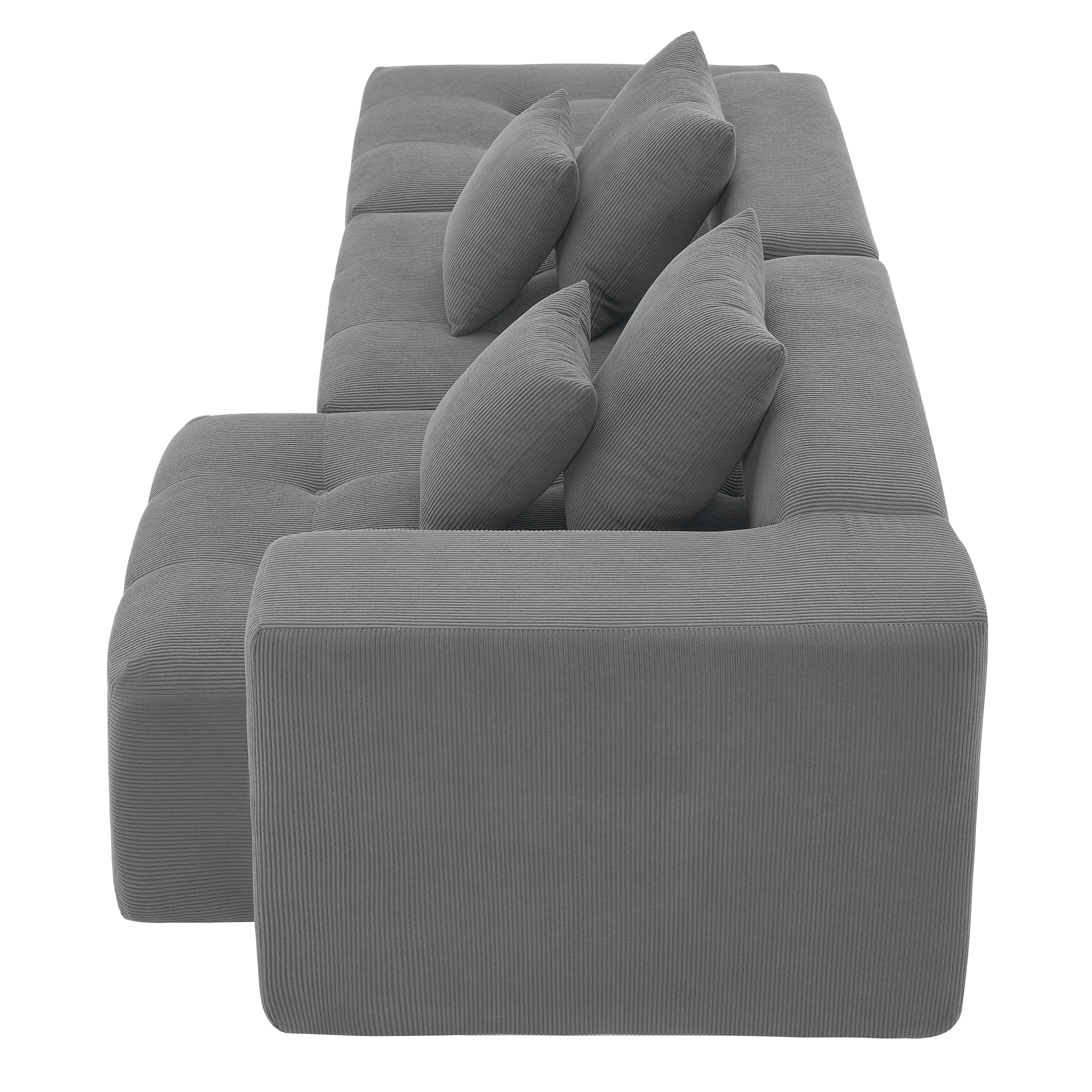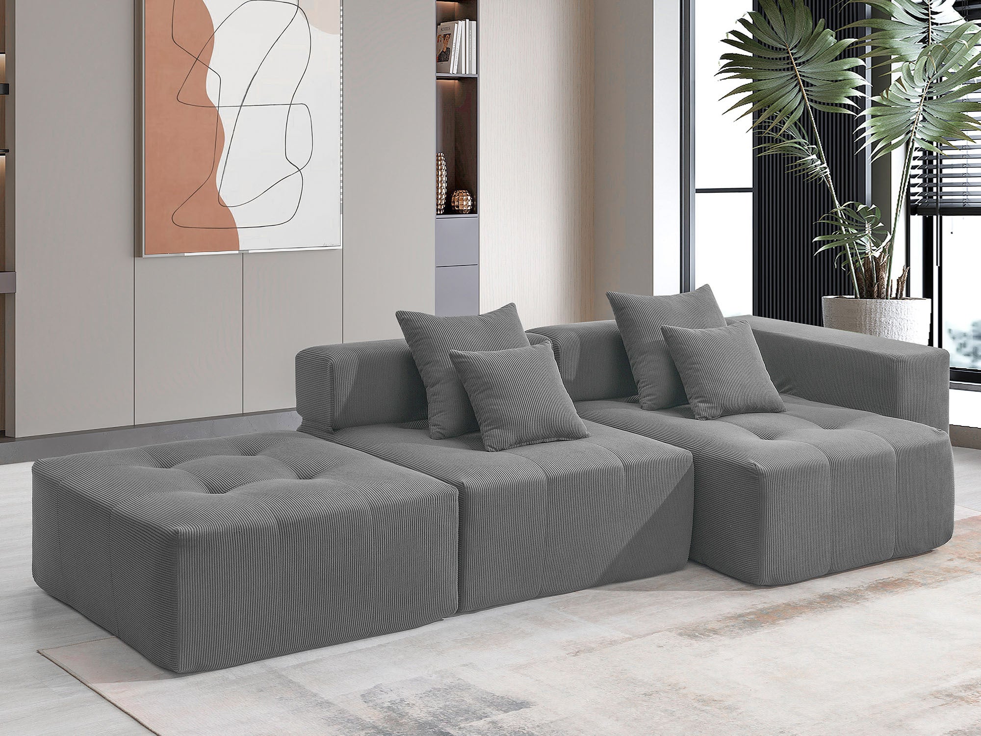 The sofa is upholstered in durable corduroy fabric with a sophisticated tufted design, offering both style and comfort. The modular configuration allows for customizable arrangements to suit various spaces and preferences. Its pure foam construction, free from a traditional wooden frame, provides lightweight, supportive, and squeak-free seating. Additionally, the sofa comes vacuum-sealed for easy shipping and requires no assembly—simply unpack and use, making it a convenient and user-friendly choice for any home.