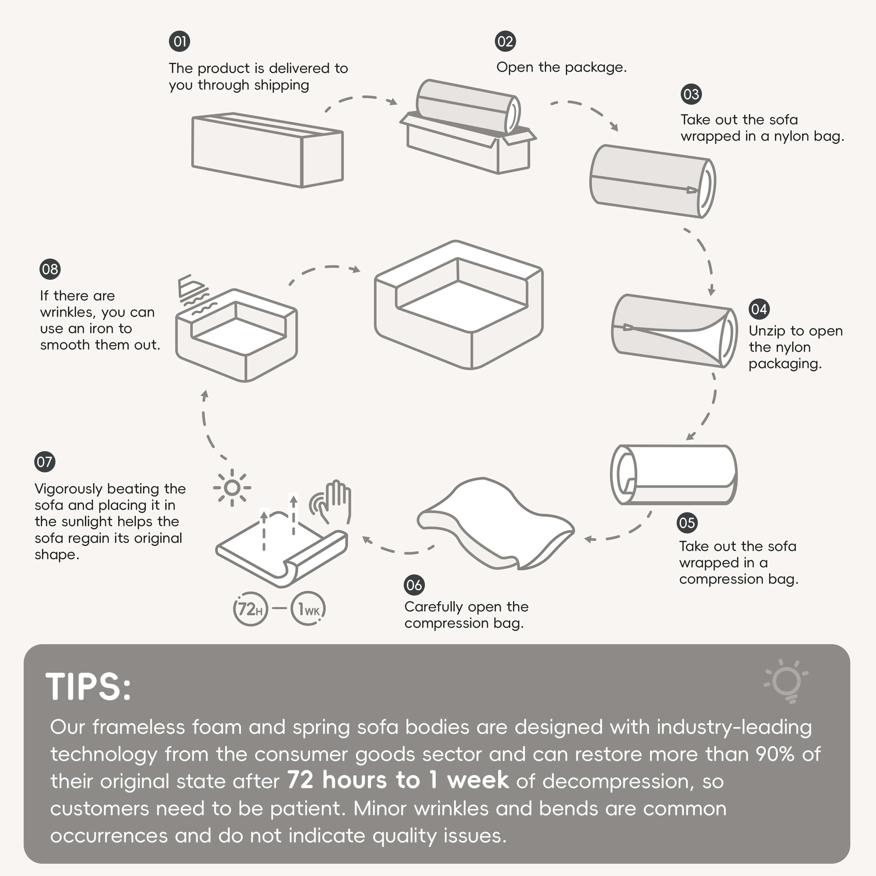 • Vacuum-Sealed, Unpack-and-Use:This full-compression sofa features a convenient vacuum-sealed, unpack-and-use design. It arrives in a compact, compressed form that makes shipping and handling easier. Once you receive the sofa, you simply unpack it and let it expand to its full size—no assembly required. The ease of unpacking and setting up the sofa makes it an ideal choice for those who want a hassle-free furniture experience.