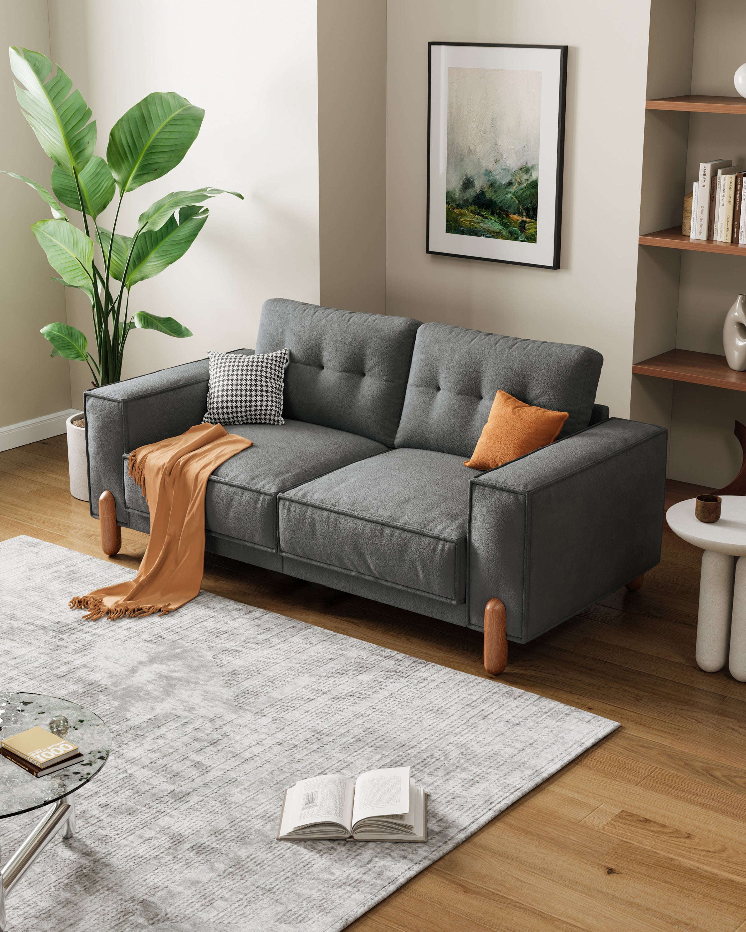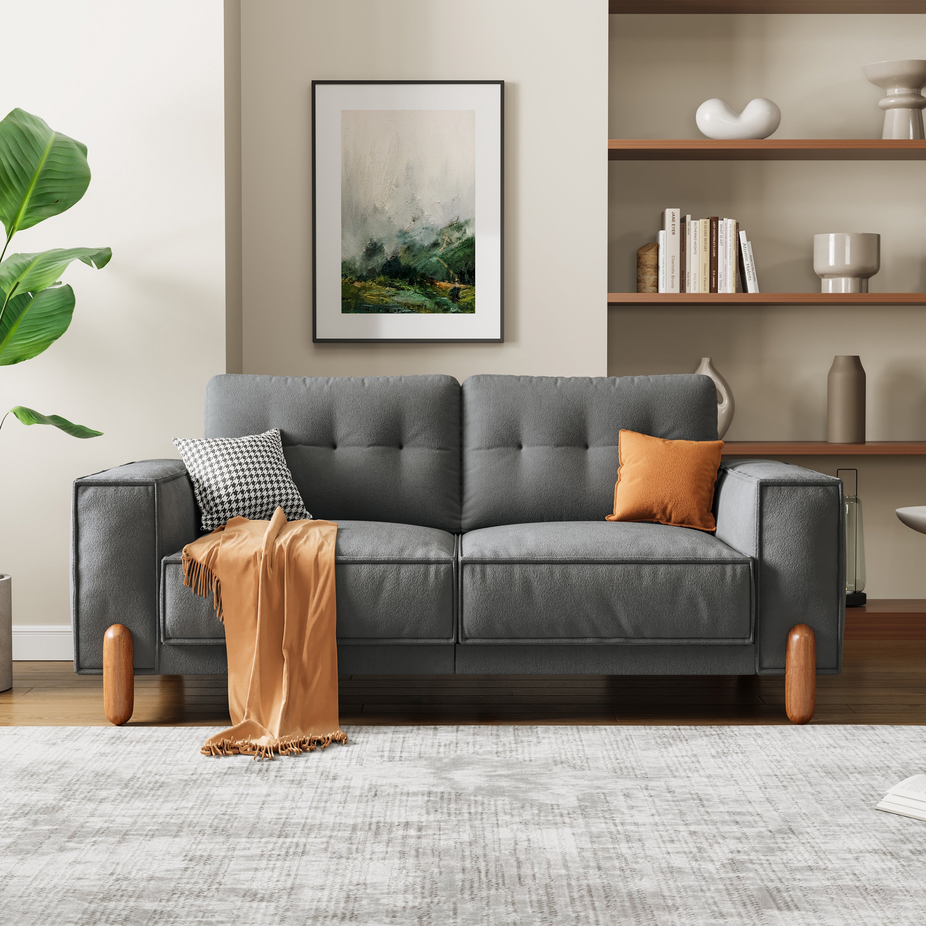 Modern Fabric Upholstered Sofa - Tufted Couch with Square Arms, 4 Solid Wood Legs & 2 Decorative Pillows for Living Room, Office, Apartment