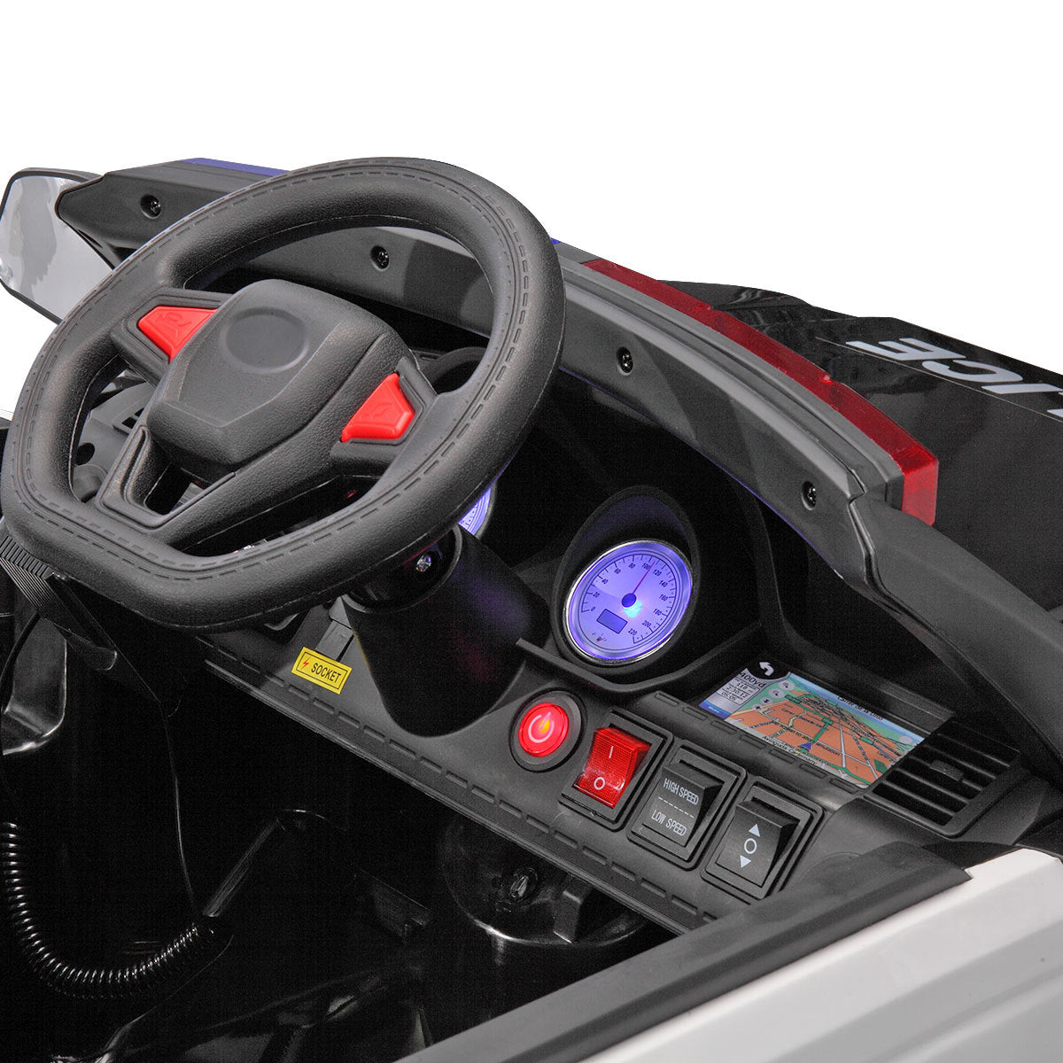 - PremiumMaterial: Made of kid-friendly PP, this ride on police car is safe enoughforyour children's health.4 wear resistant wheels with suspension systemmake it applicable to various terrains, including asphalt road, brick road and cement road.