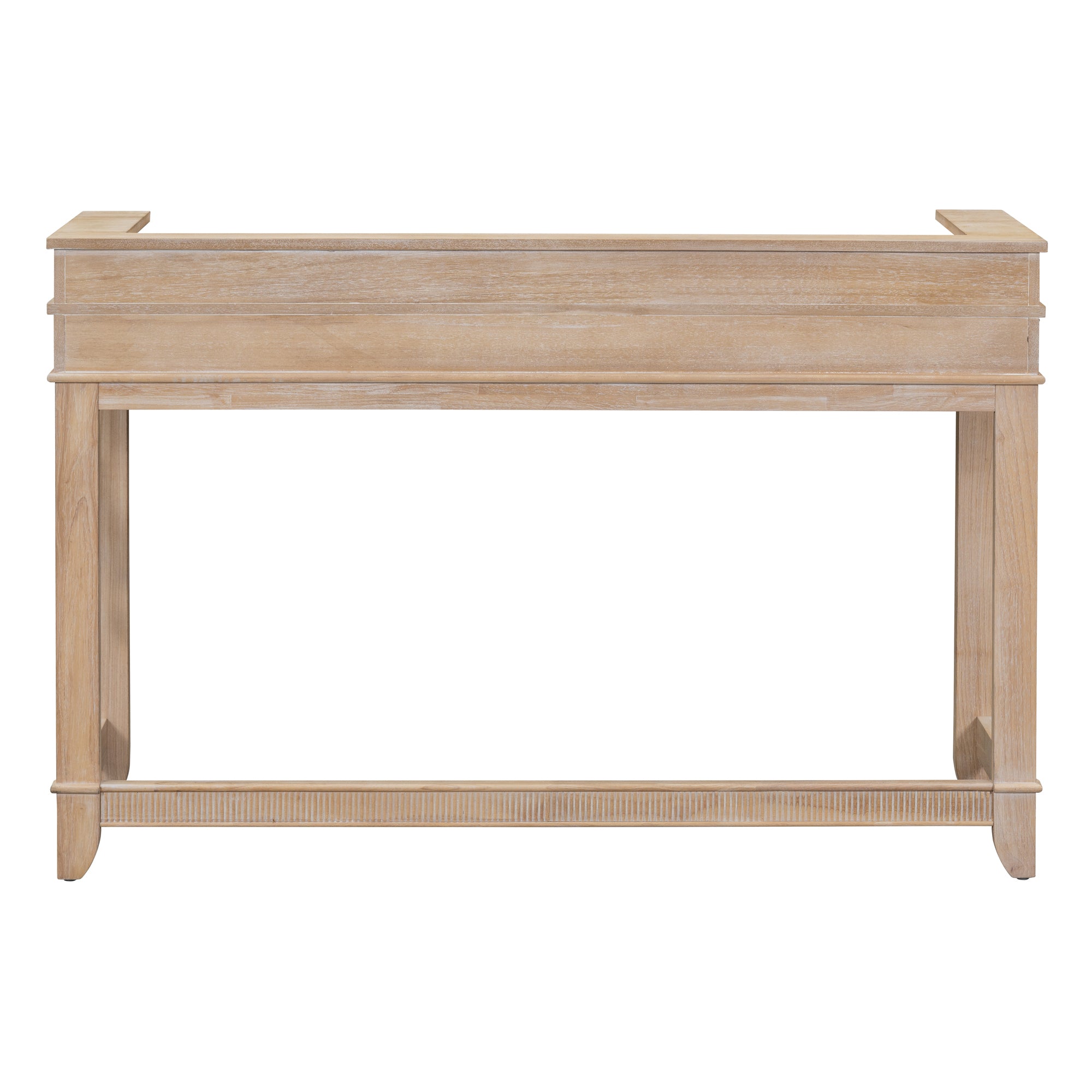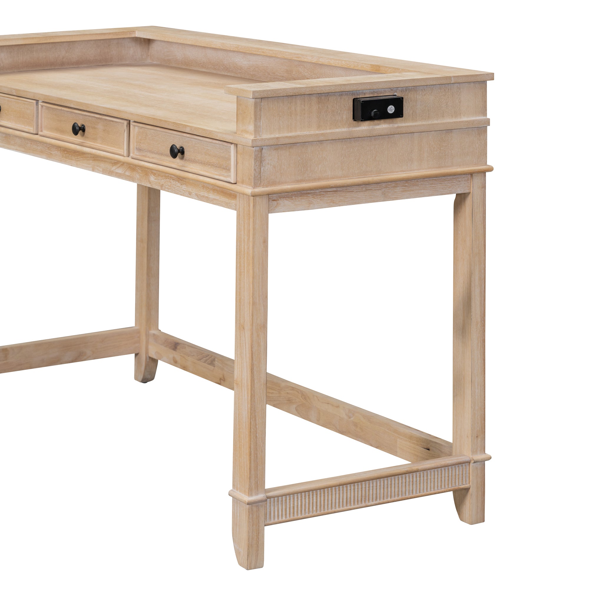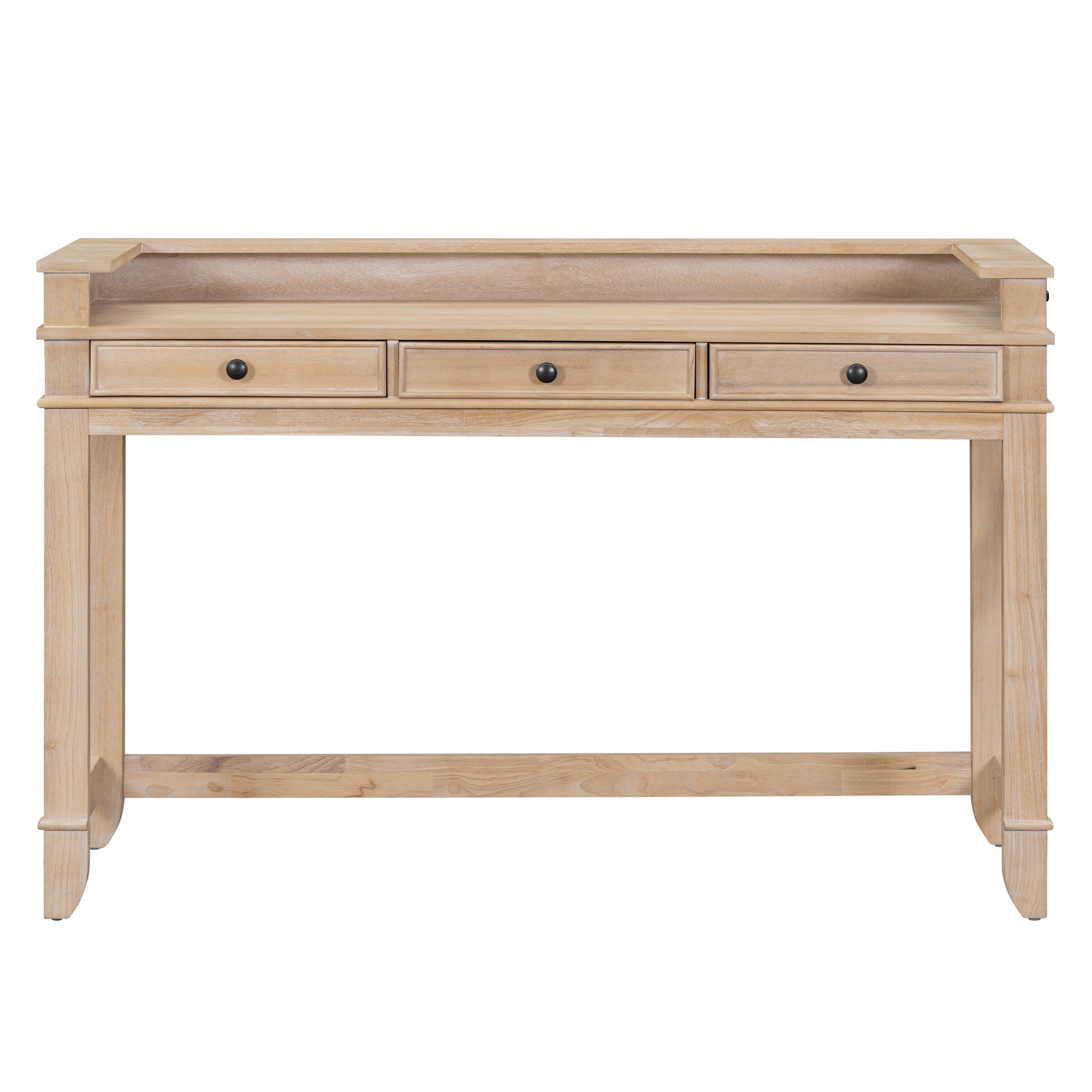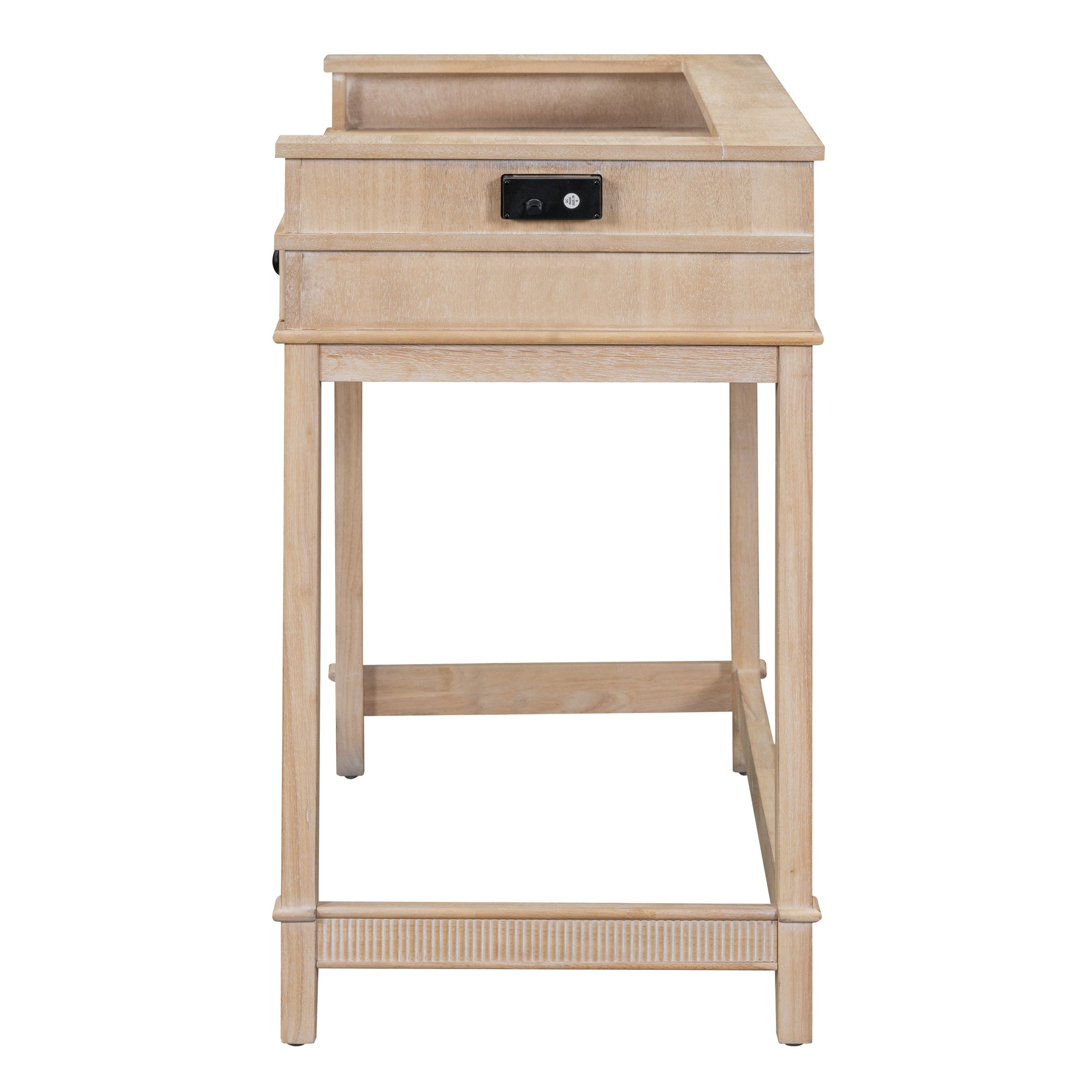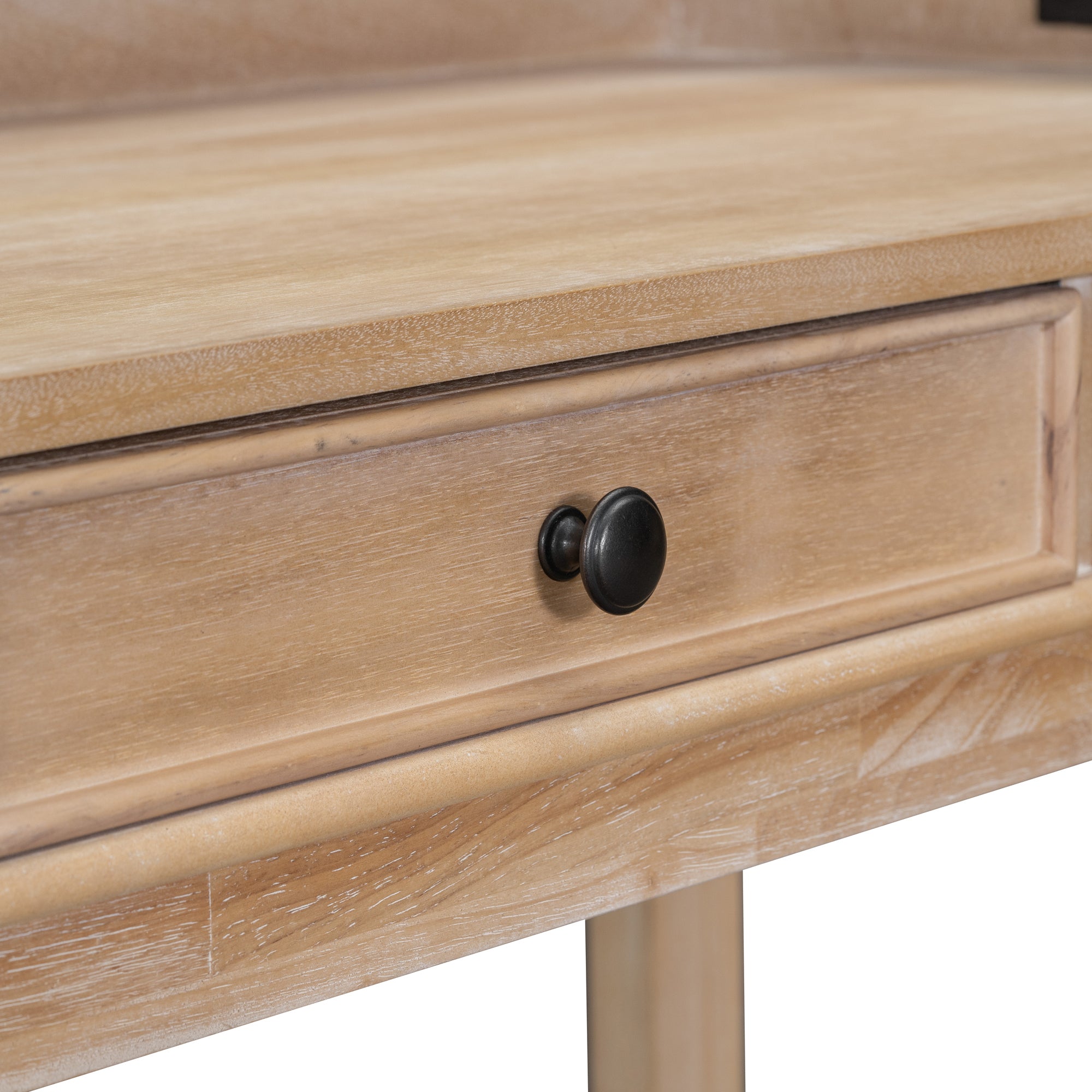 The tabletop, frame and drawers is made of MDF, and rubber wood for the legs and crossbars. The stool is made of rubber wood and sponge upholstery, which not only increases the comfort of use, but also improves the stability of the table. Table weight capacity: 595 lbs; Stool weight capacity: 330 lbs. The fence design of the tabletop better protects your items. There are two colors available for you, natural wood wash and gray, both of which will complement your decor perfectly.