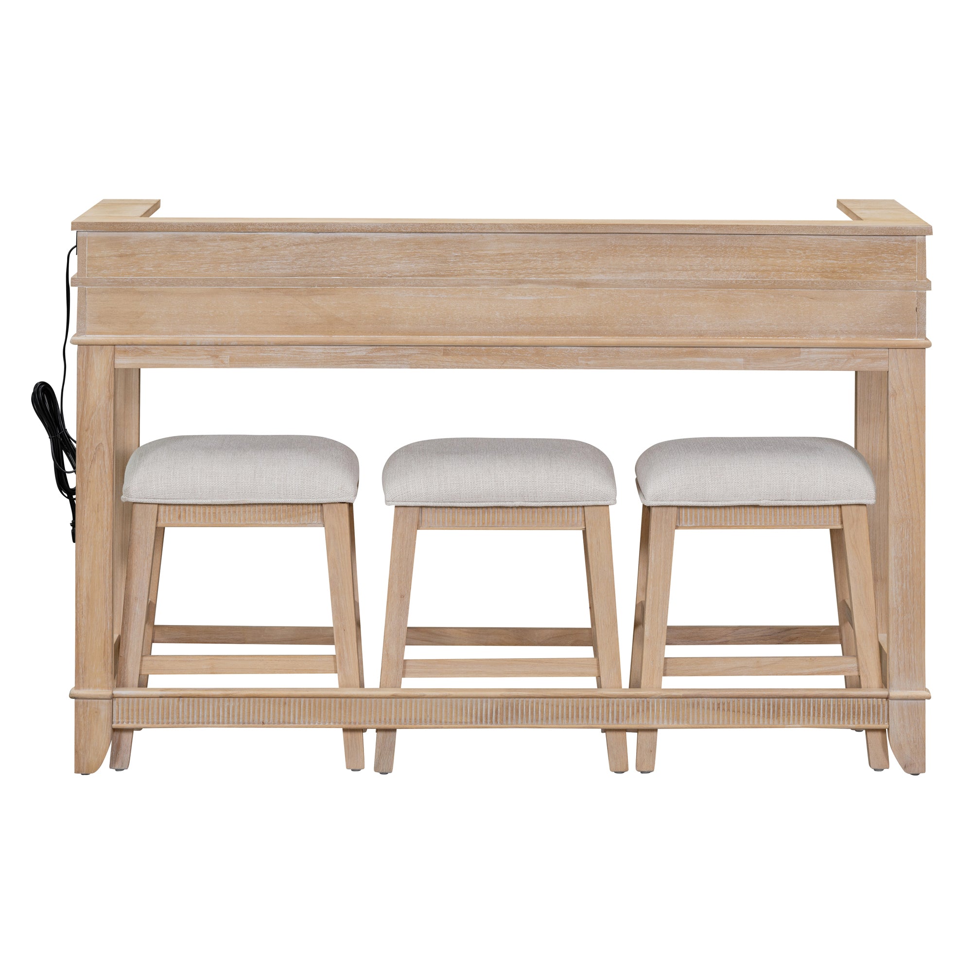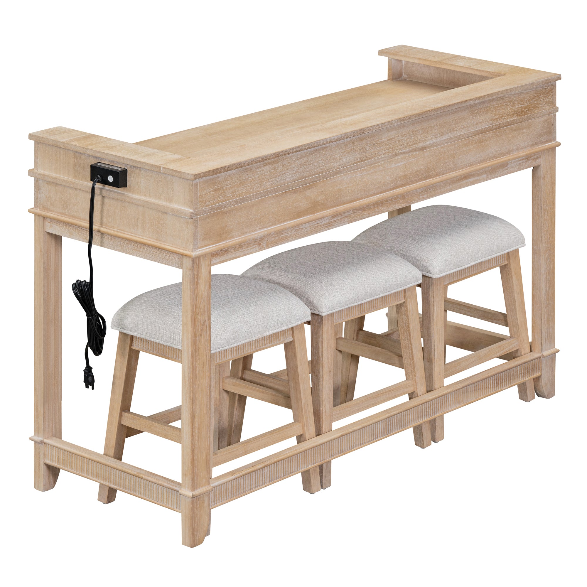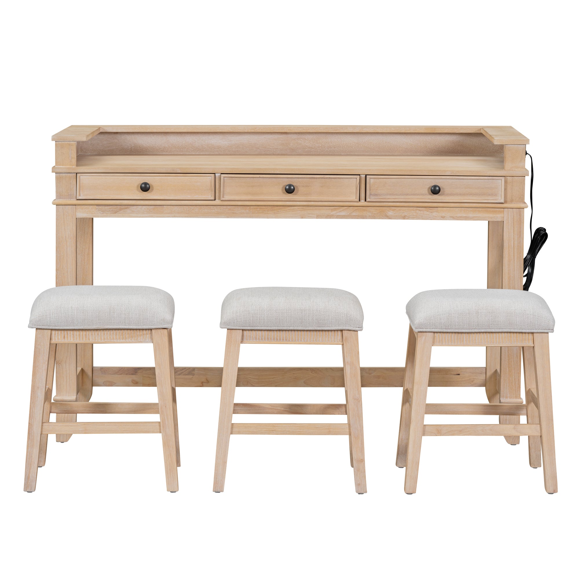 TREXM 4-piece Dining Bar Table Set with 3 Upholstered Stools, Multifunctional Dining Table with 3 Drawers (Natural Wood Wash)
