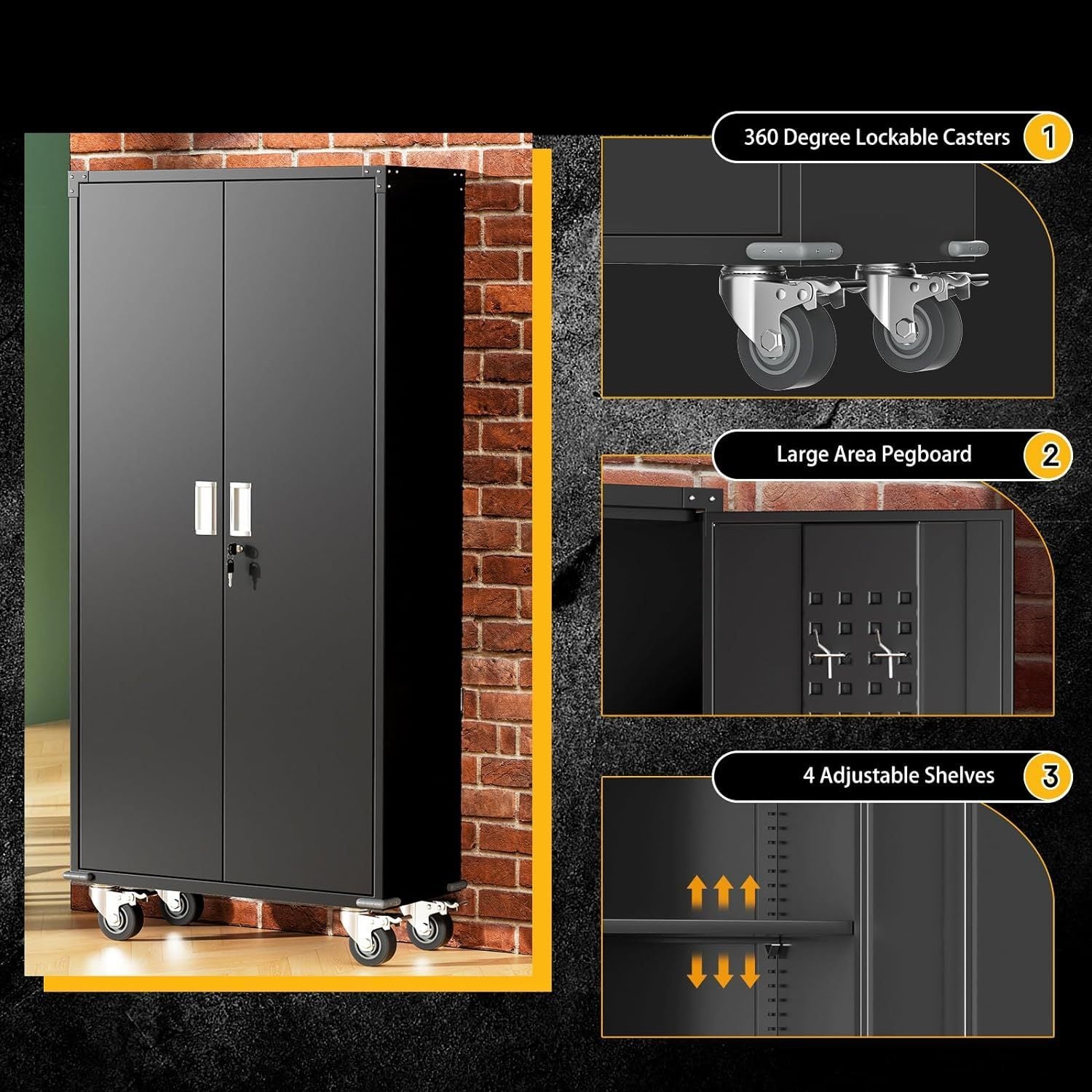 • Metal storage cabinet on wheels has a Large capacity to store your belongings. Equipped with 2 locking hinged doors and 4 Adjustable Shelves. Garage steel cabinet the best choice to keep your personal items and documents safe in any garage, home,