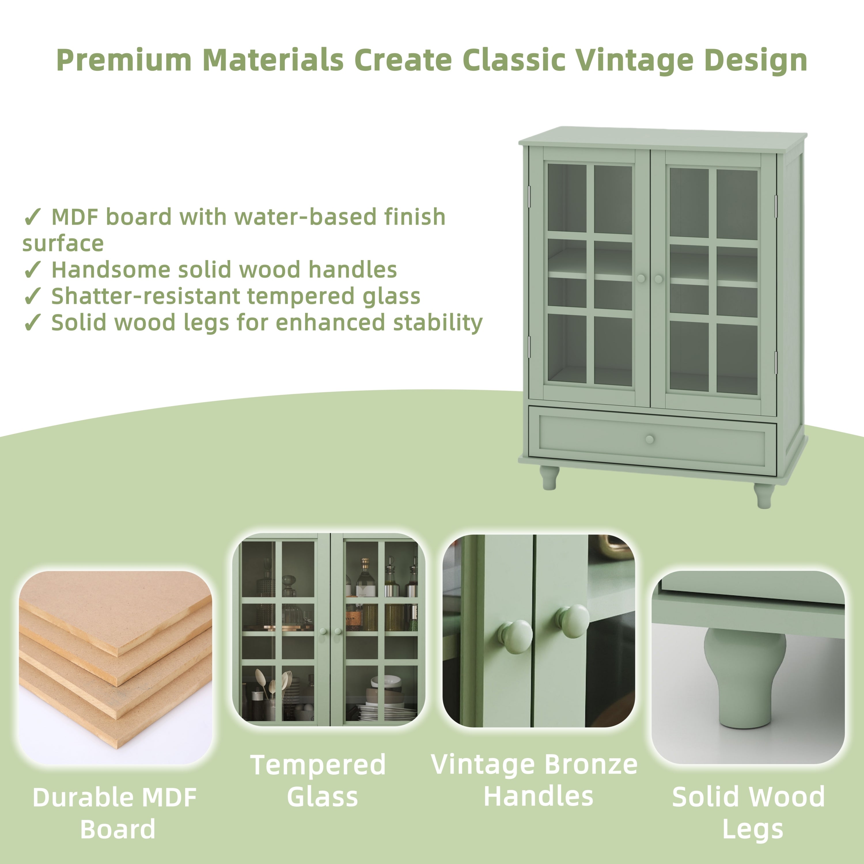 Highlights 1.Water-based painted MDF surface 2.Handsome solid wood handles 3.Shatter-resistant tempered glass 4.Durable vintage solid wood legs 5.Adjustable shelves to customize your storage space 6.Spacious bottom drawer for organized concealment 7.Smooth-gliding mechanism for effortless access