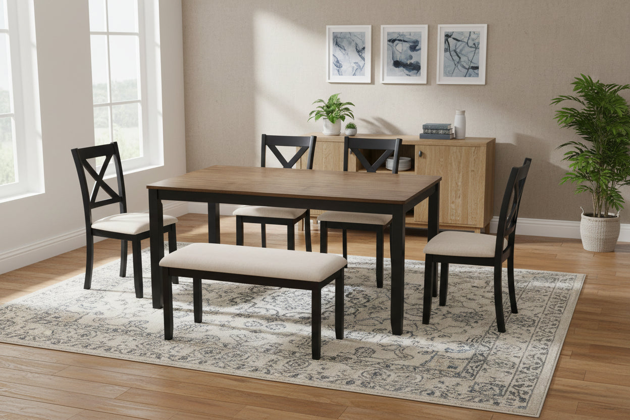 - 6-piece Wooden Dining Set: The set consists of a rectangular dining table, 4 chairs and a bench. The tabletop is generously sized to comfortably seat family and guests without feeling cramped. When not in use, the chairs can be stored underneath the dining table to maximise available living space