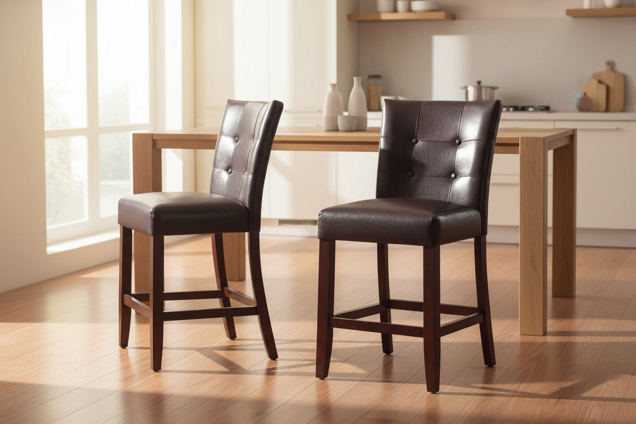Upgrade your kitchen, dining room, or living space with these charming, transitional counter-height chairs. Fully upholstered in PU leather, with button-tufted backrests and walnut finish tapered legs, they offer both elegance and comfort.