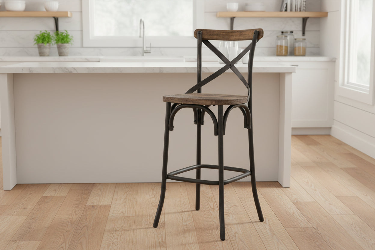 Vintage style bar chair in available in antique black & antique oak finish is made of wood and metal. Simple 'X' backrest, wooden seat, slightly flared legs base with footrest support.