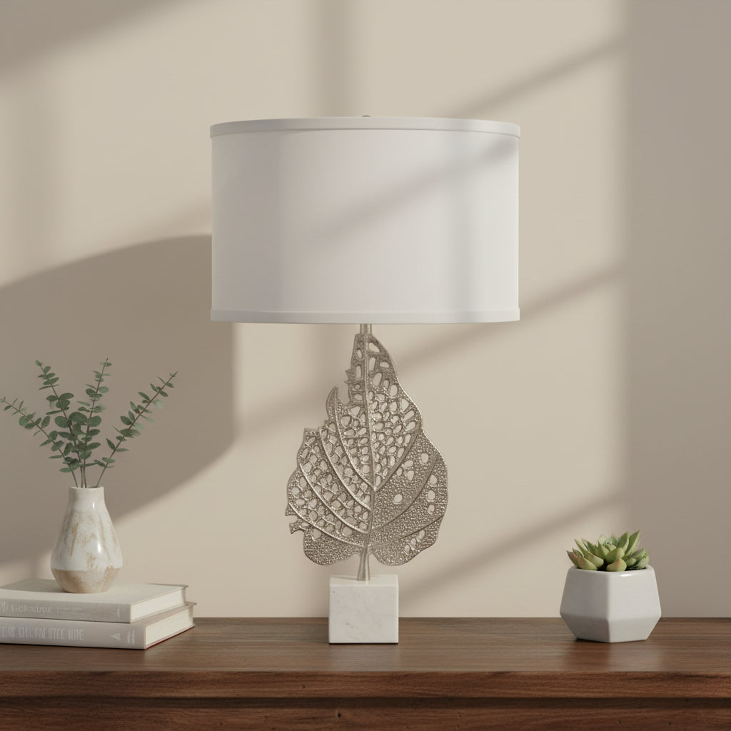 Bring an artistic, modern accent to your home decor with this table lamp. Featuring a marble cube pedestal base,a white drum shade,and a leaf silhouette coated in a nickel finish, this piece is sure to attract the eye of your guests. It is an ideal size for your bedside table, a desk in your study, or an end table anywhere in your house. Minimal assembly is required for the collapsible drum shade.