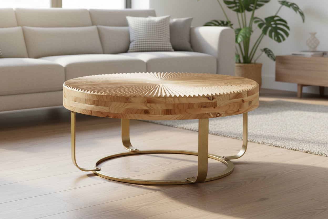 Infuse your home with a "cloud-like" organic texture using our Modern Round Coffee Table. This statement piece features an intricate wooden carving pattern on the tabletop, meticulously handcrafted to provide a tactile, high-end aesthetic. Supported by sleek metal legs in a golden natural finish, it masterfully blends rustic farmhouse warmth with contemporary luxury—perfect for sophisticated living rooms, creative offices, and upscale apartments.