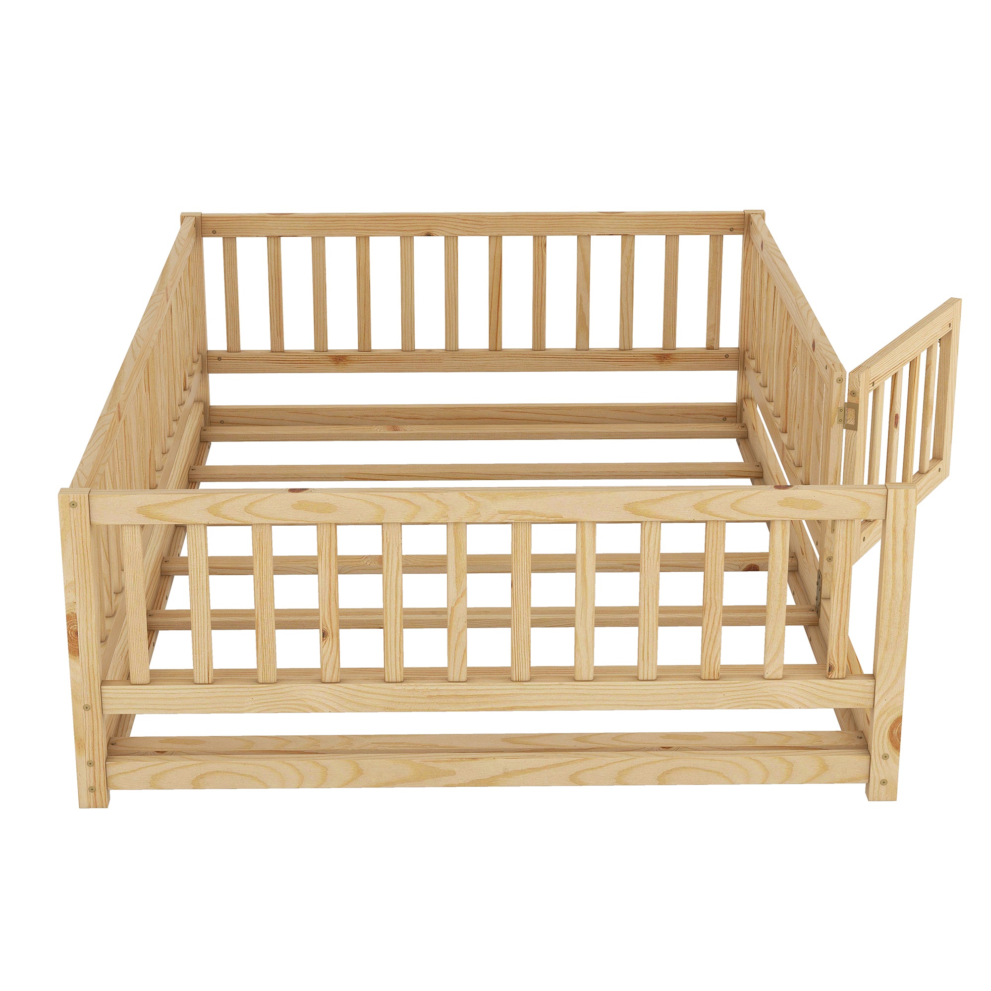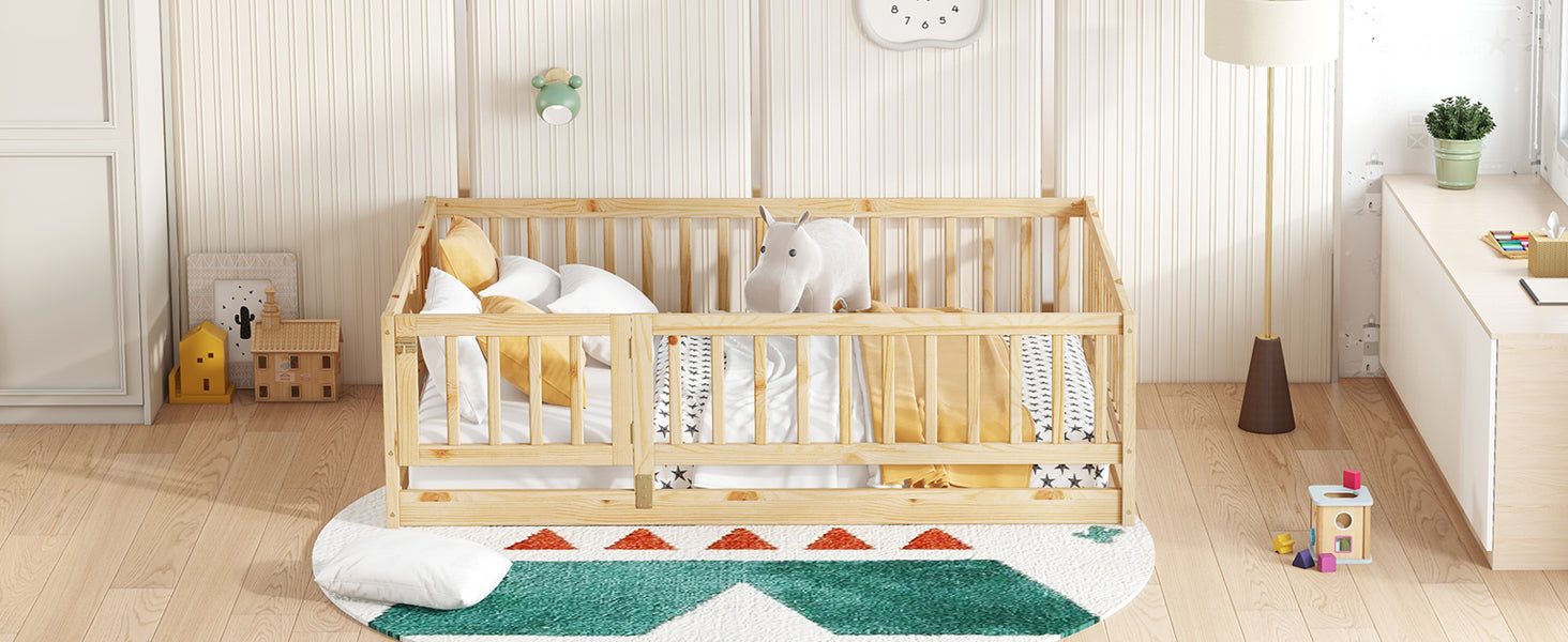 - [Floor Bed with Fence and Door]The four guardrail of the montessori floor bed are not truncated, so our twin floor bed is more stable than a regular floor bed. There is a small door that can be opened and closed, which increases the interest of the montessori floor bed and creates a more safety sleeping space. Fence Hight: 21.5'. Note: The Door is removable.