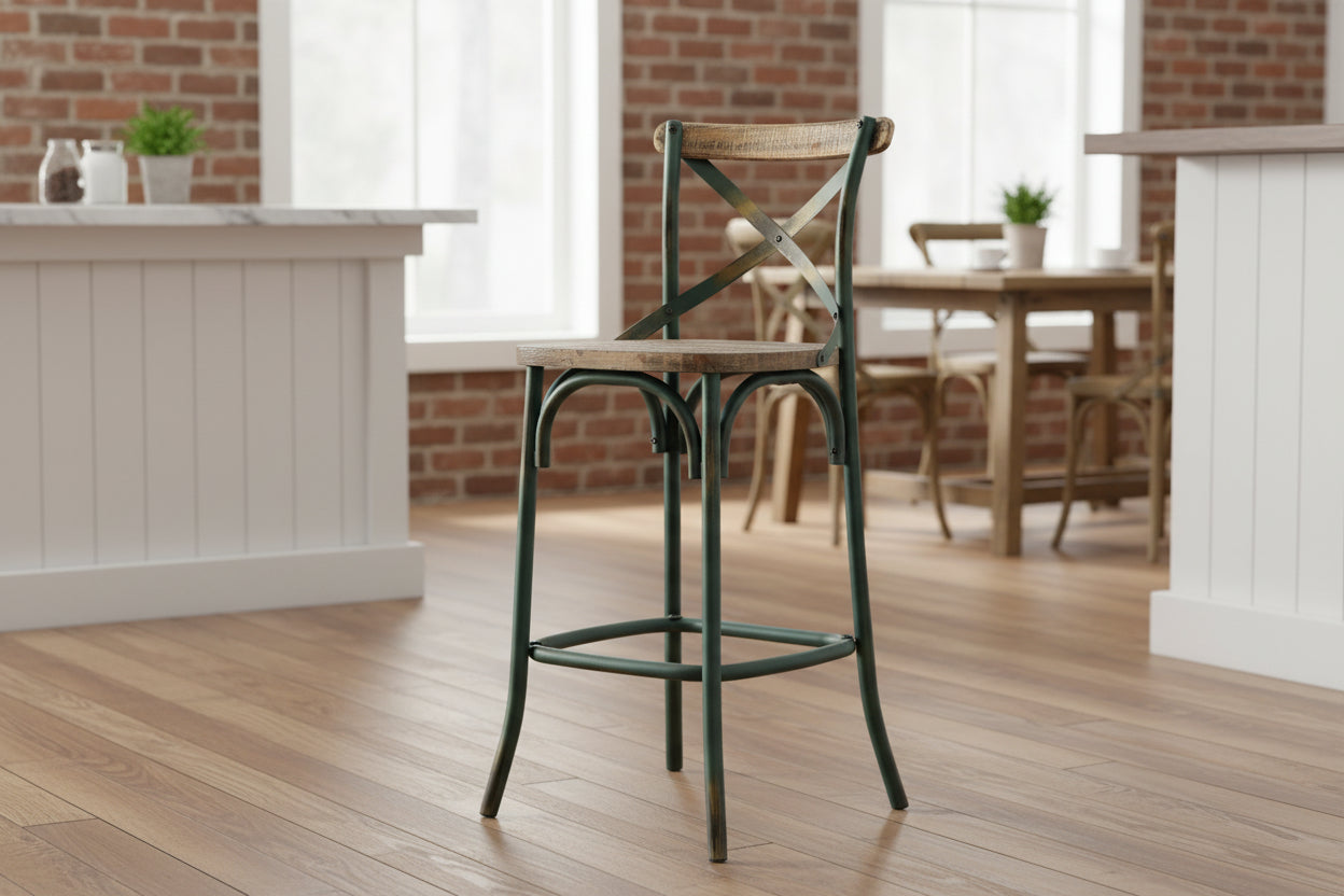 Vintage style bar chair in available in antique turquoise & antique oak finish is made of wood and metal. Simple 'X' backrest, wooden seat, slightly flared legs base with footrest support.