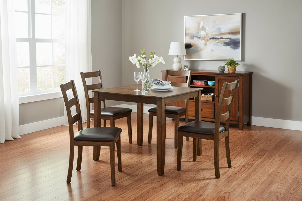 Traditional curved wood ladder-back chairs accompany this classic table, all finished in a rich walnut to darken and enchance their matching wood grain patterns. The cozy square table top makes efficient use of limited space. A practical gem!