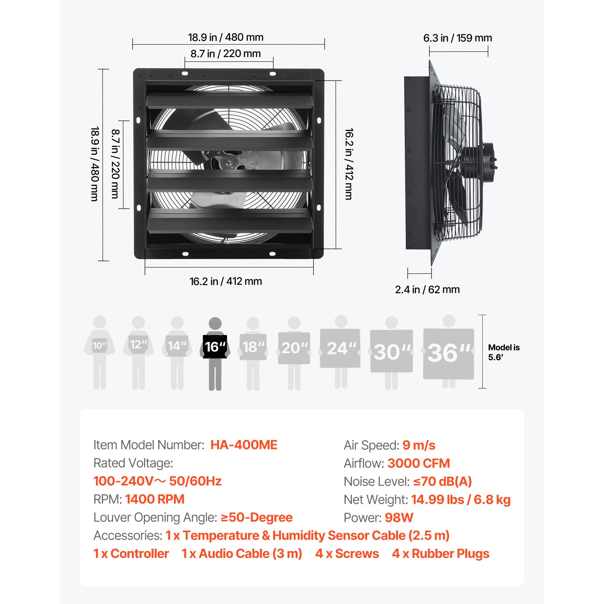 16 inch Shutter Exhaust Fan, Wall Mounted Attic Vent Fan with Smart Programming Variable Speed Temperature Control, 2900 CFM,EC Motor,Timer, for Shed,Garage,Greenhouse Ventilation Cooling,Black
