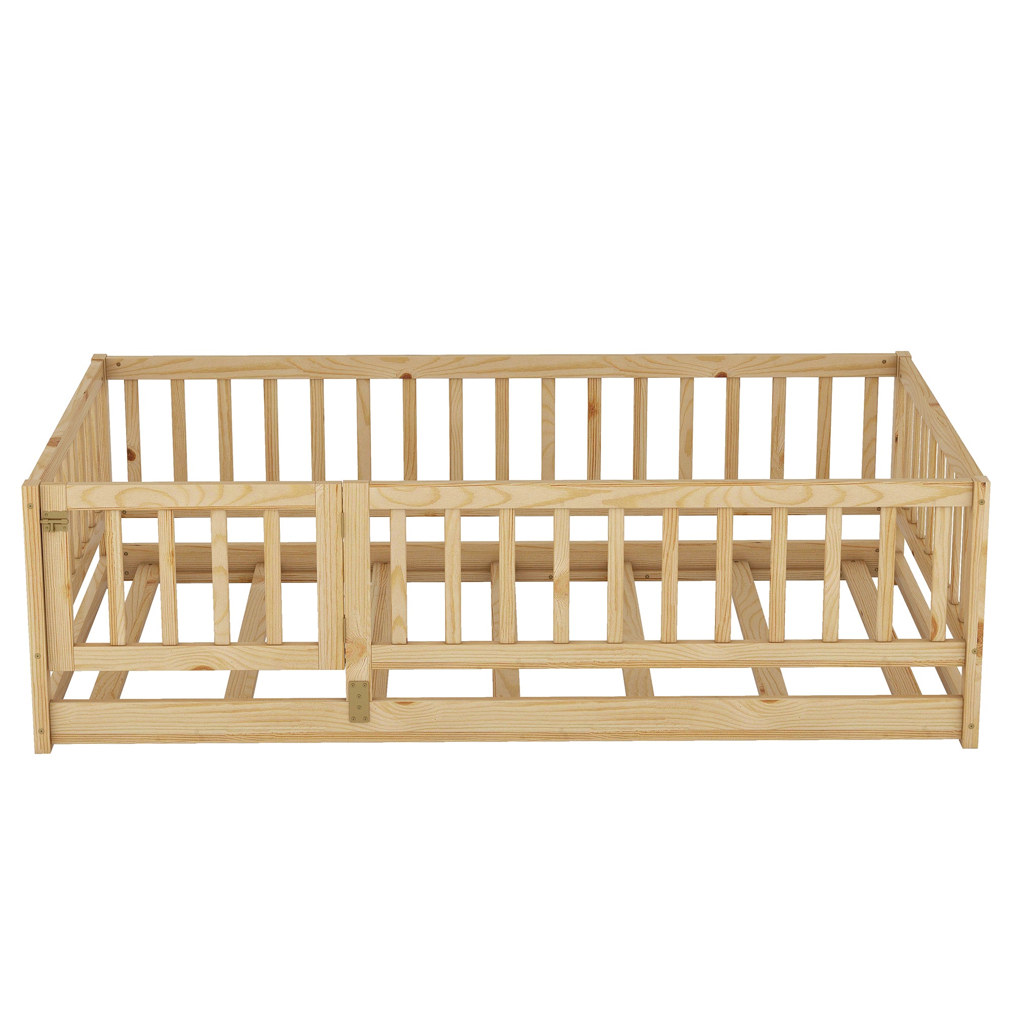 Twin Size Floor Bed with Slats, Montessori Floor Bed with Fence and Door, Kids Montessori Bed Twin Size, Wood Montessori Floor Bed for Kids, Girls, Boys,Oak.