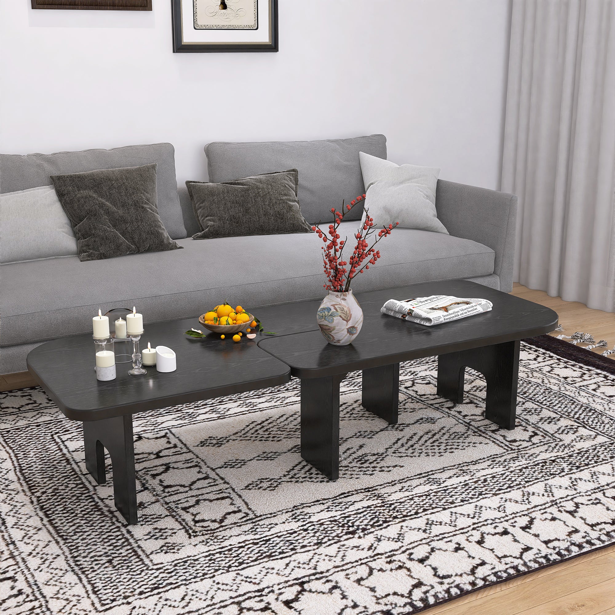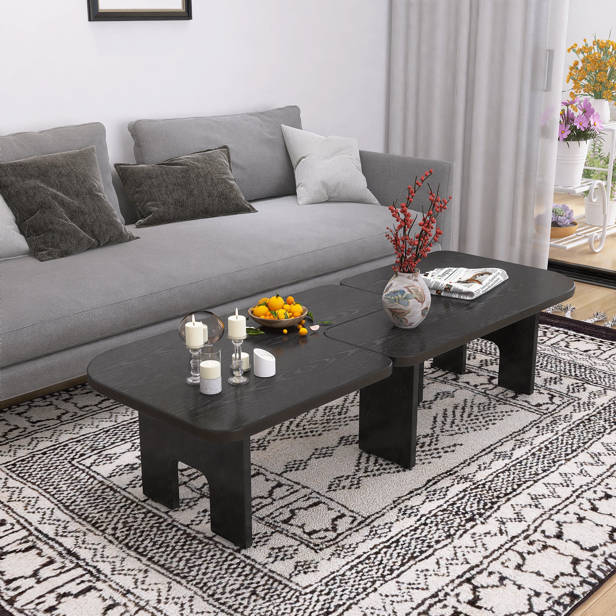 Elevate your living space with our Modern Black Wooden Nesting Coffee Table Set. This innovative center table features a massive 70.86-inch maximum extendable length, allowing for a "cloud-like" transition between a compact footprint and a grand display surface.1 Engineered with a unique splicing design, this set offers a sophisticated, monochromatic look that serves as a high-end anchor for contemporary living rooms, apartments, and luxury offices.2