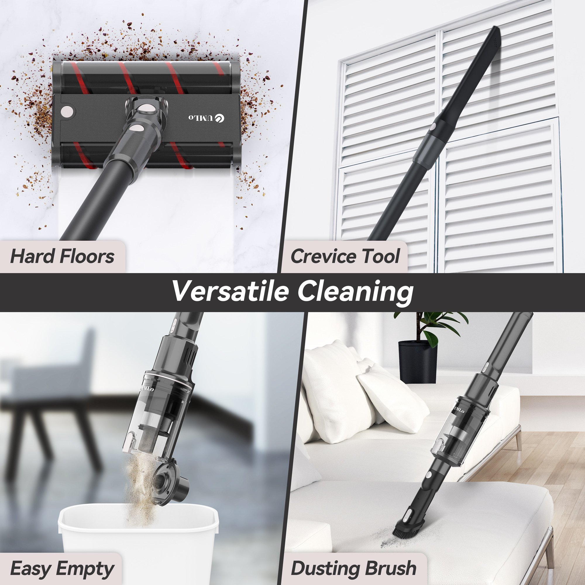 - [Dual Roller Vacuum Cleaner & Lightweight and Compact] The V100 electric vacuum cleaner, although cordless, boasts improved battery performance, allowing for up to 40 minutes of continuous operation and powerful suction. With a high suction power of 22Kpa and a W-shaped brush head that rotates in two directions, it concentrates even the smallest debris and sucks it all in.
