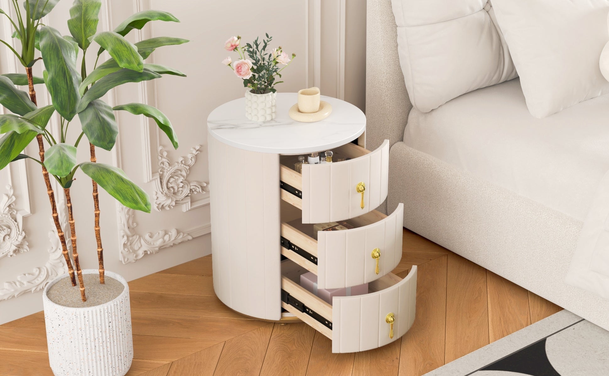 - Elegant Upholstered Nightstand: Wrapped in soft, textured fabric, this nightstand adds a touch of luxury and warmth to any bedroom. Its rounded edges and sleek profile make it the perfect blend of comfort and modern style.