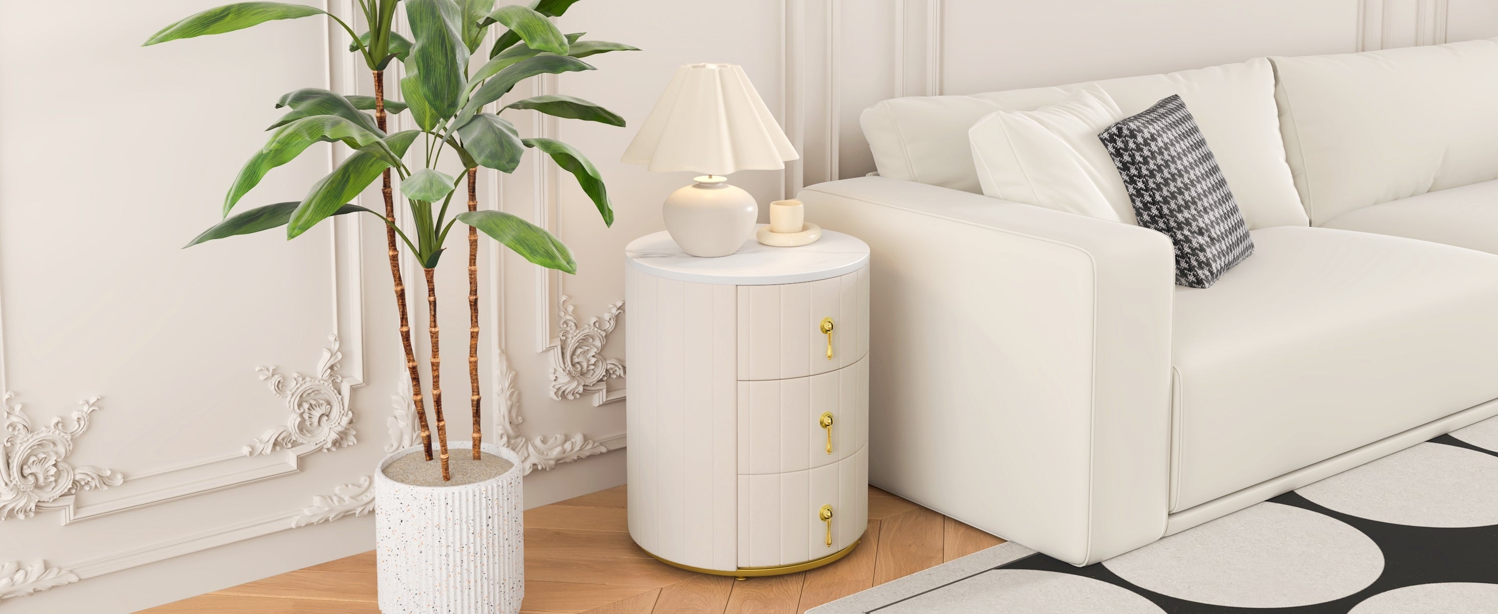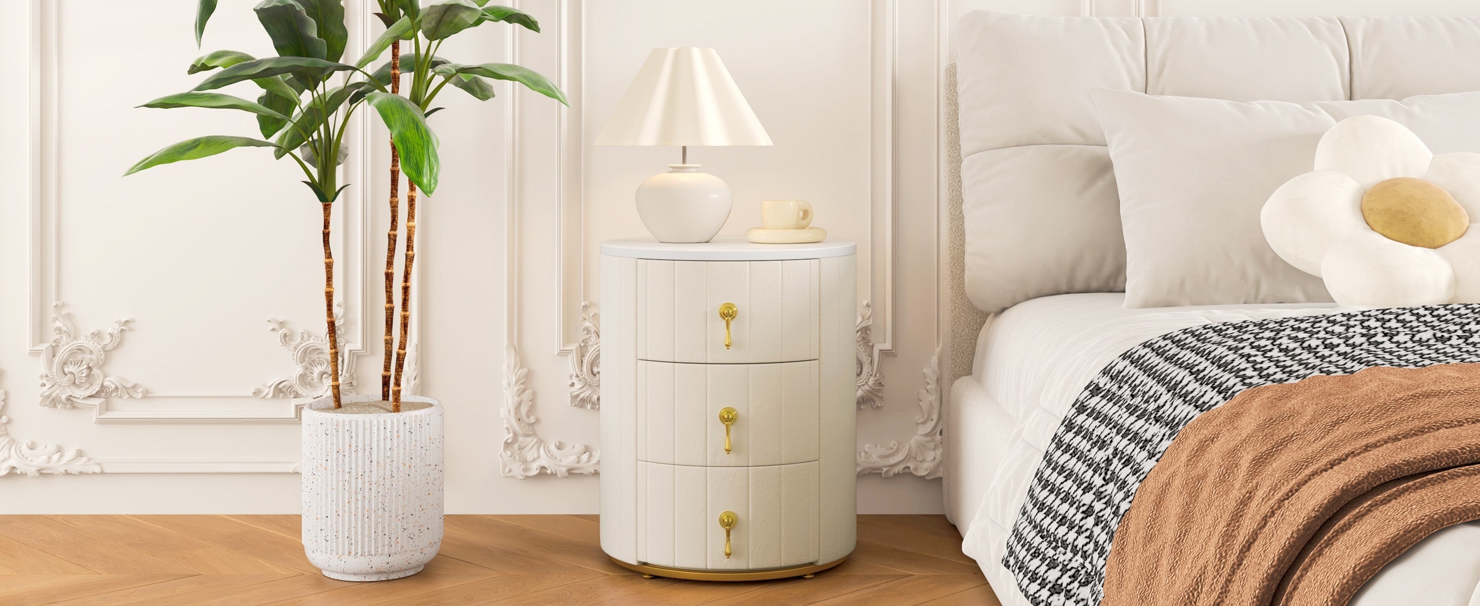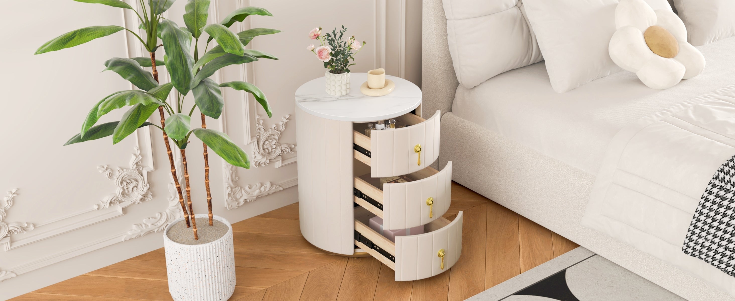 - Durable Metal Handles: Equipped with sturdy, gold-tone metal handles (easy to attach), the drawers are not only practical but also elevate the nightstand's overall look with a modern metallic flair.