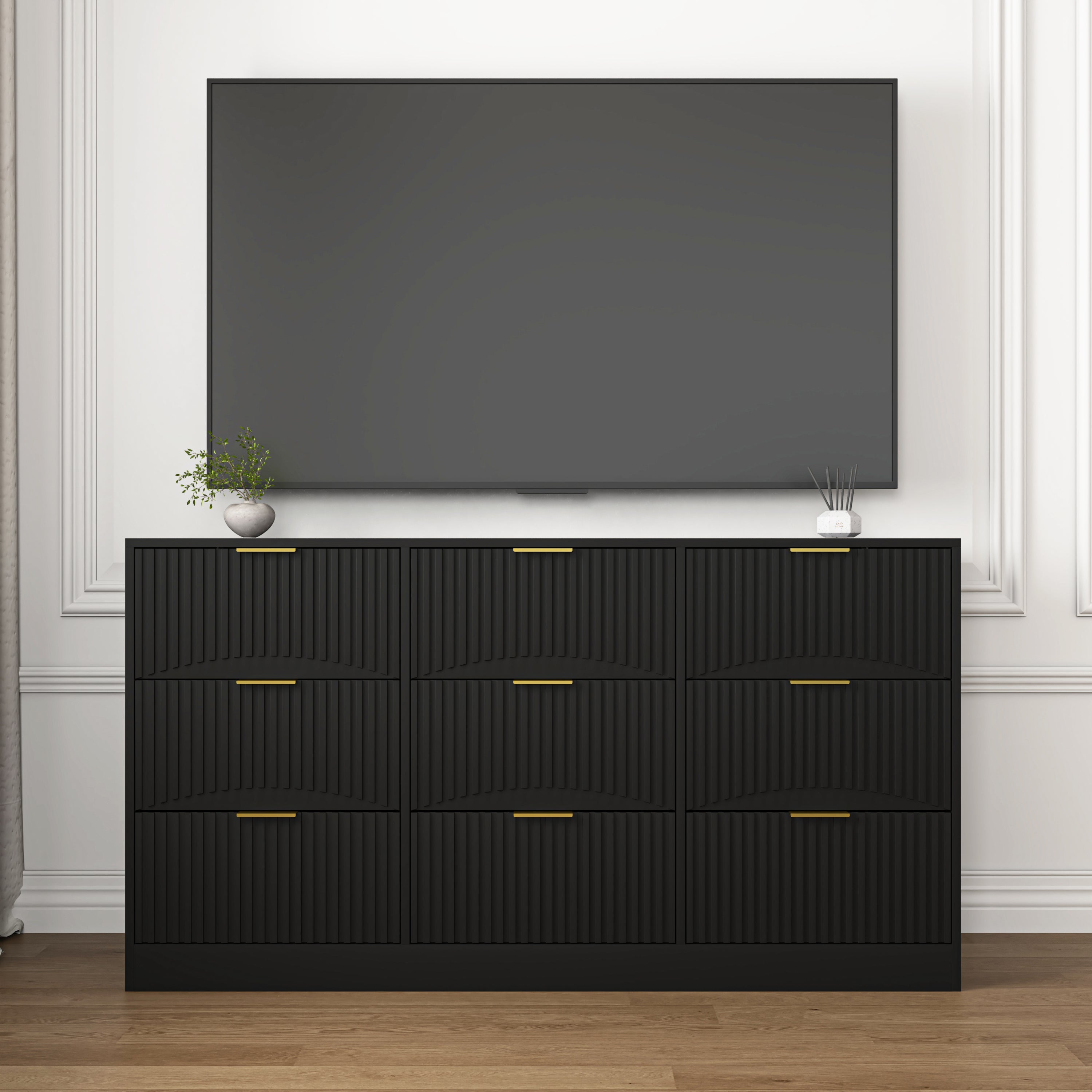 • Modern 9 Drawer Dressers: This large black chest of drawers with golden handles has a classic, simple design fit well in any decor style, creating a spacious and versatile look for your room