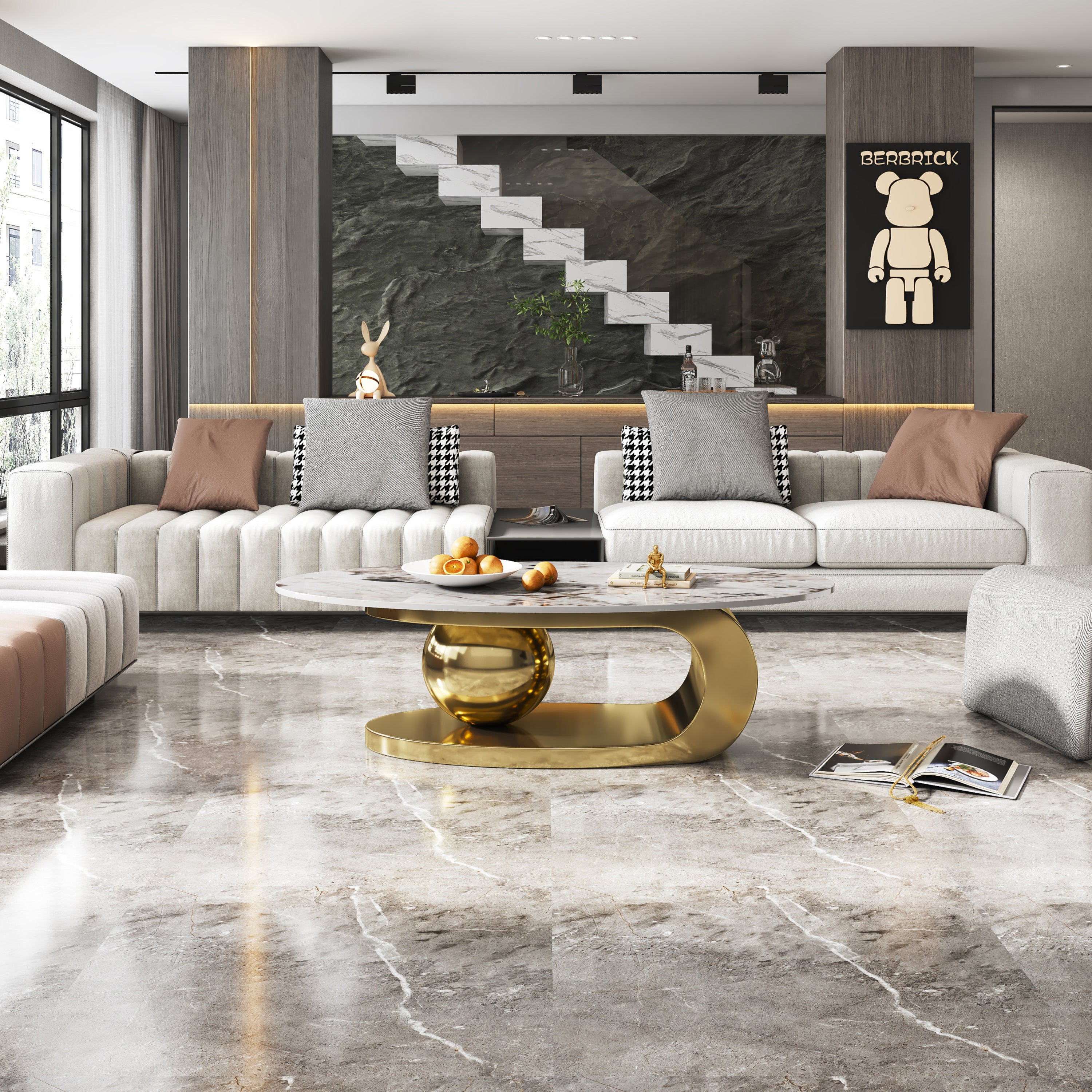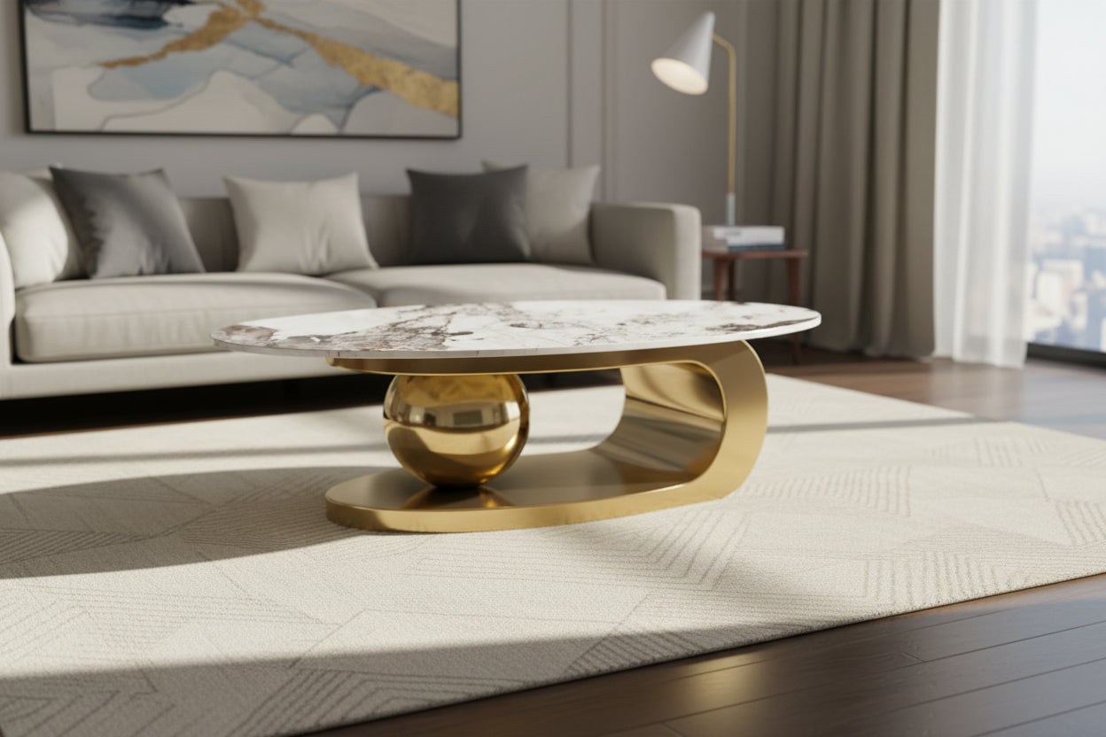 Elevate your living room with our 49.2-Inch Oval Faux Marble Coffee Table. This centerpiece masterfully blends the opulent look of a smooth marble surface with the sleek, industrial strength of a high-polished stainless steel base. Designed to provide a "cloud-like" flow to your interior, the elongated oval silhouette eliminates sharp corners, making it a safe and sophisticated choice for modern family homes.