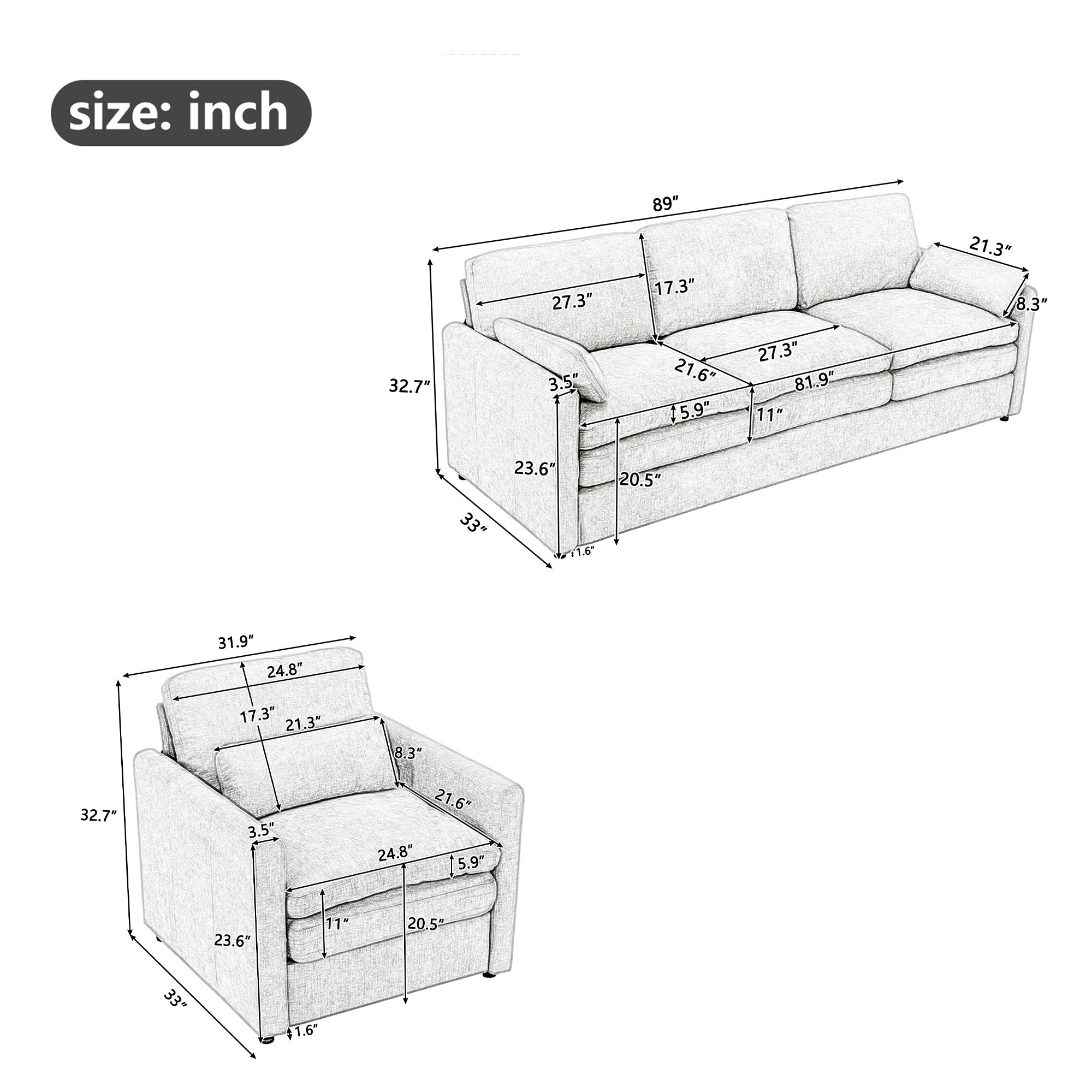 | 3-seat Sofa(in.) | 89*33*32.7 |