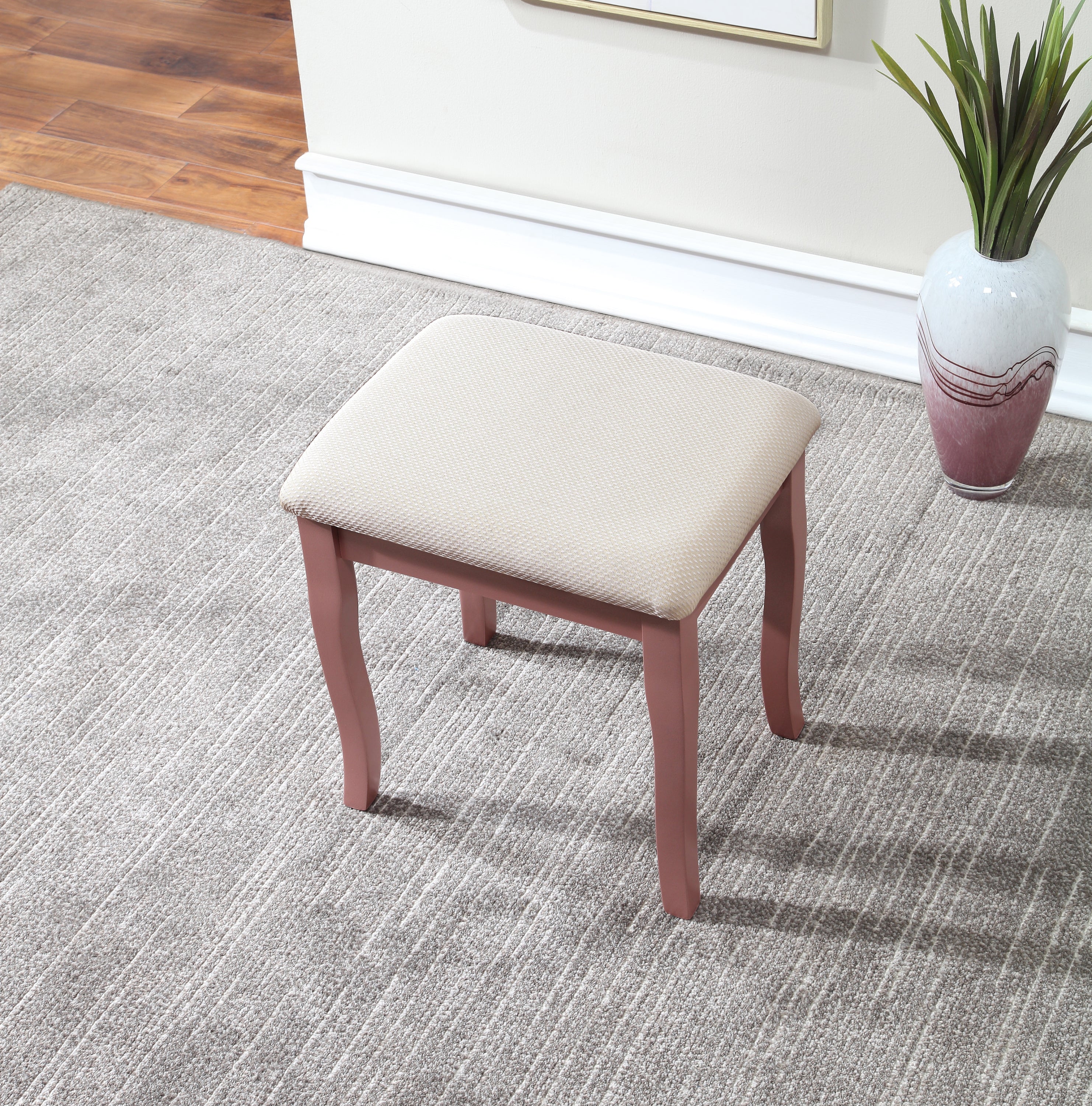 - Durable wood construction with a rose gold finish. Set includes vanity, mirror, and bench