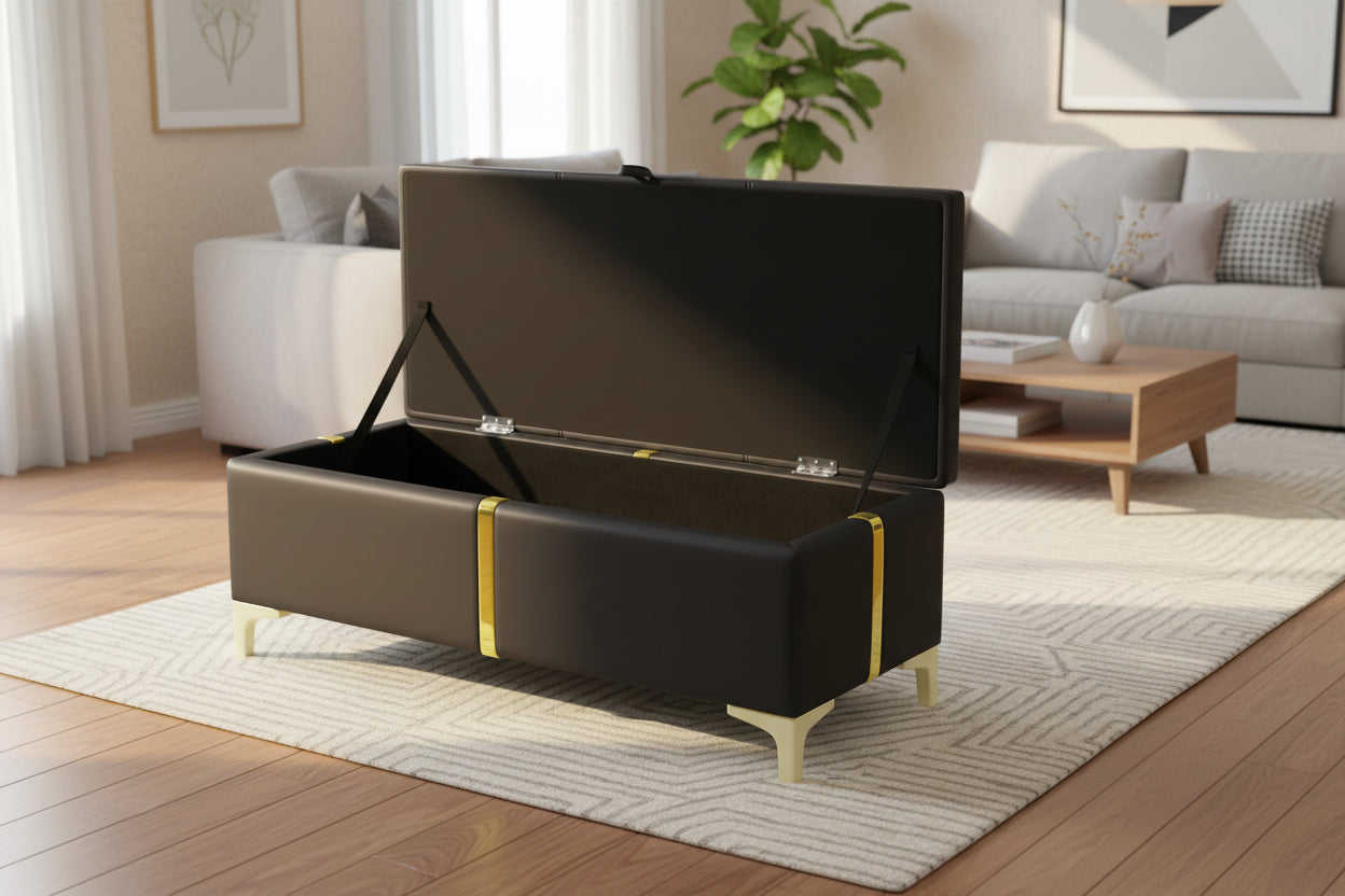 | Storage Ottoman | Hinged Top + Metal Support Legs | Plywood + Foam + Fabric | Midnight Black |