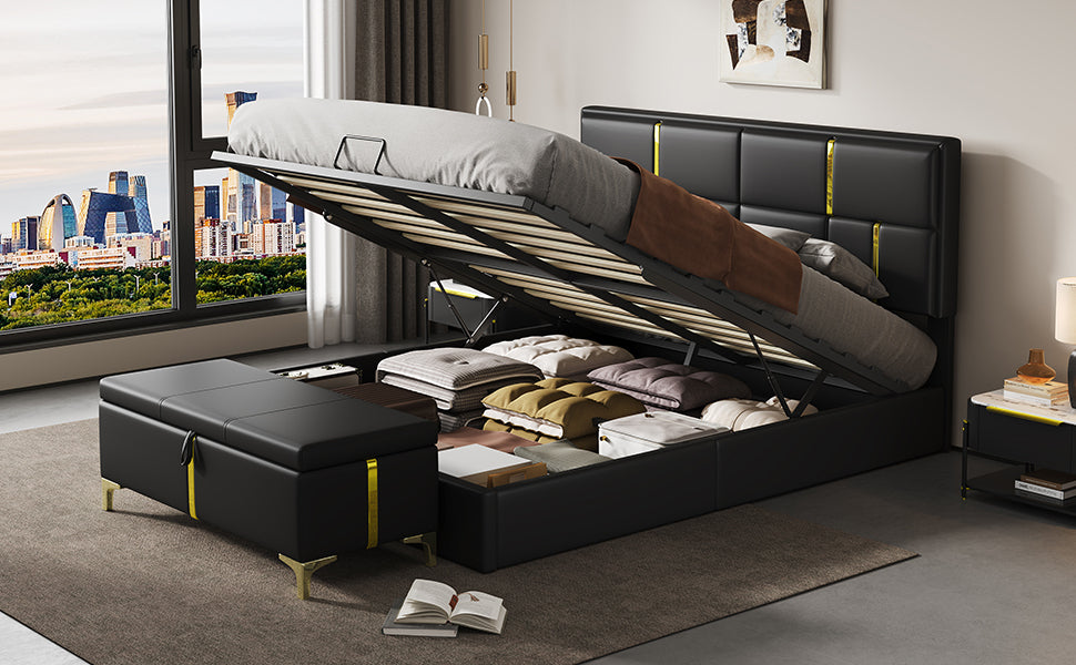 Black Queen Upholstered Platform Bed with Hydraulic Storage & Matching Ottoman - 2-Piece Set