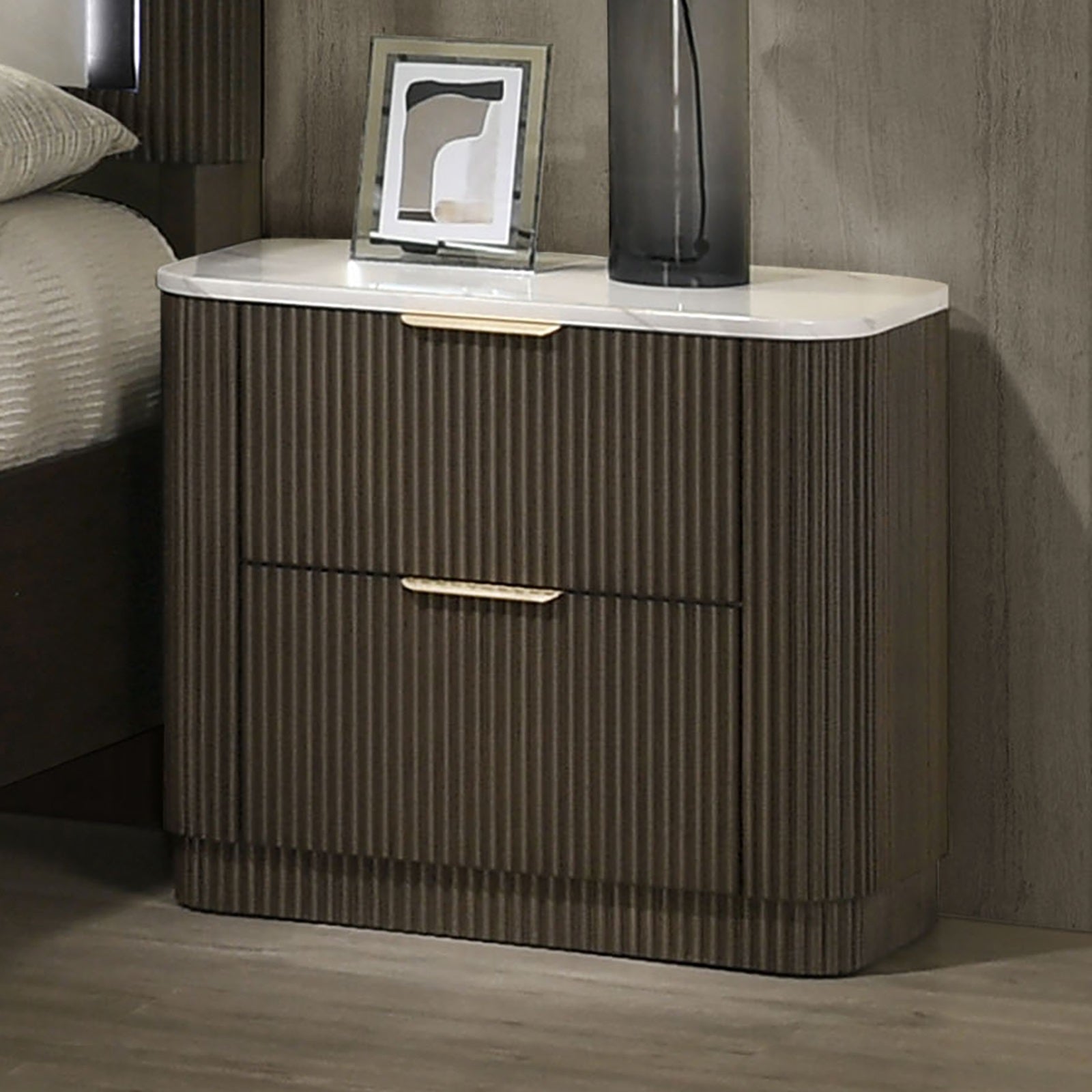 Elevate your sleeping sanctuary with this Contemporary Dark Walnut Nightstand, a perfect fusion of organic warmth and high-end luxury. Featuring a stunning white marble-style top contrasted against a rich dark walnut finish, this piece serves as a sophisticated focal point for any modern or transitional bedroom. The sturdy reeded plinth base provides exceptional stability while adding a unique architectural detail that sets this furniture apart from standard bedside tables.