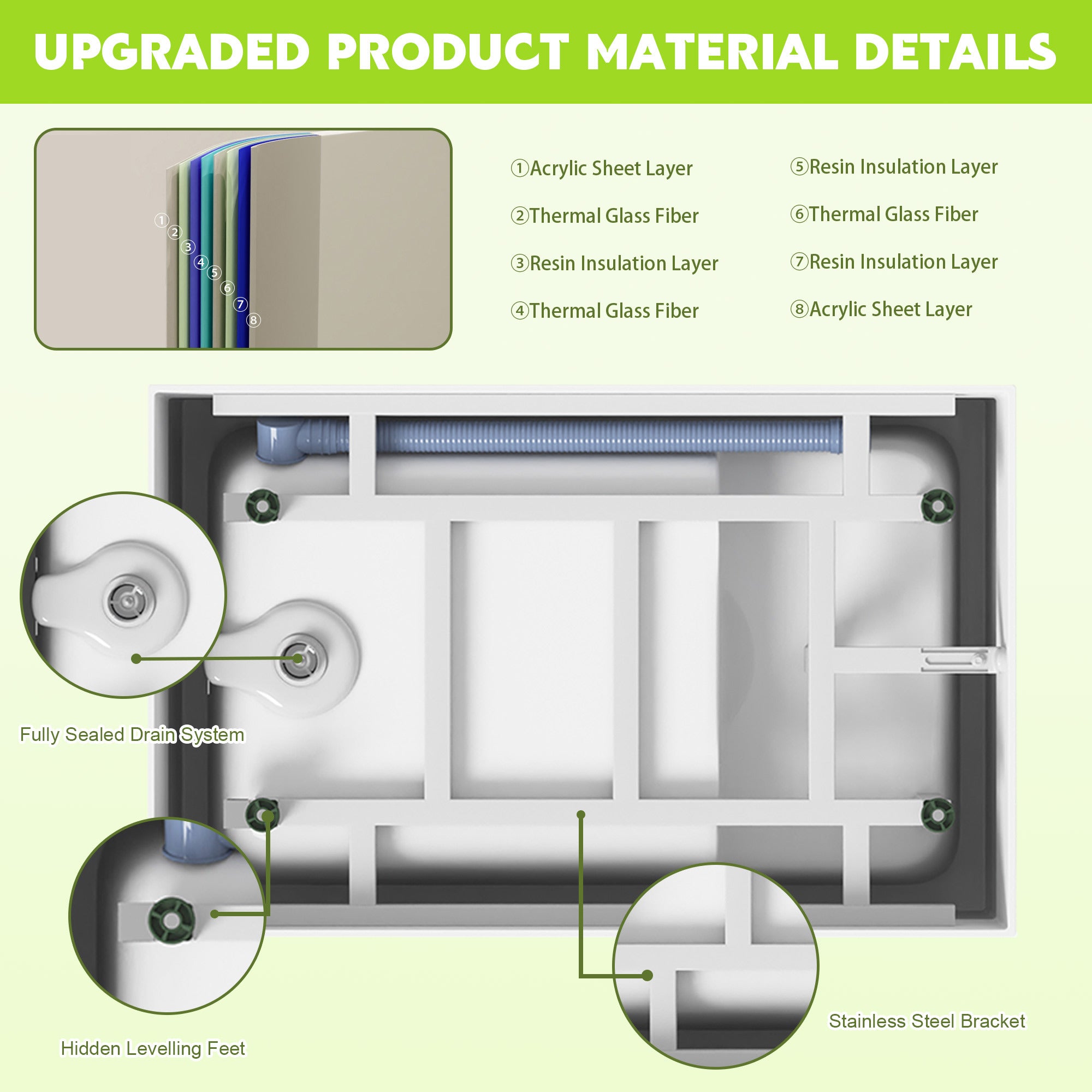 High-Gloss Pure Acrylic: Features a 8-layer reinforced coating that is scratch-resistant and stain-proof, ensuring a "pristine" look and superior heat retention for longer baths.