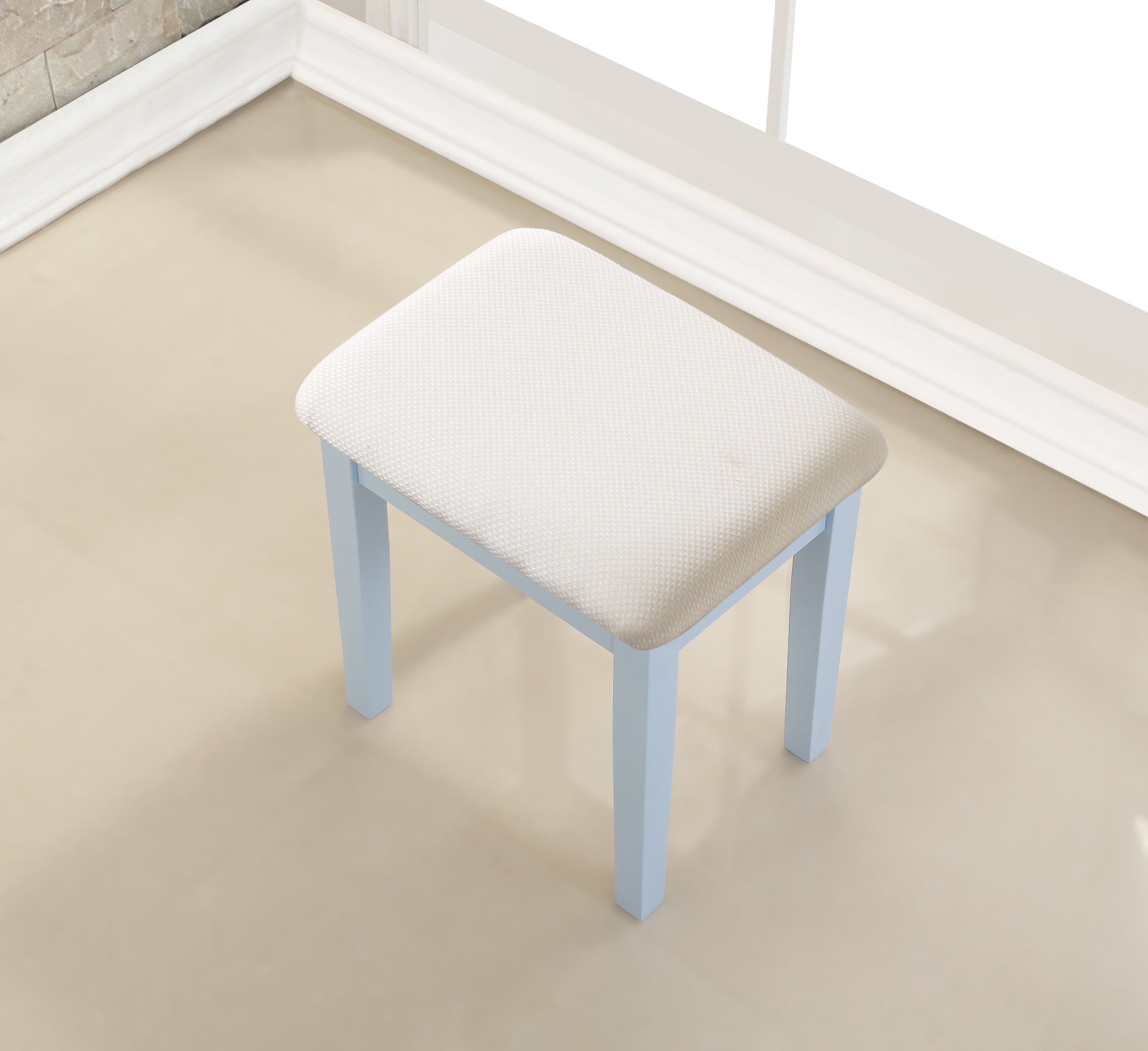 [COMFORTABLE CUSHIONED STOOL] Includes a matching wooden stool with a high-density foam padded seat, upholstered in a neutral fabric that complements the bold blue finish.