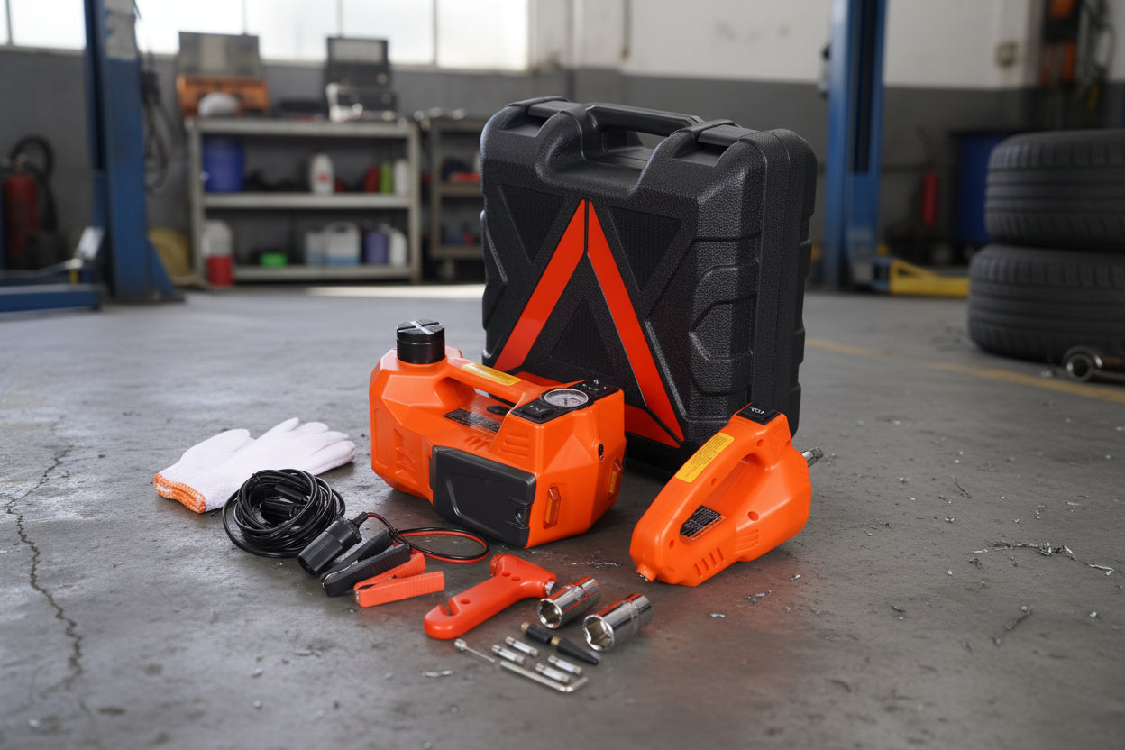[COMPLETE ROADSIDE SET] Includes the electric jack, impact wrench, battery clamps, 13ft power cable, spare fuses, and protective gloves—all in a heavy-duty organized case.