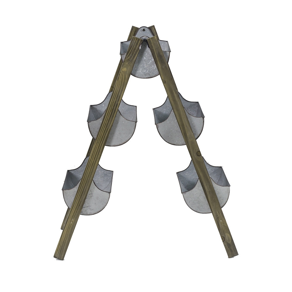 - The five galvanized buckets hang from the ladder-style wood frame.