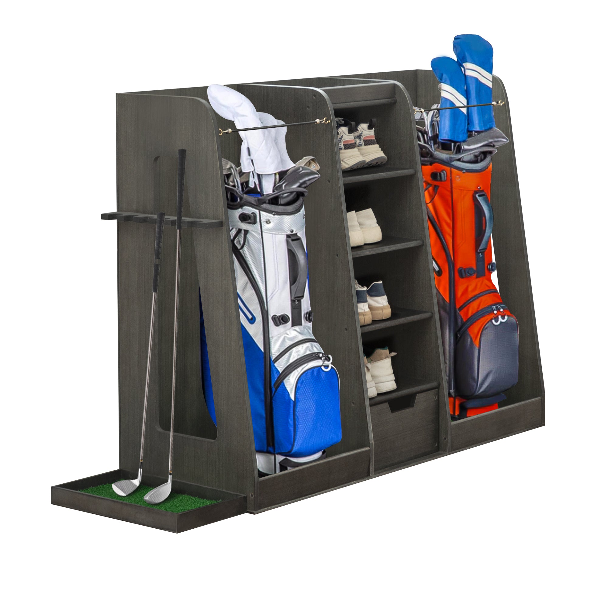 55.5"x16"x37" Wooden Golf Bag Organizer – 2-Bag Rack with Drawers, Side Club Holders & Easy Assembly, Gray