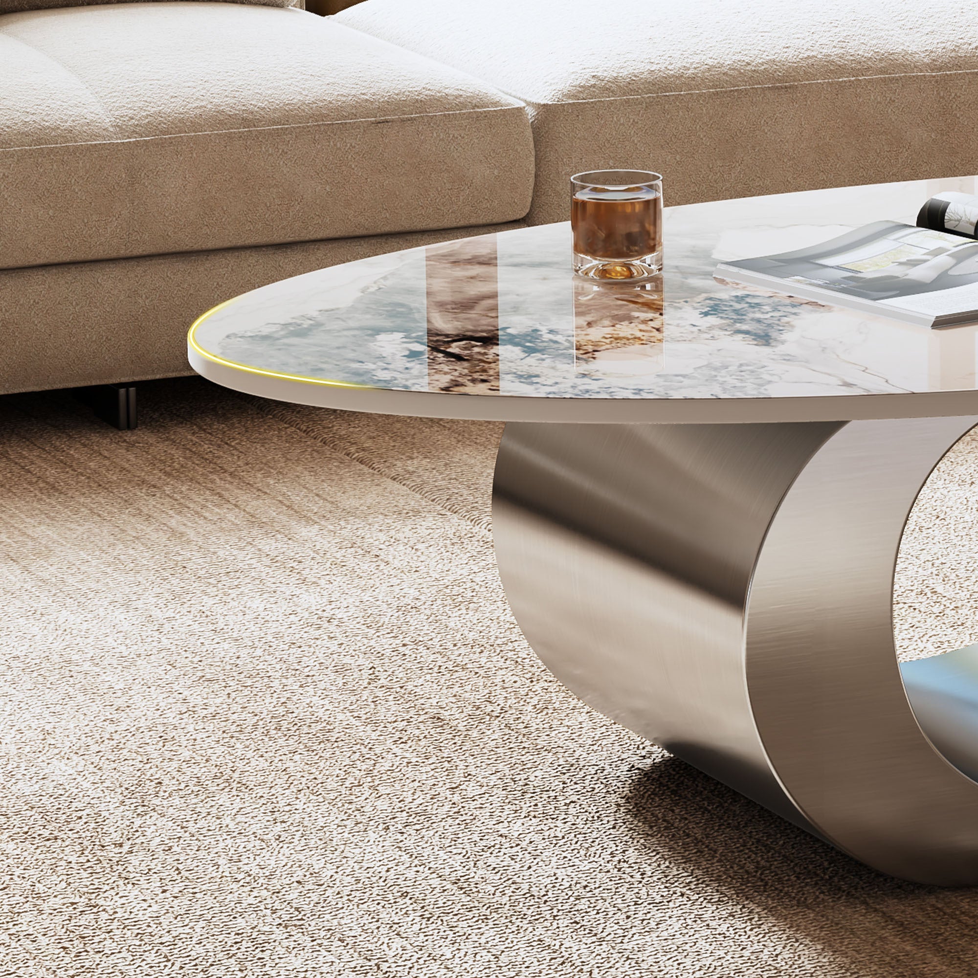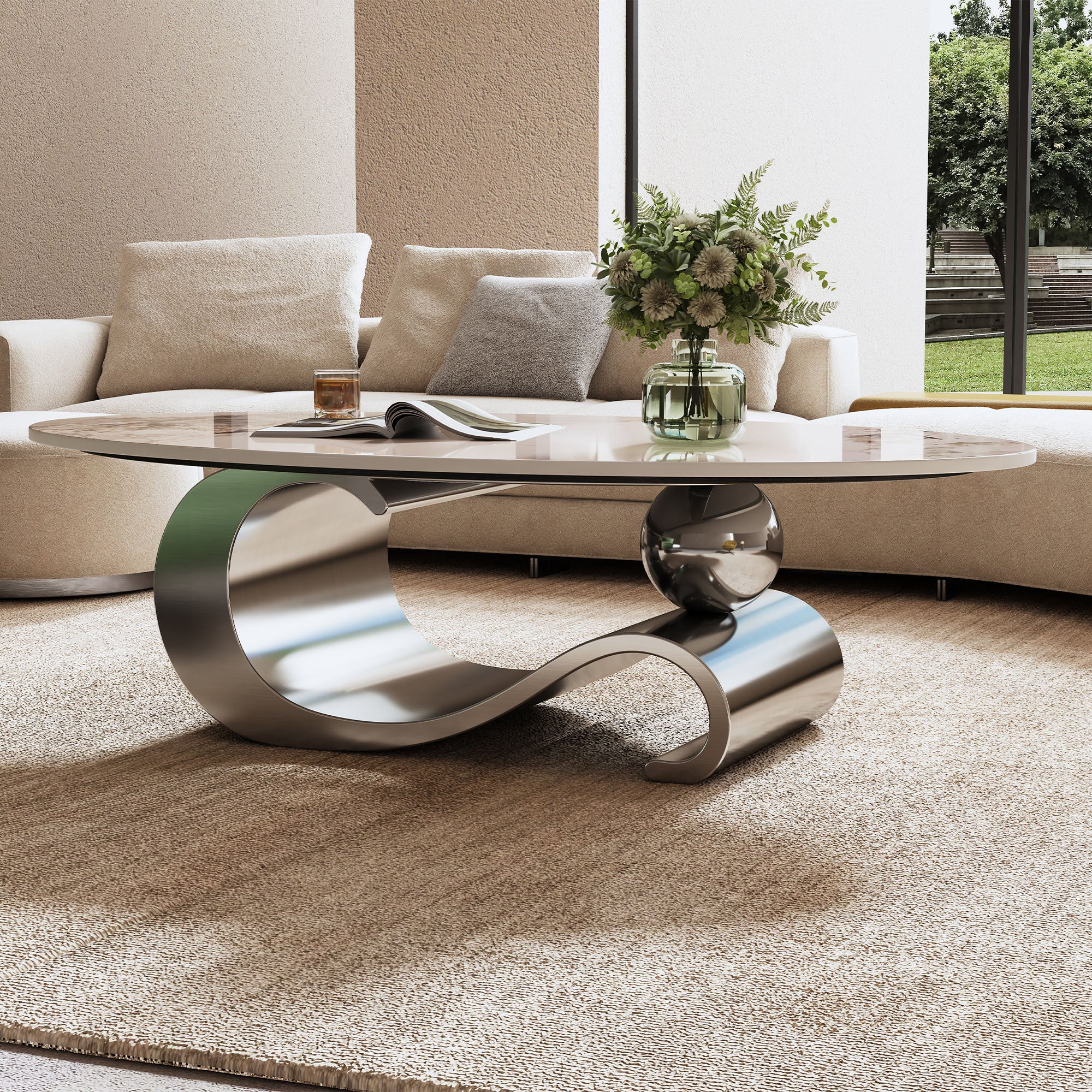 Add a touch of modern luxury to your living room with this stunning oval faux marble coffee table. Featuring a novel-pattern sintered stone top and a unique gold stainless steel sculptural base, it offers both durability and high-end design. Ideal for contemporary homes seeking an elegant centerpiece that is easy to clean and built to last. Perfect for living rooms over 15㎡, and pairs best with sofas of seat height 17–19 inches.