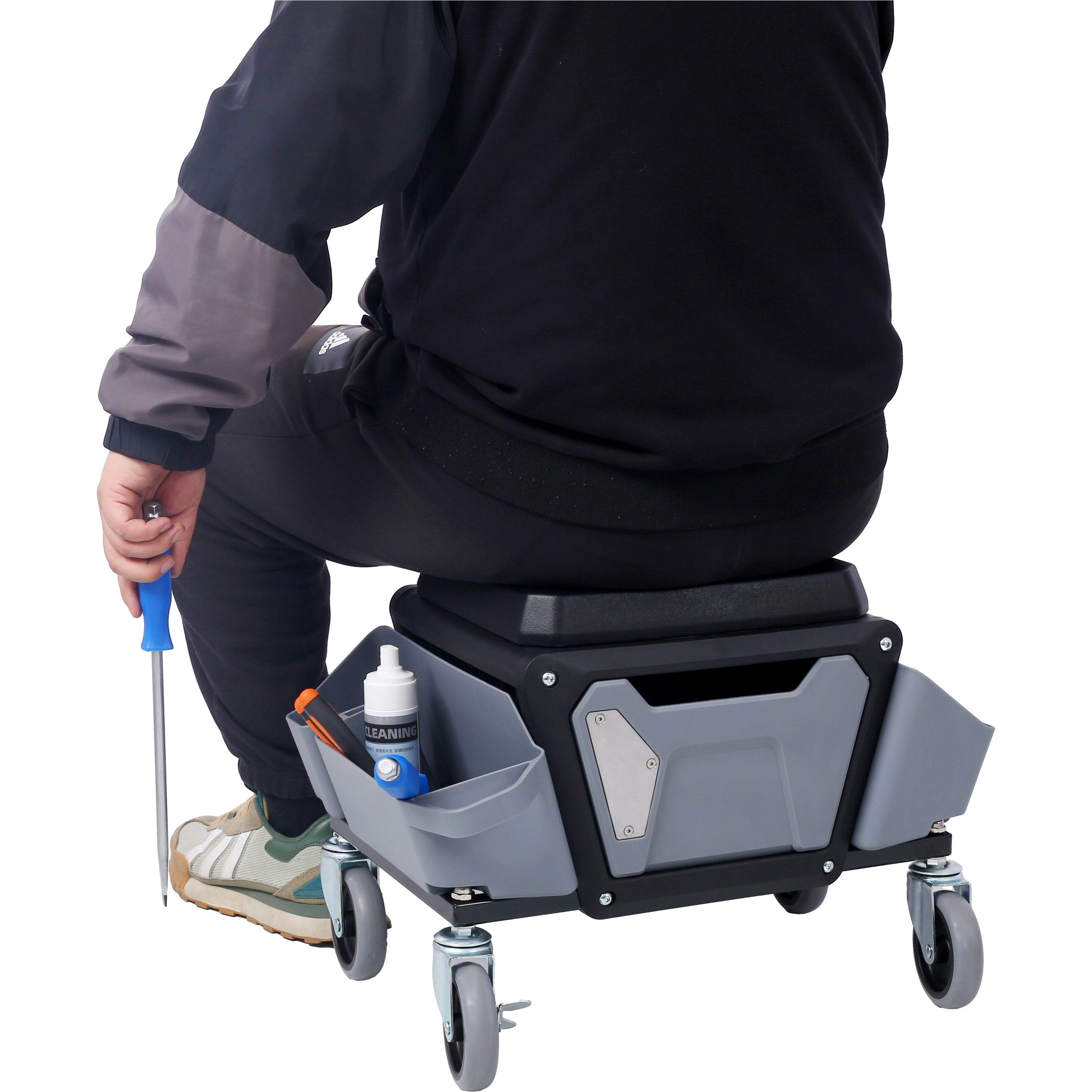 • Create More Storage Space: The garage stool features 2 removable trays and a drawer, you can store tools, cans, rags, beverages, and other car care and repair essentials, ensuring safety and ease of use for your garage or workshop tasks. Our Heavy-Duty Rolling Work Seat features a metal plate secured to the drawer panel. Place a magnetic flashlight on the front. Get the light you need to get your work done in those dark areas.