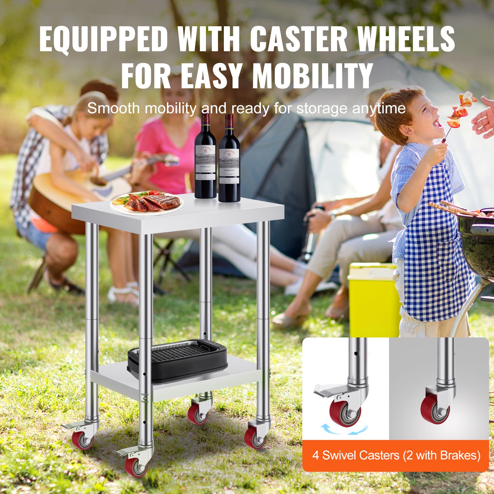 • Stable and Durable: With an upgraded thickness of 0.8mm, this table is sturdy and durable. The upper shelf supports up to 400 lbs, while the lower shelf supports up to 300 lbs, providing ample storage for your supplies and allowing you to stack your favorite ingredients easily. Equipped with 4 swivel casters, including 2 with brakes, the table remains stable and can be easily moved to any location.