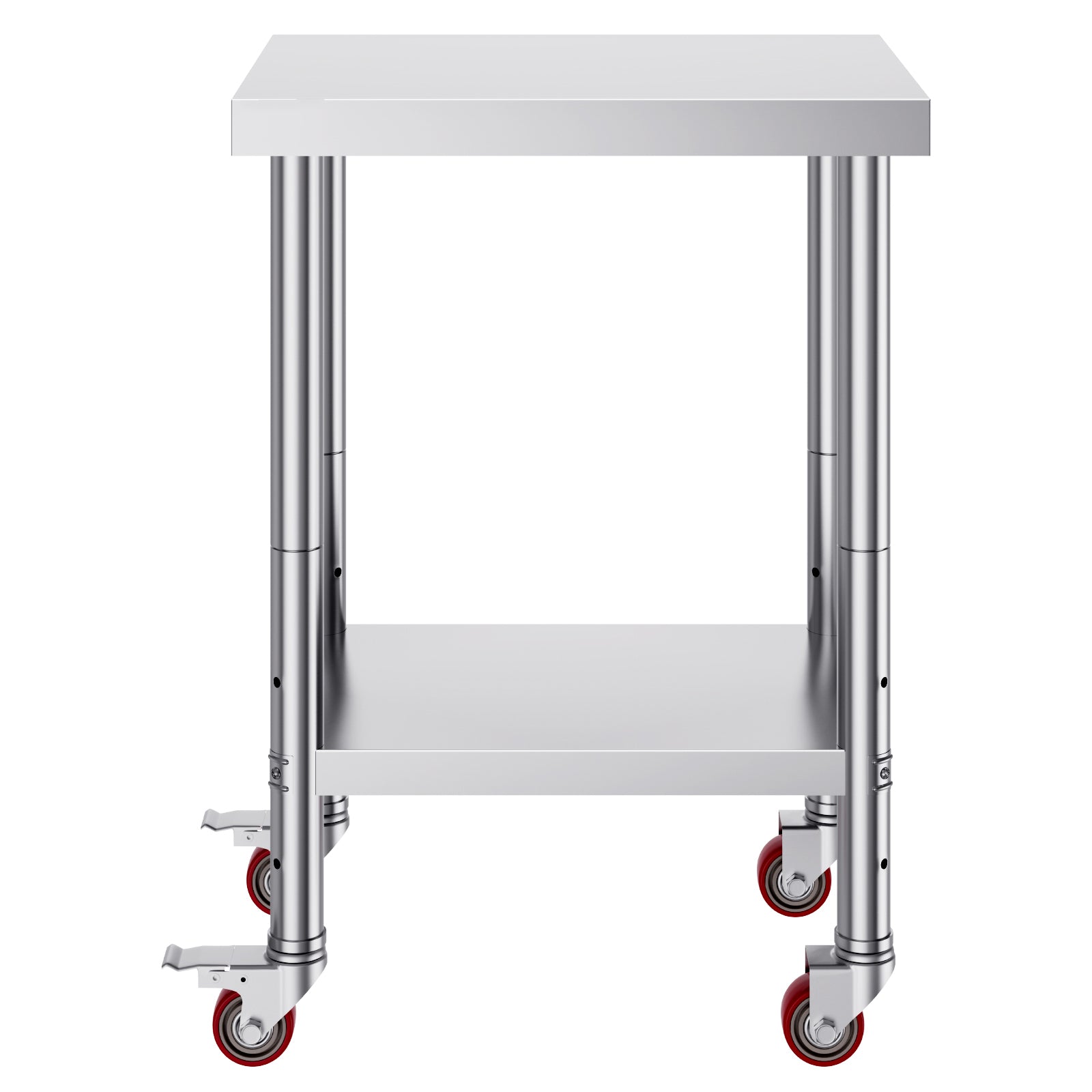 • High-Quality Stainless Steel: This work table, measuring 24 x 18 x 34 inch, is made from SUS201 stainless steel for the tabletop, shelves, and legs. It offers superior rust resistance, a sleek appearance, and a smooth surface that is easy to clean with a simple wipe. It meets strict public health standards, ensuring long-lasting protection for your health.